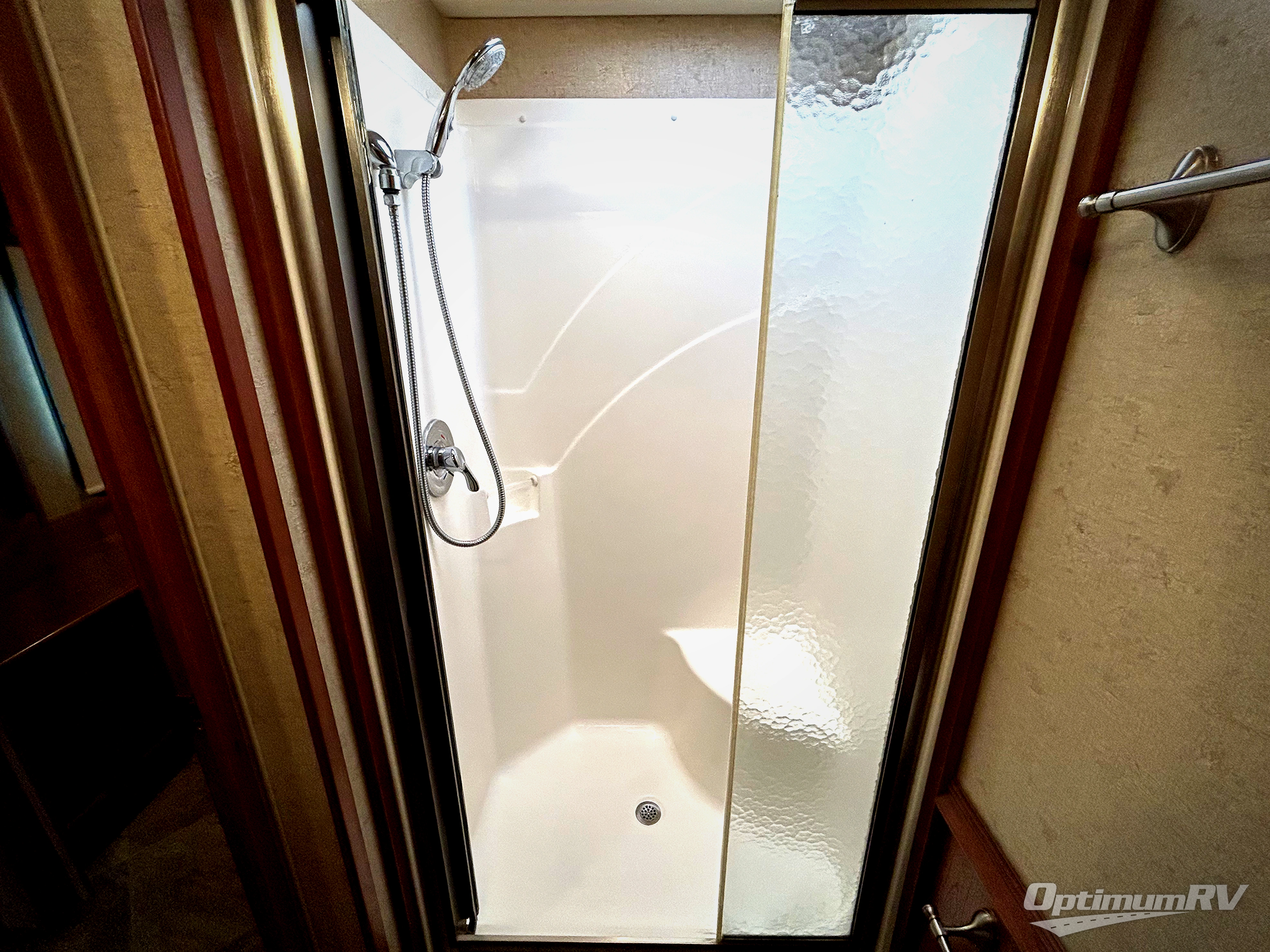 Next on the driver's side is a side aisle bath featuring a shower, toilet, and vanity with sink. Bi-fold doors are just outside the bath door so you can separate the rear bedroom from the front of the coach.