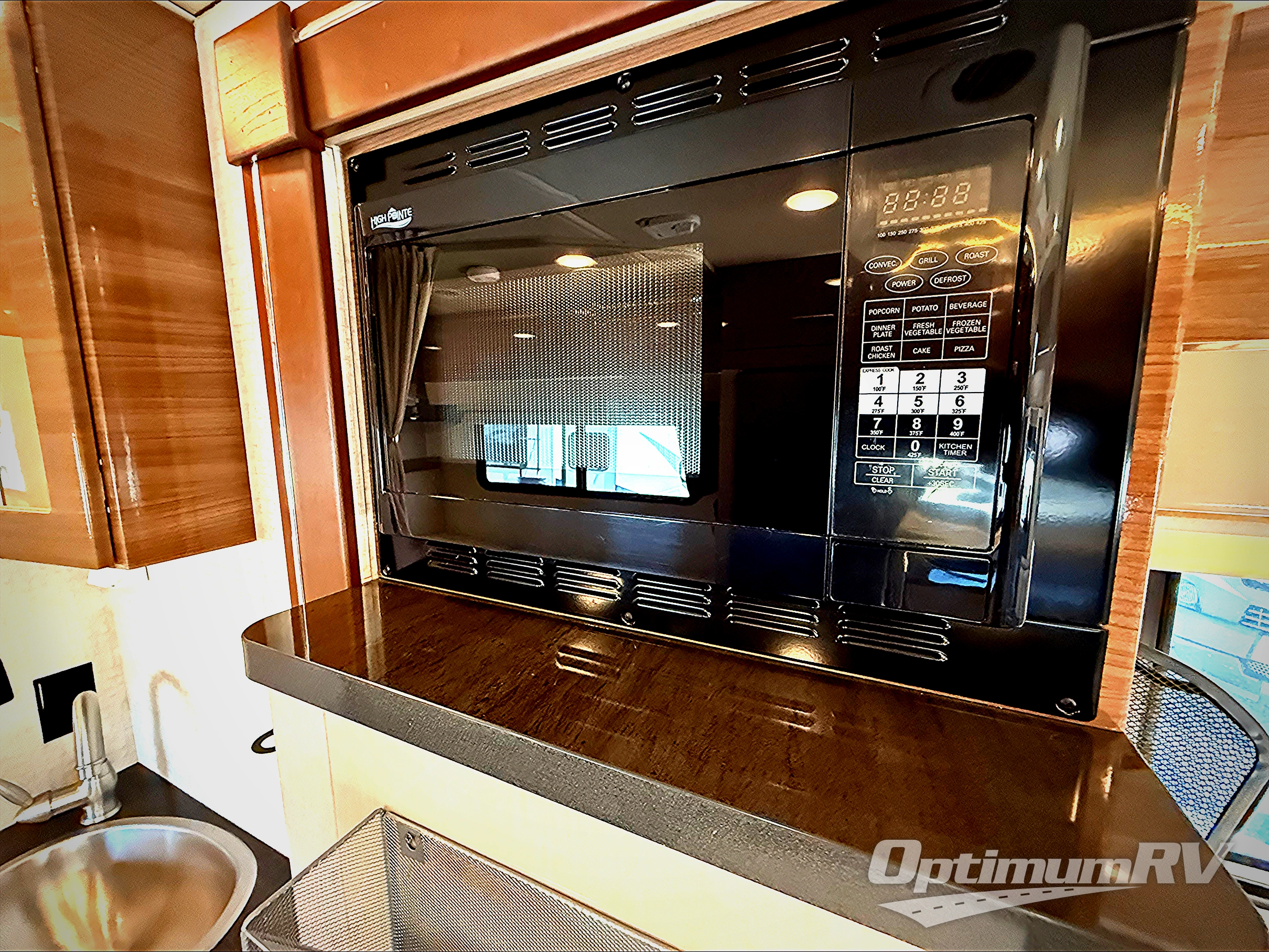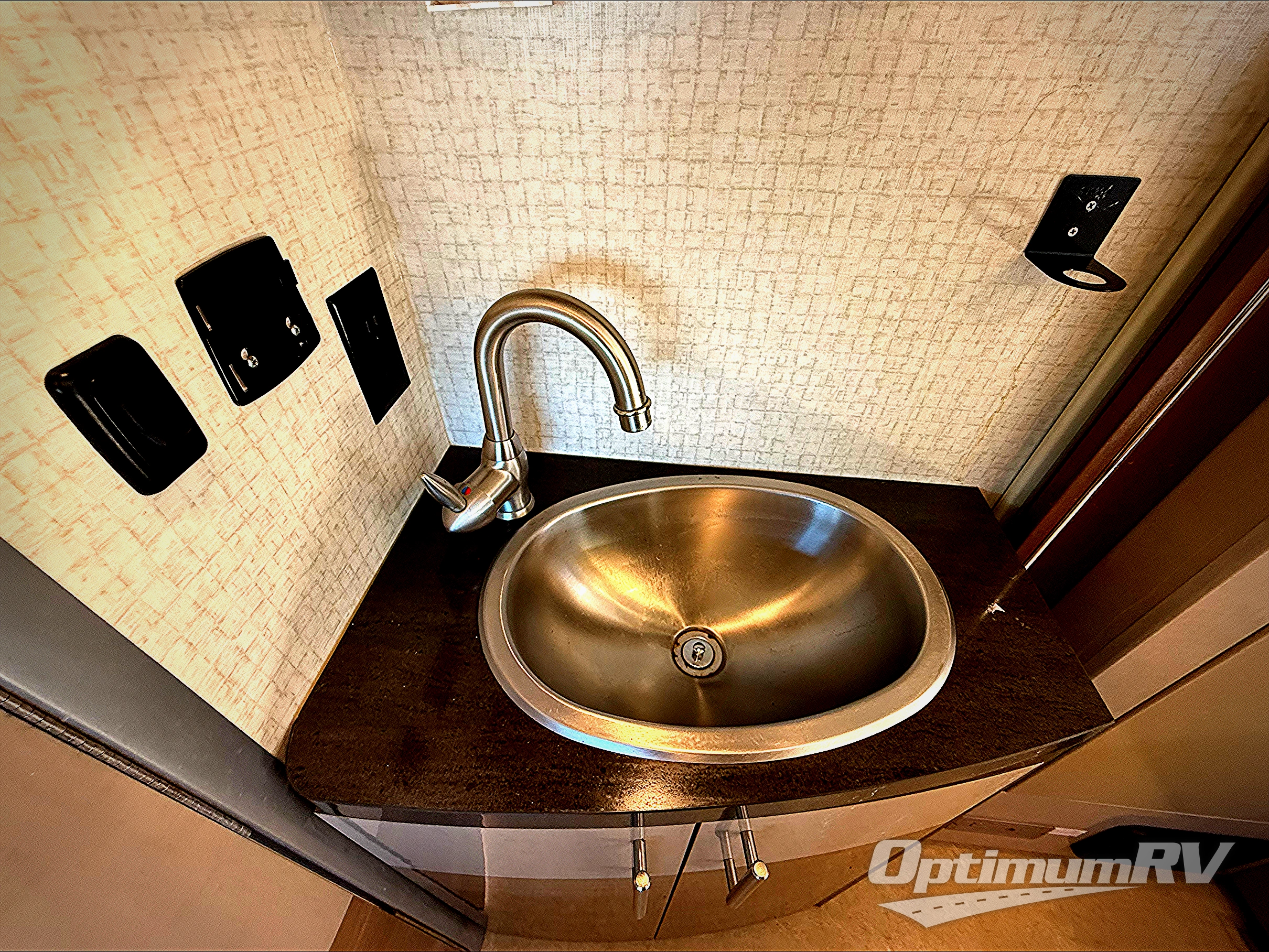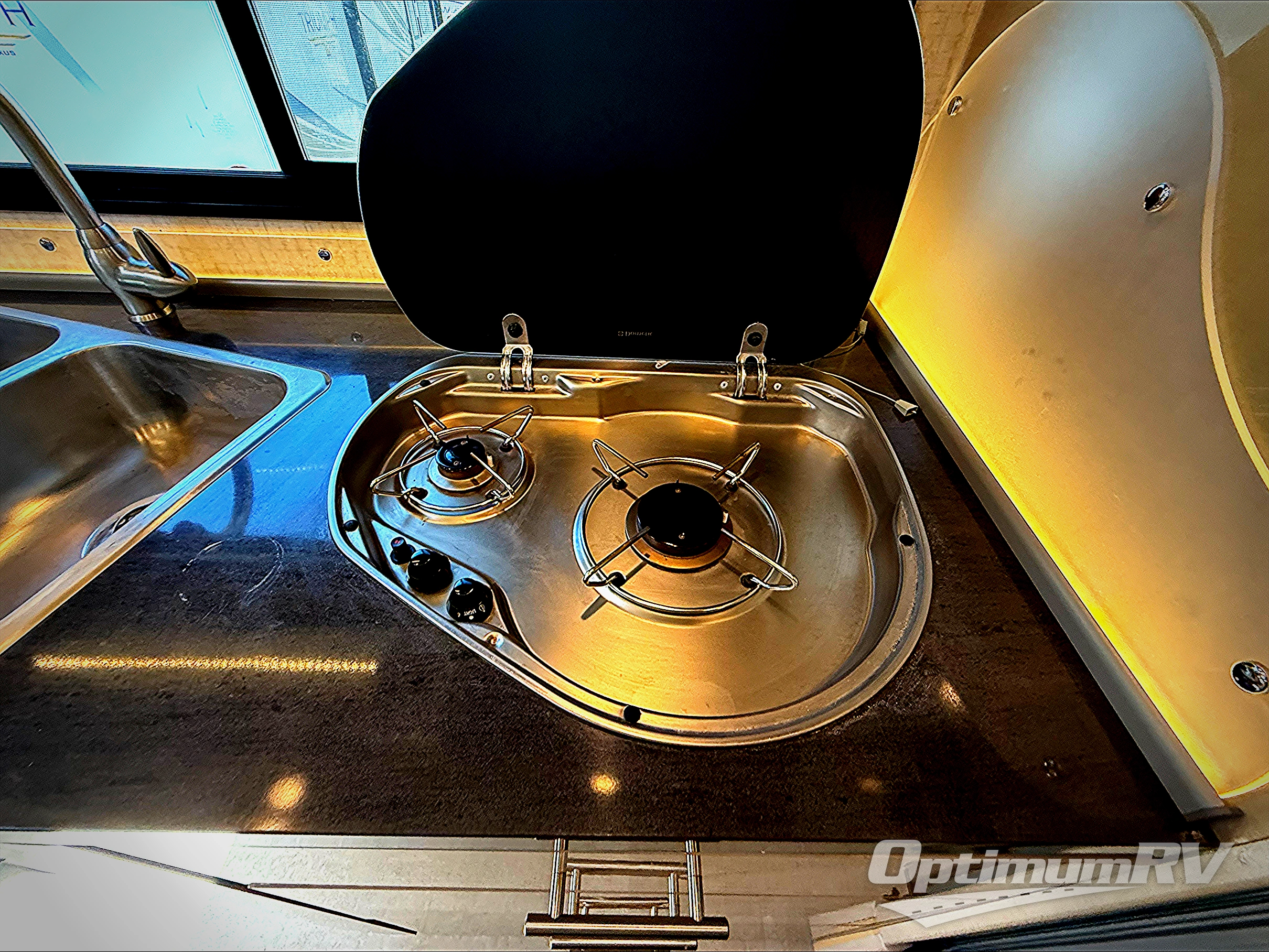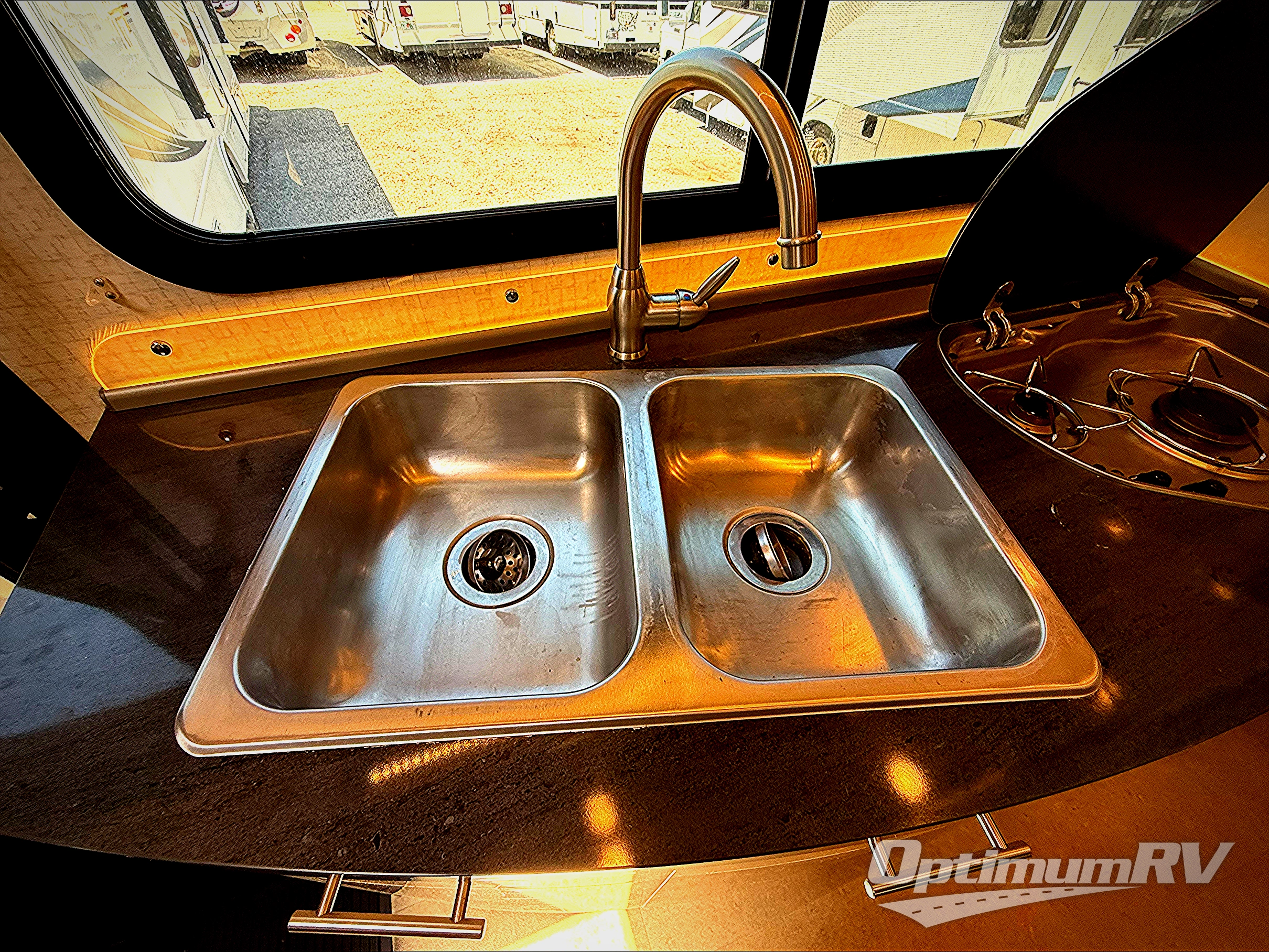 To the left of the entrance find all the kitchen amenities needed to create meals and snacks while you are on the road. There is a double sink, a two burner range top, overhead cabinets, and a refrigerator to keep your food items cold and fresh. The 28" HD TV is also located above the kitchen area which can easily be viewed from the dinette or front captains chairs.