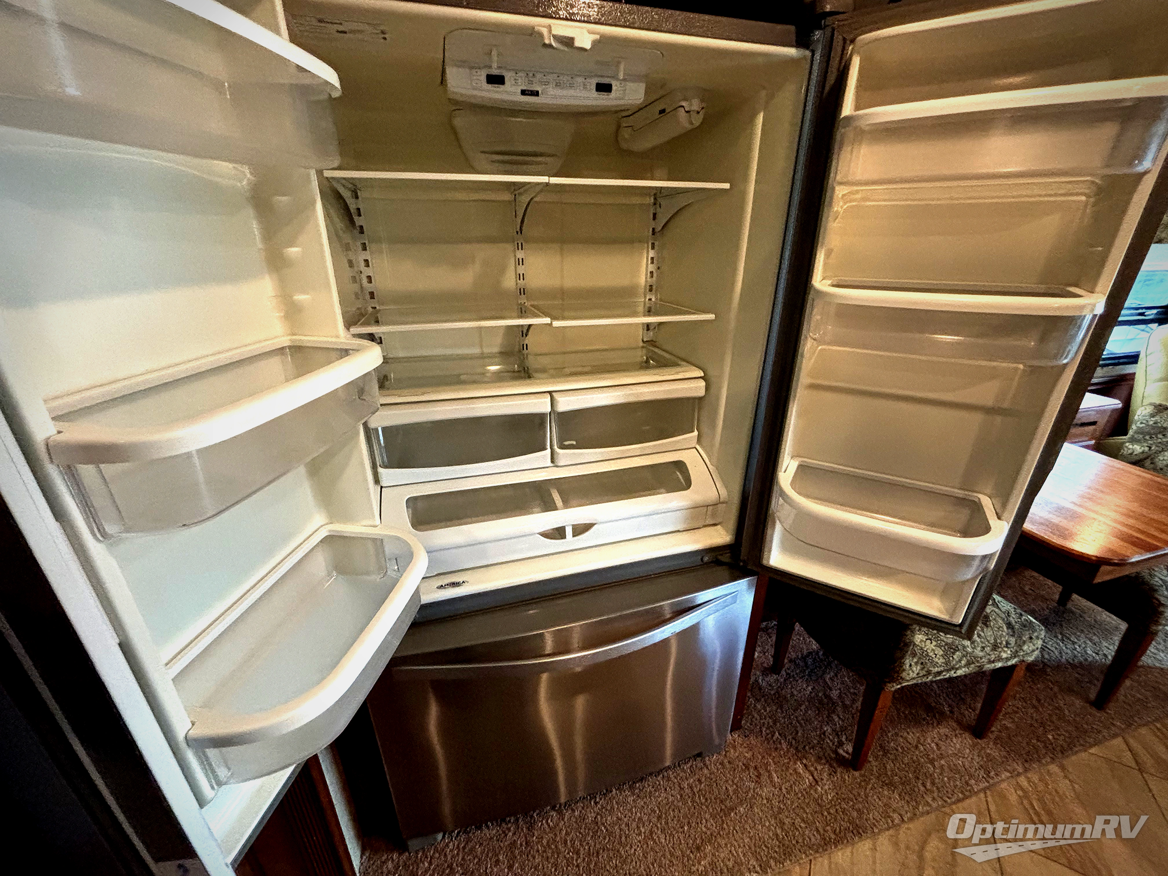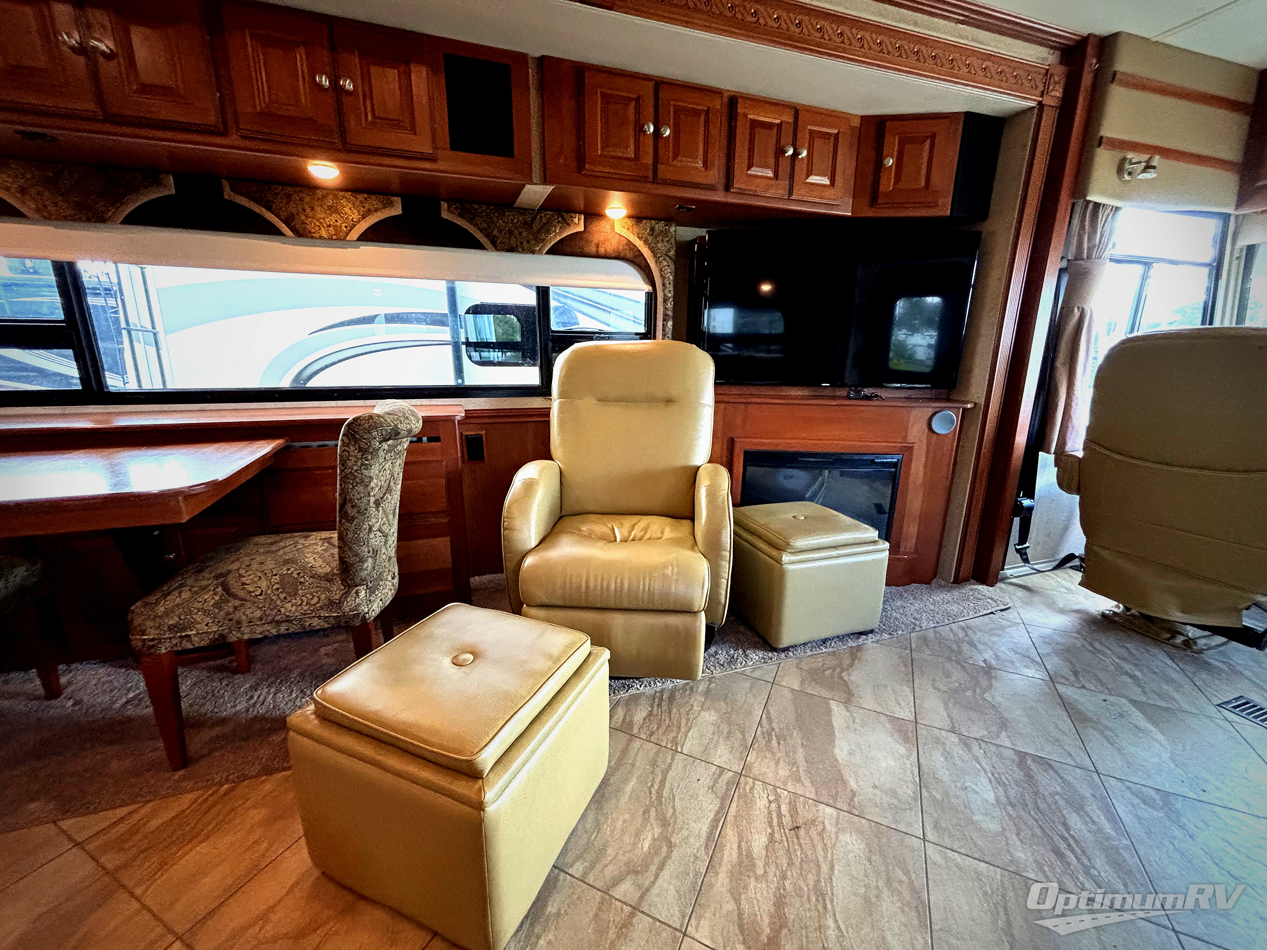 Opposite the door side find a residential refrigerator, Glide and Dine dining table with chairs, plus a buffet, Euro recliner, corner entertainment center with a HDTV location, and fireplace slide out.