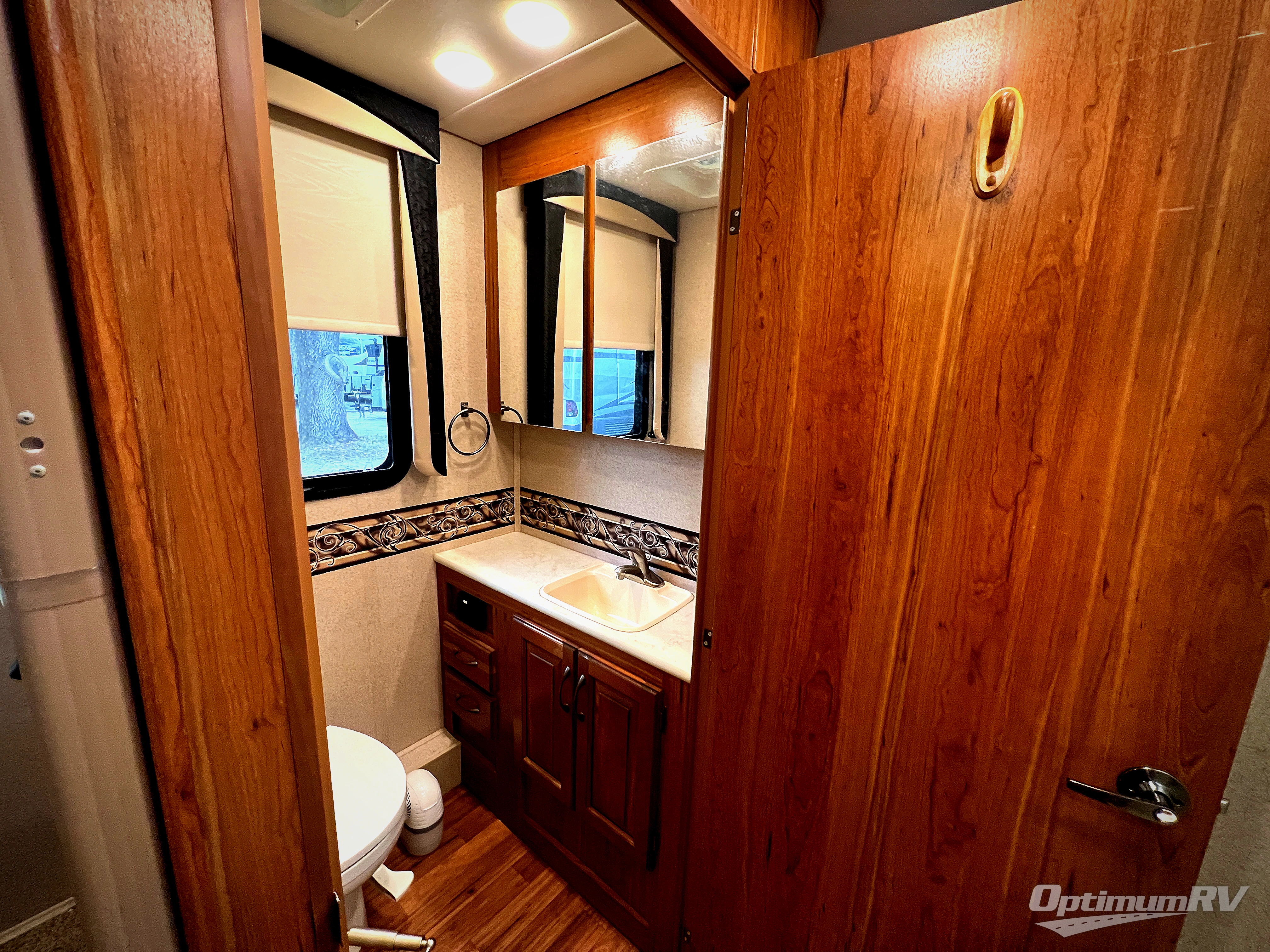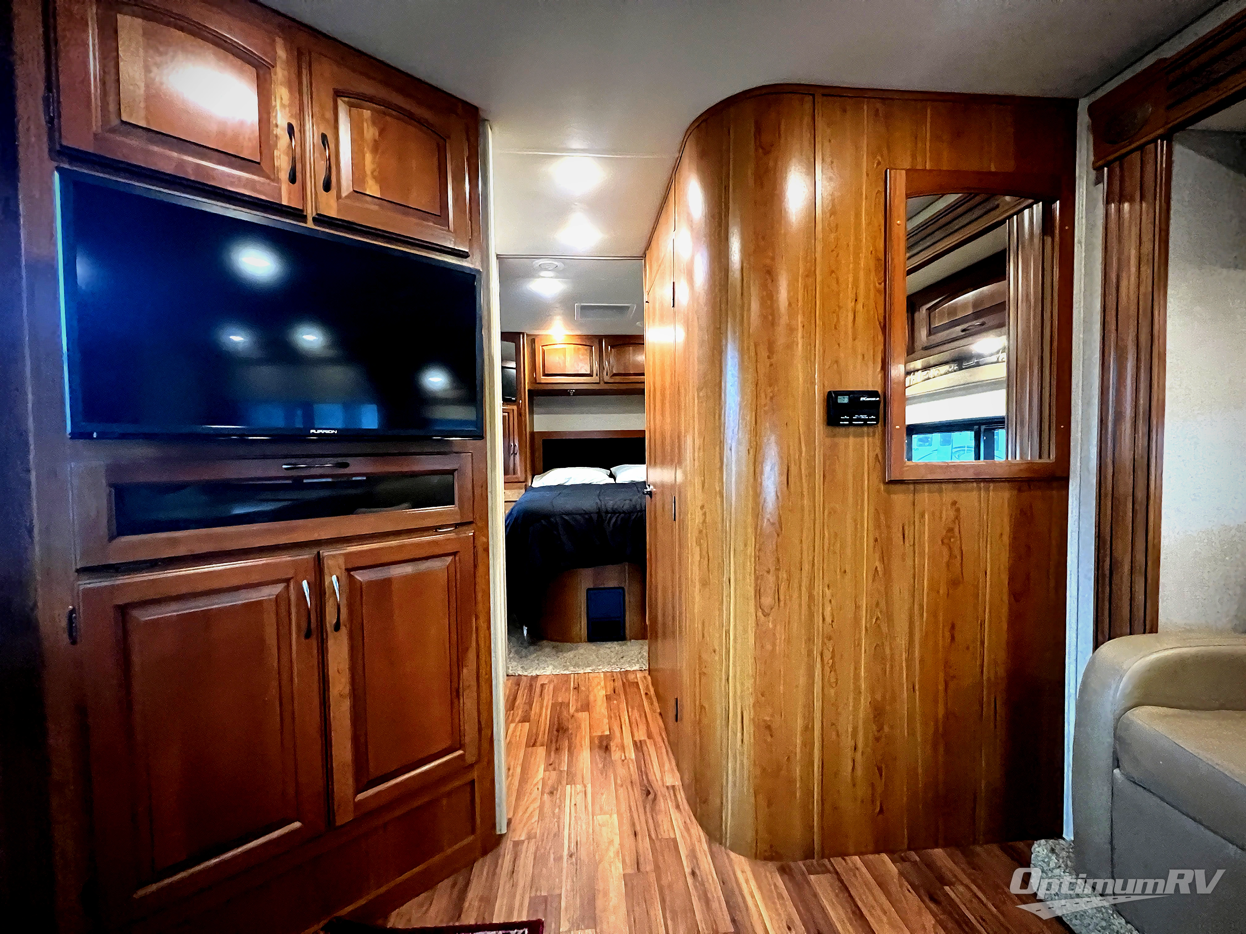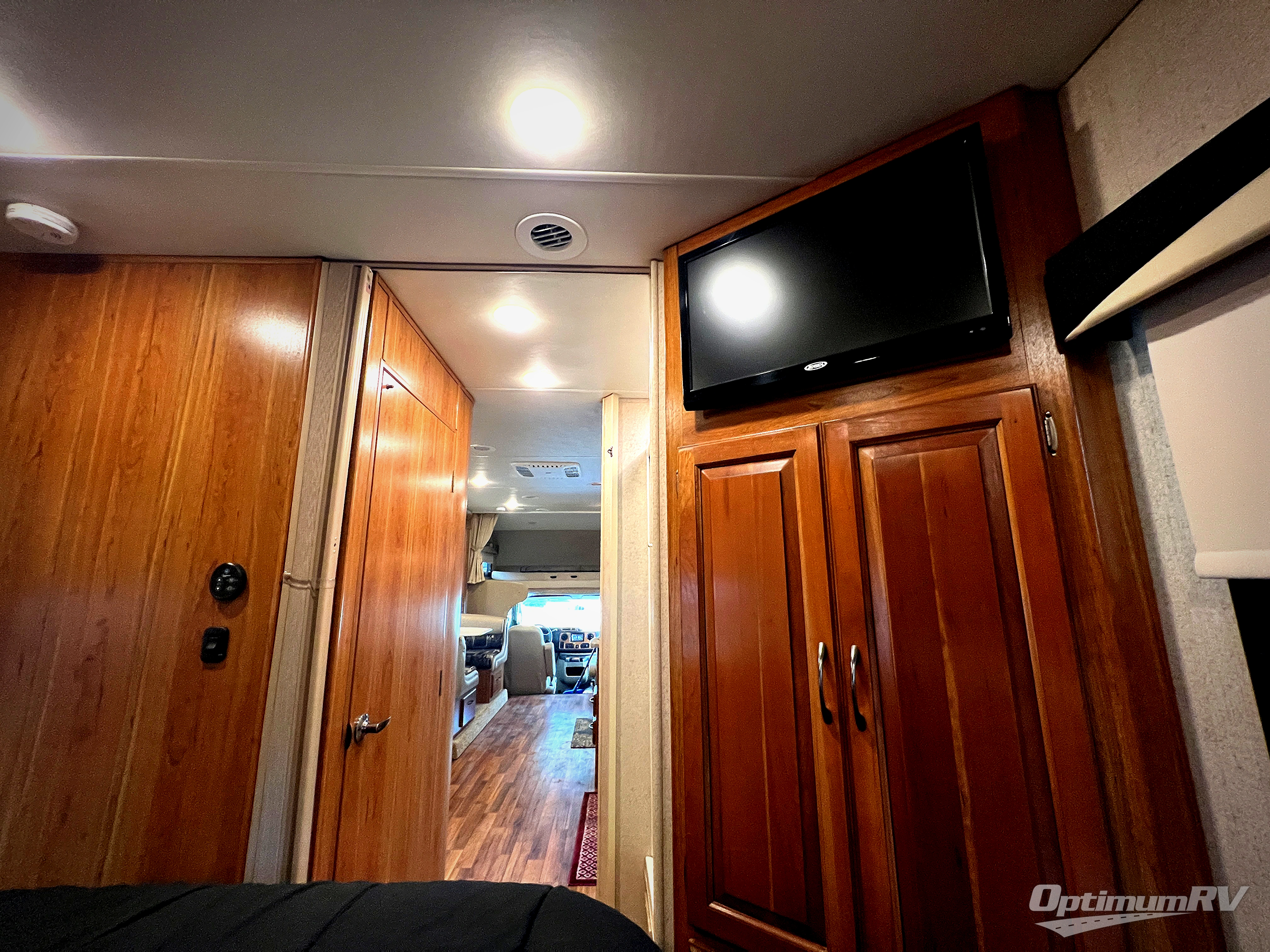 Starting in the rear of the 31FK Greyhawk motor home by Jayco, you will be in the bedroom. You will find a wardrobe, queen bed, nightstand, and a corner TV cabinet.