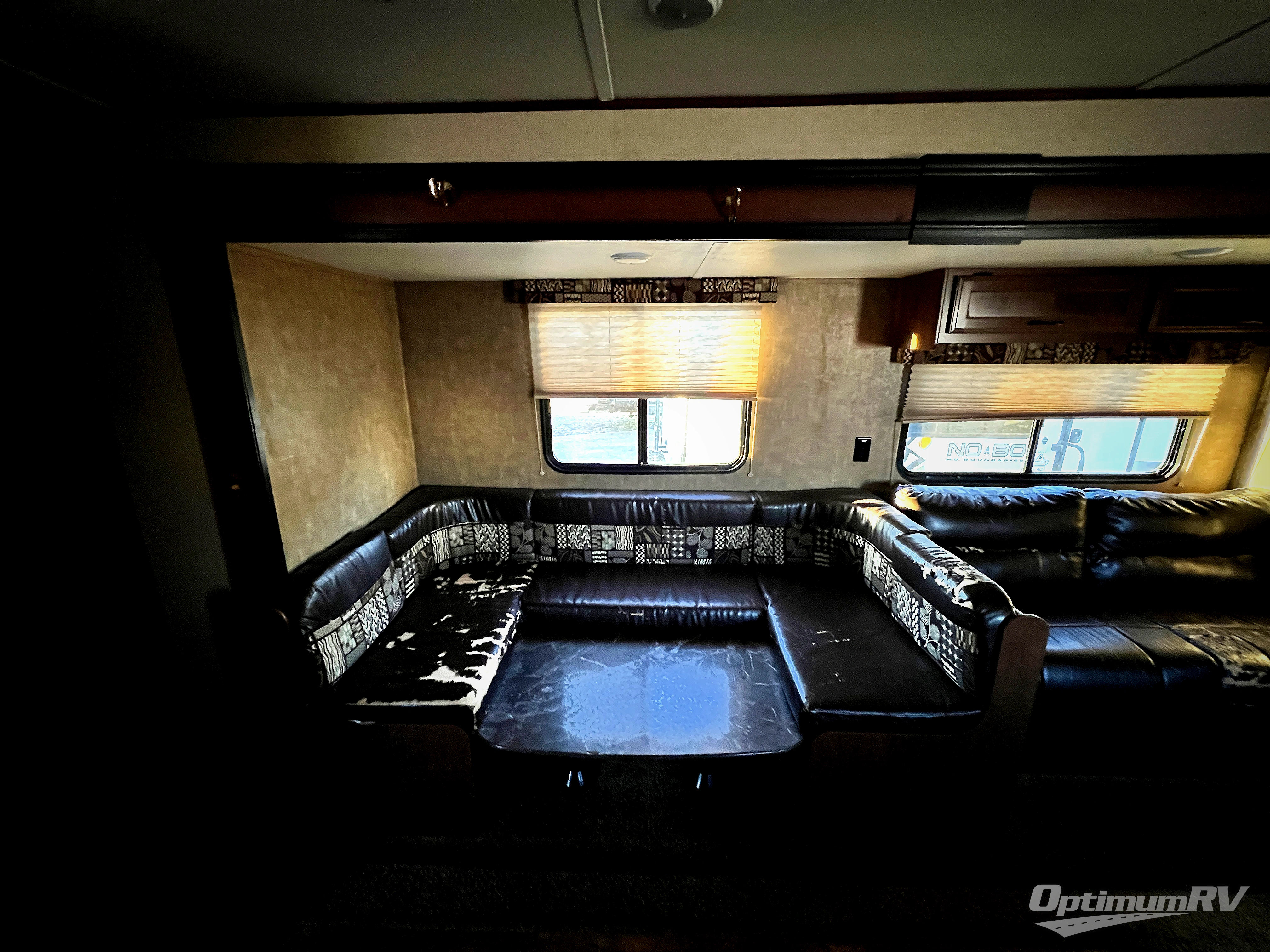 As you enter the travel trailer, to the left you will find an angled double kitchen sink, three burner range, refrigerator, pantry, and wardrobe. The opposite side of the trailer has a slide with a u-dinette and sofa. Next to the slide you will find an entertainment center and a bench/storage.