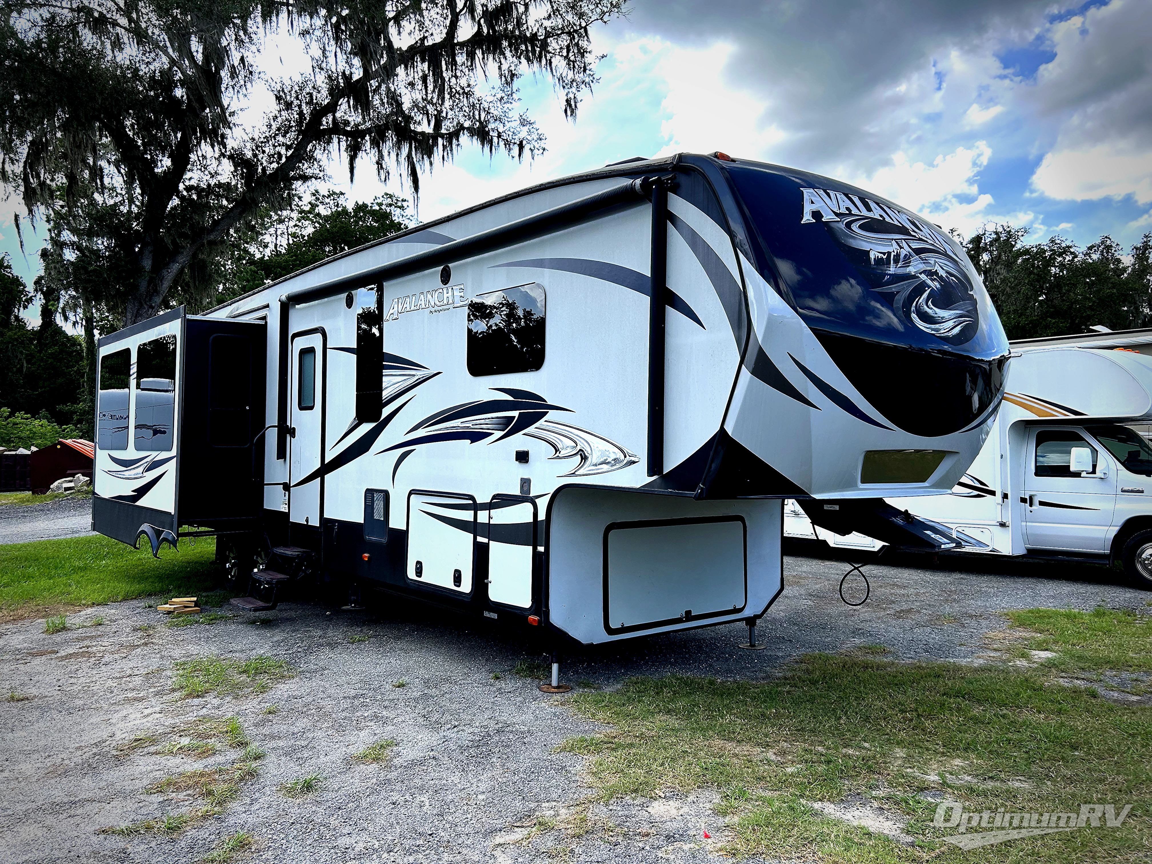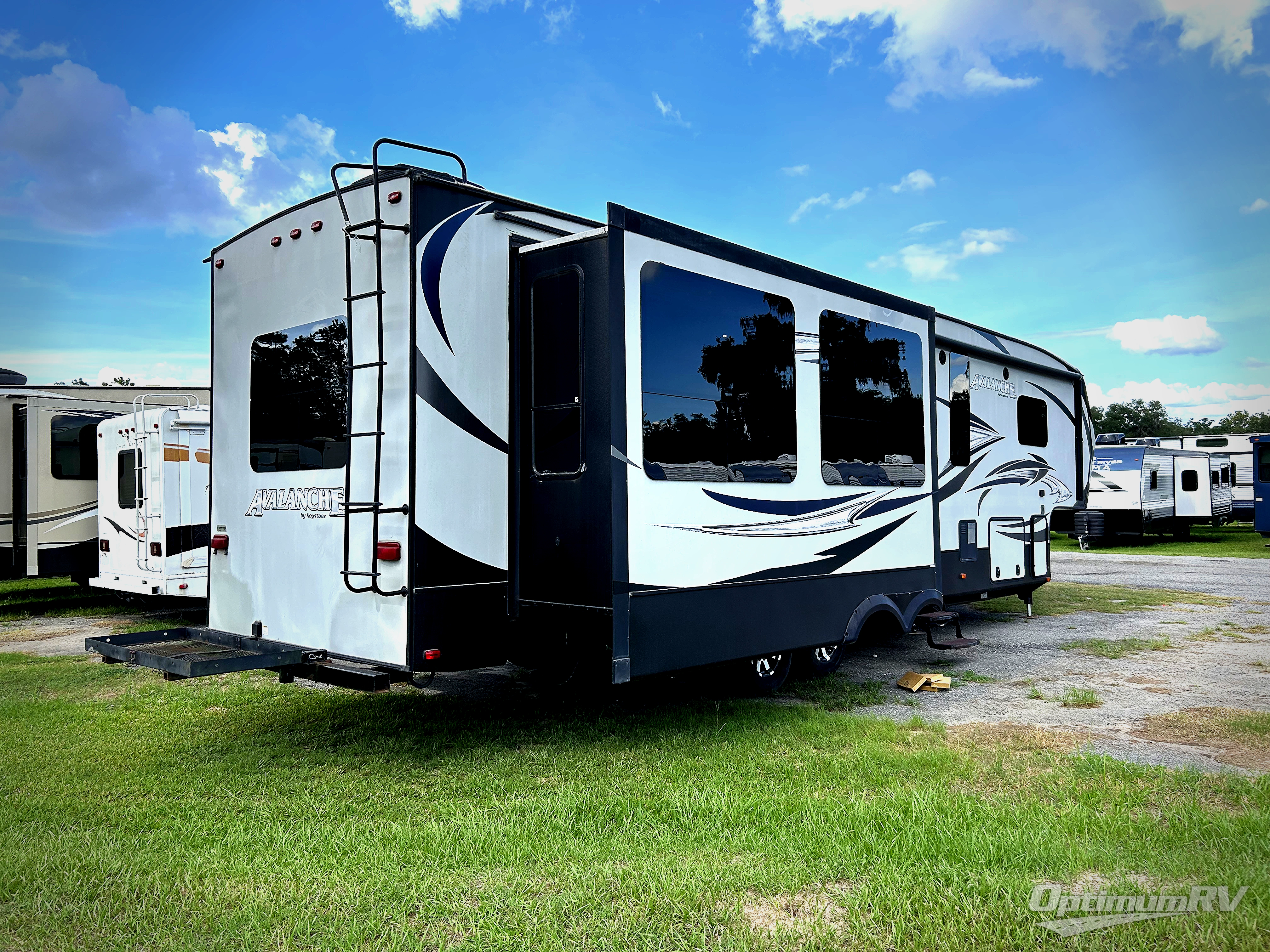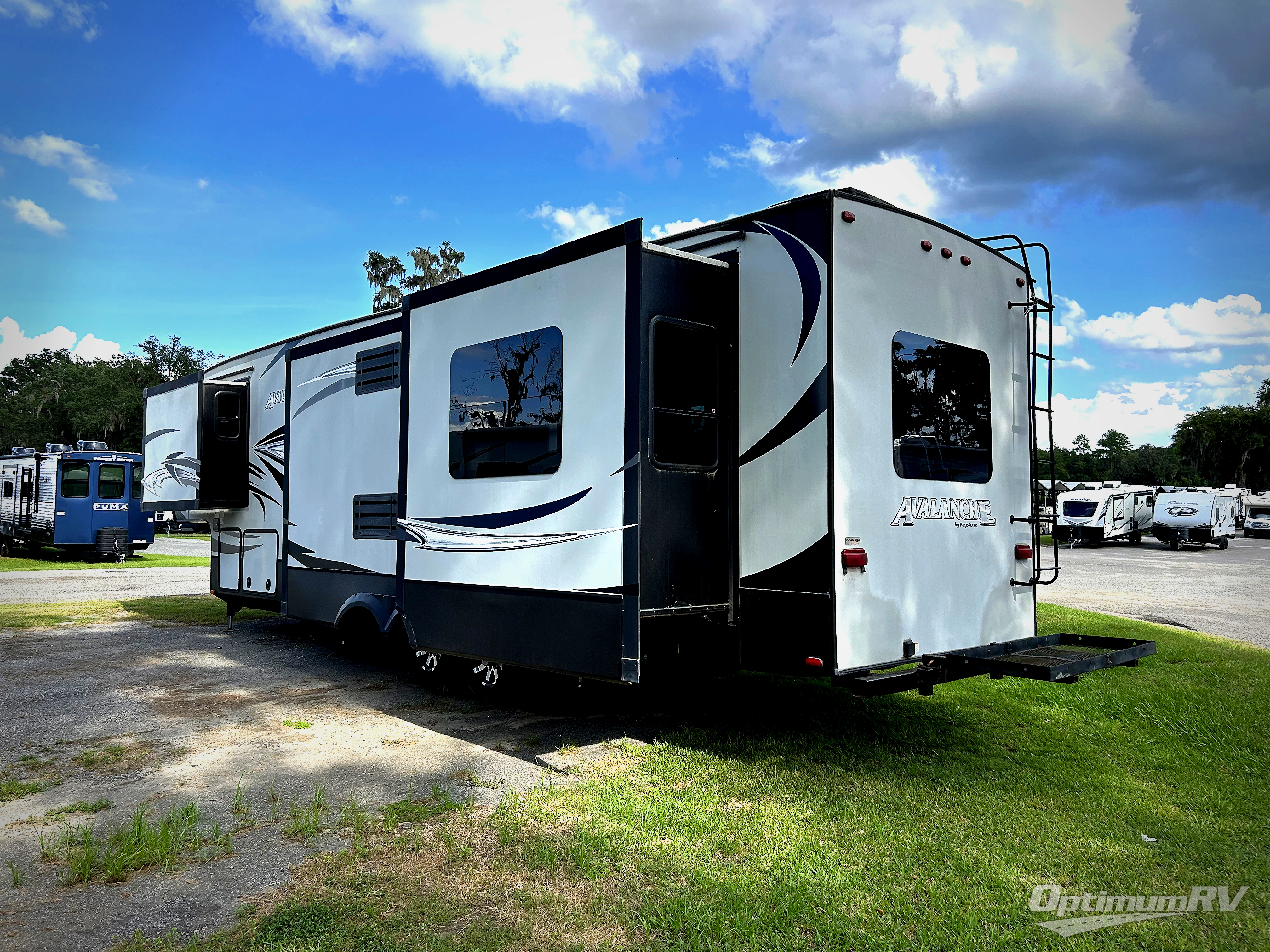 This Keystone Avalanche 331RE fifth wheel features quad slides and a rear entertainment center and fireplace, plus king size bed!