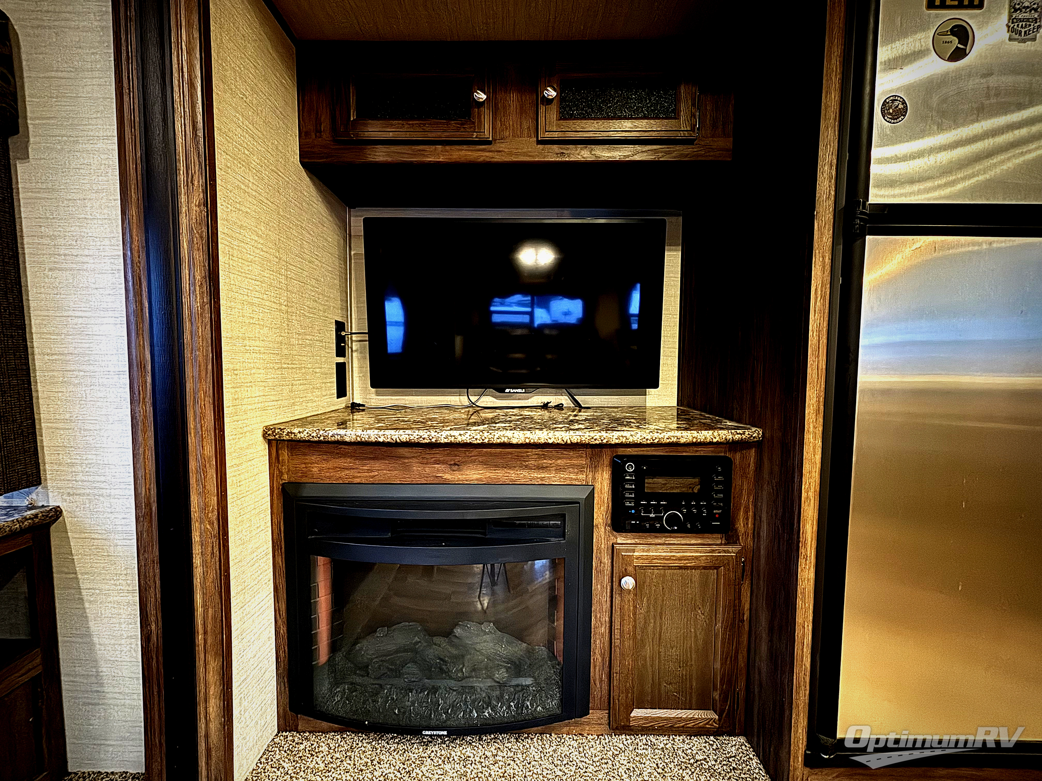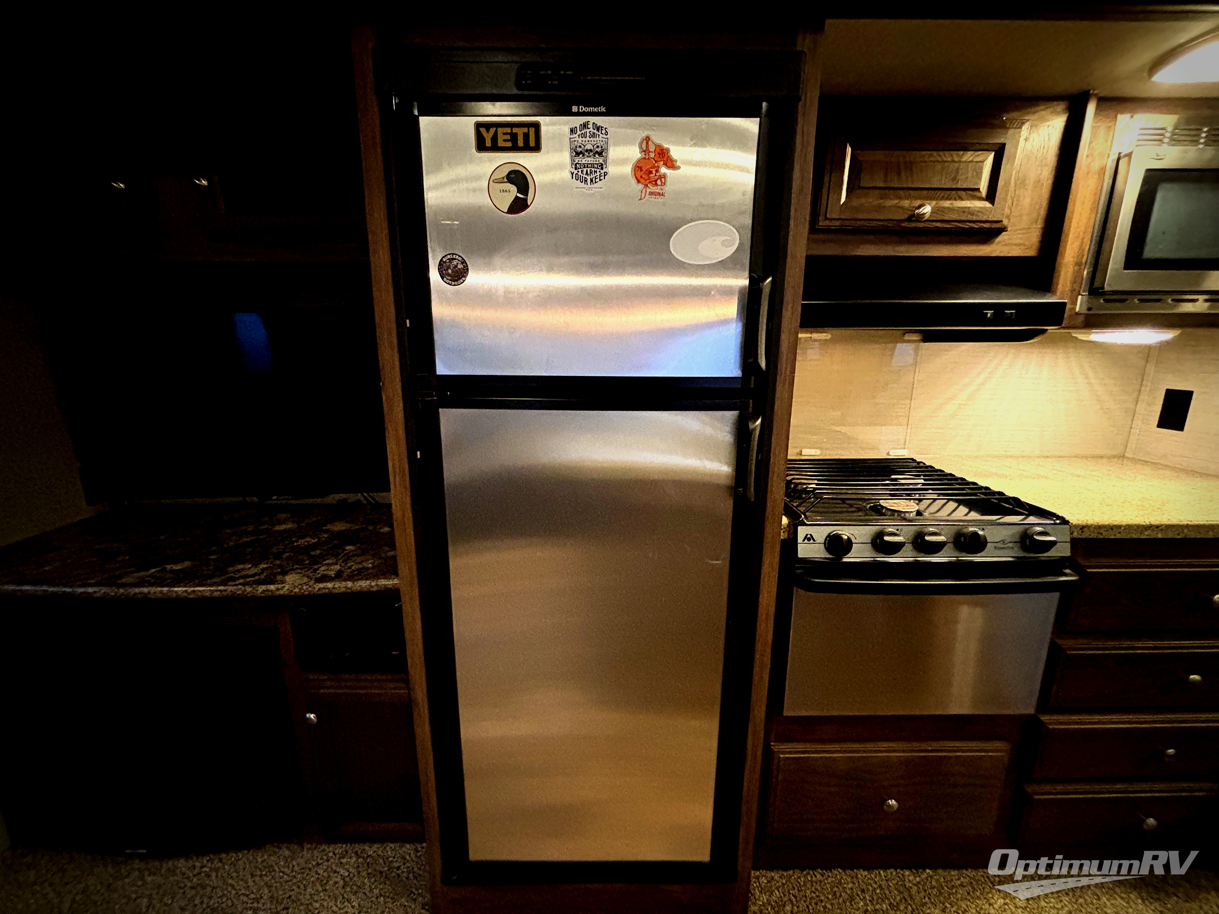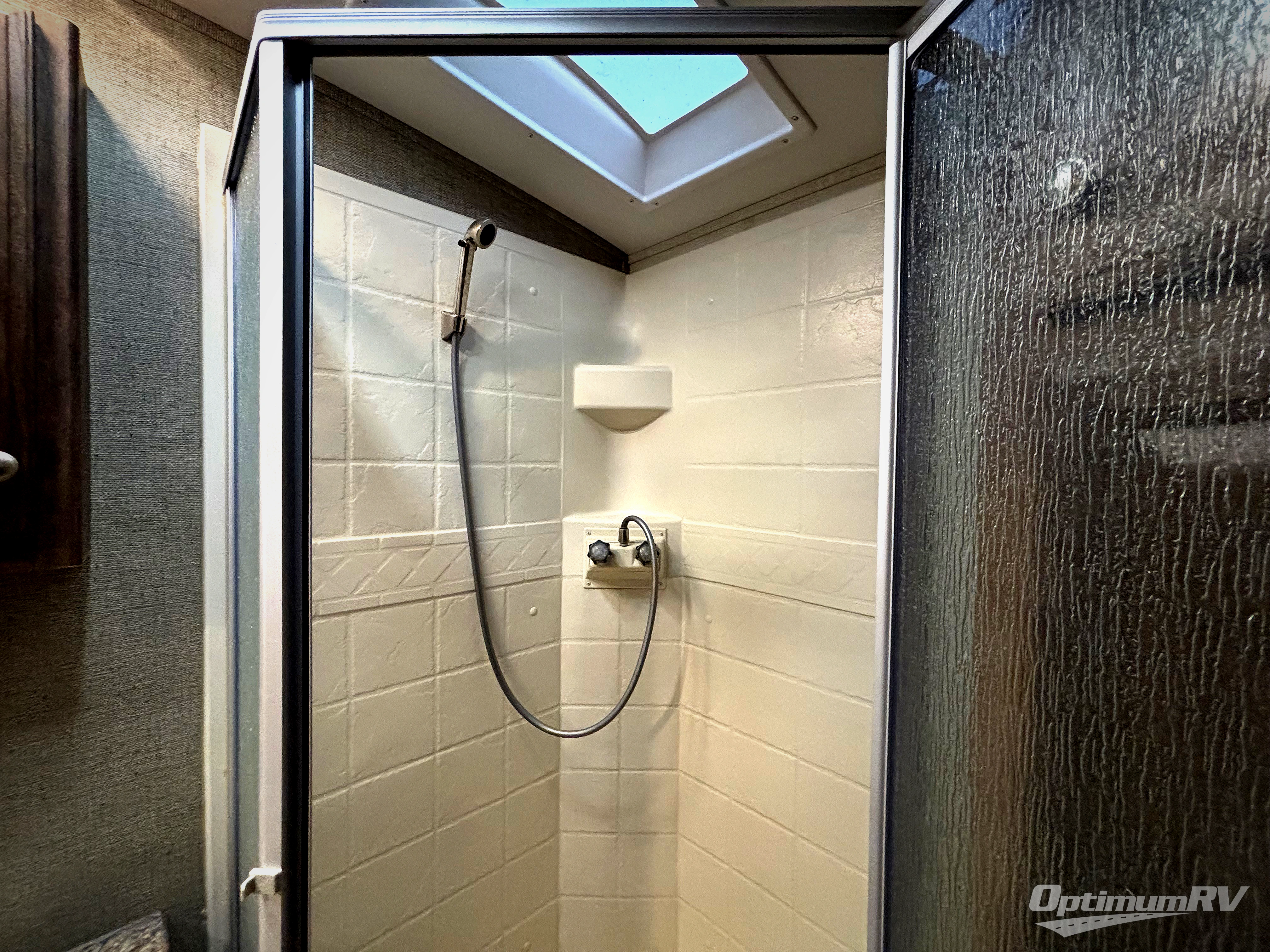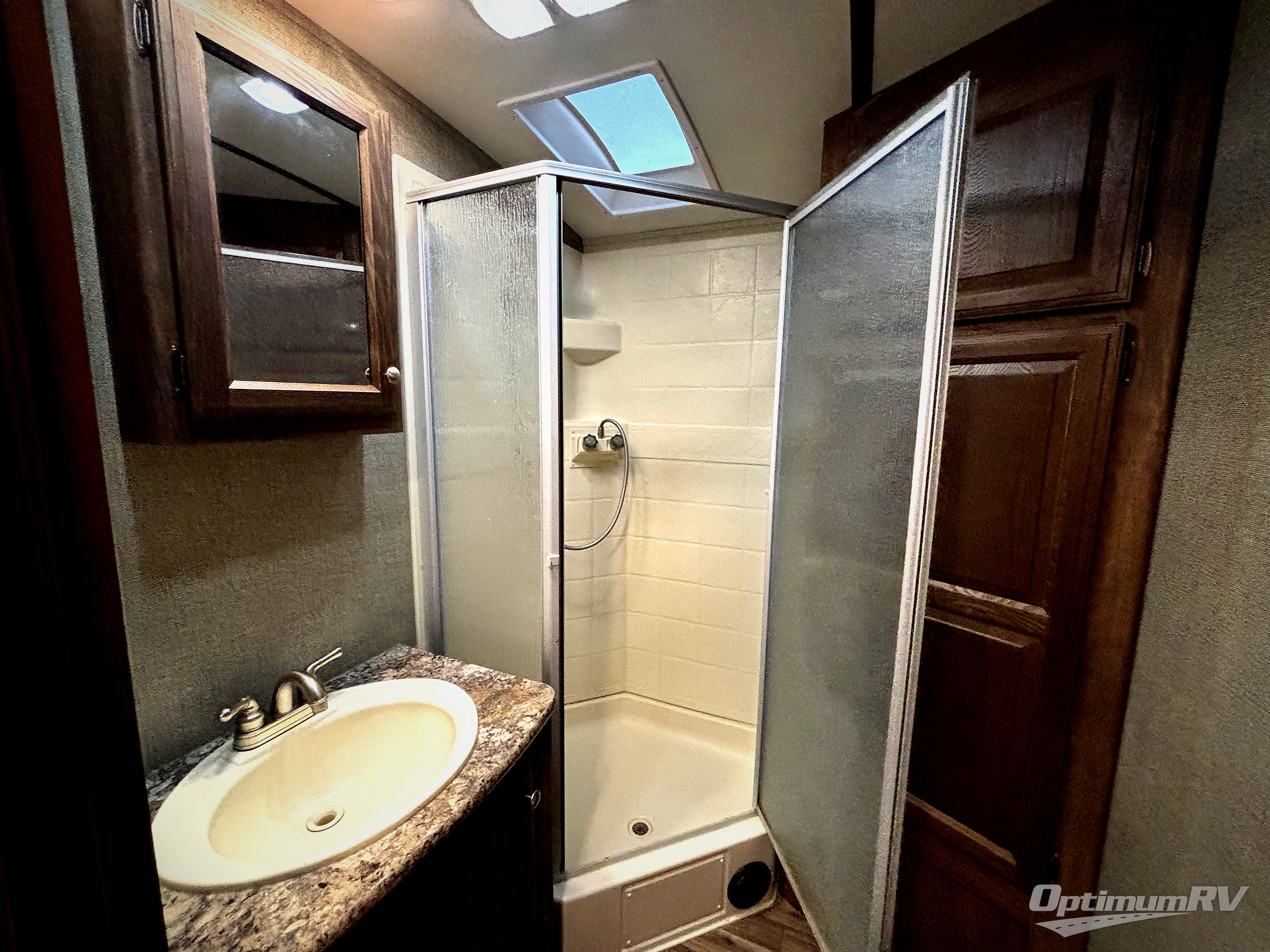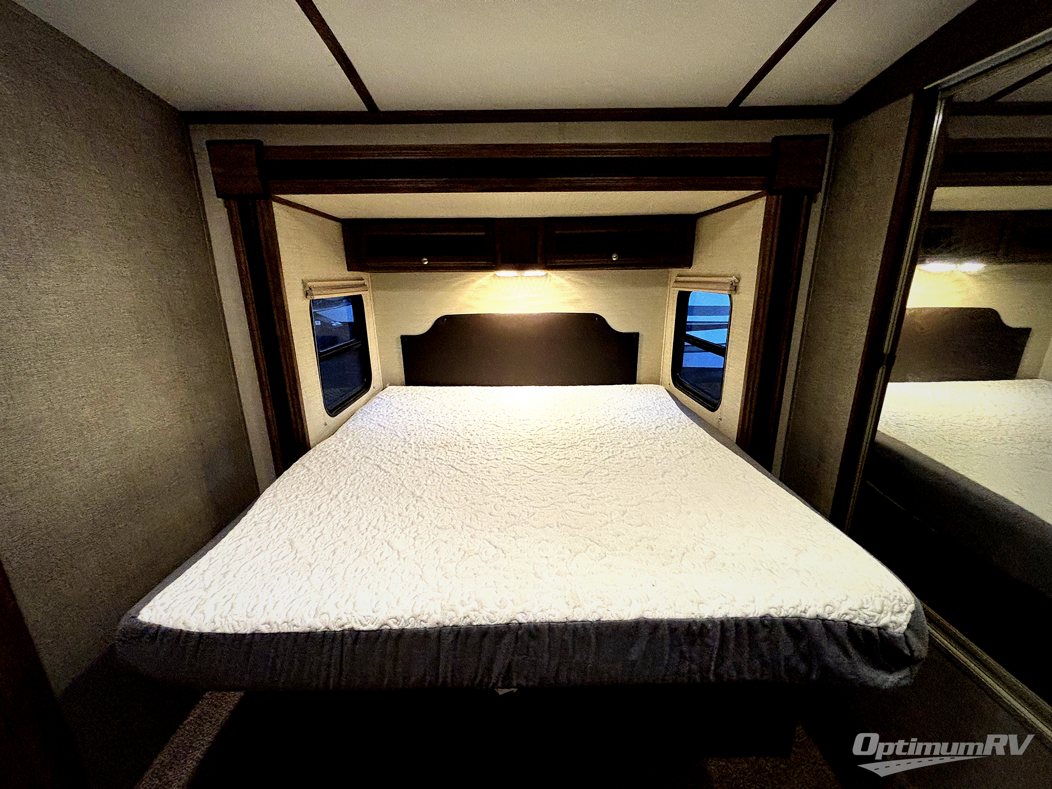 Just outside the bathroom door in the front find a private master bedroom with sliding door. The King bed slides out from the road side wall and includes overhead storage for your things. There is also a full front wardrobe with sliding doors, plus more storage opposite the bed with overhead cabinets as well.