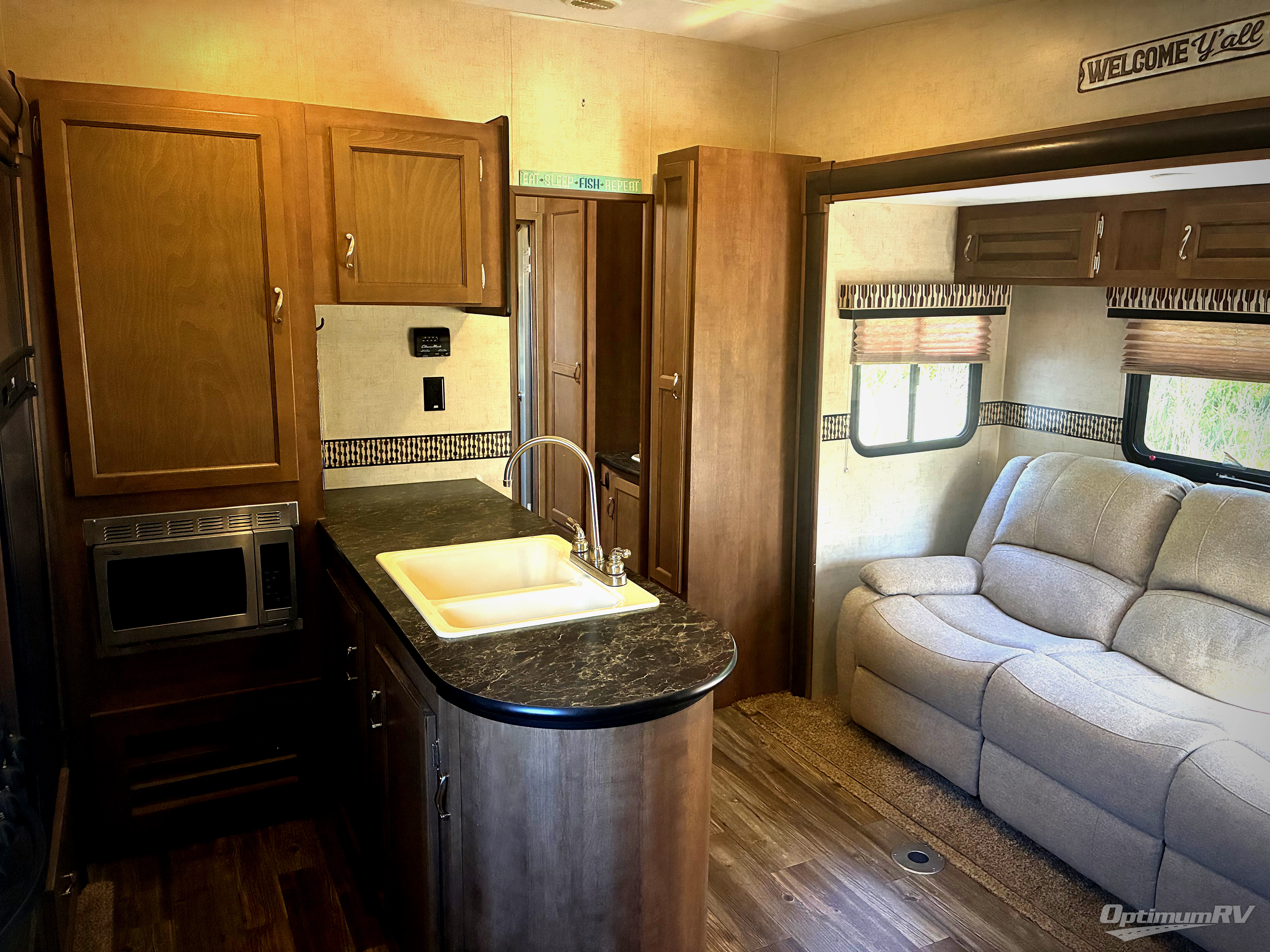 This travel trailer is packed with convenient features and luxury comforts for a camping trip you won't soon forget. Once you arrive at the campground, put out the electric awning and make a quick lunch on the exterior camp kitchen. The kitchen island inside will be the perfect place to cut up all the fixings for the burgers and you can grab the chips from the pantry. The kids will love the private bunkhouse that includes two bunks, a jackknife sofa with a kick, plus a dual entry half bath for convenience. The full walk-through bath will create a front master bedroom you are sure to love. Here, the king bed will provide a great night's rest and there are dual wardrobes for all your clothes. Plus there is a convenient shoe storage and pet station for your trusted loyal friends!