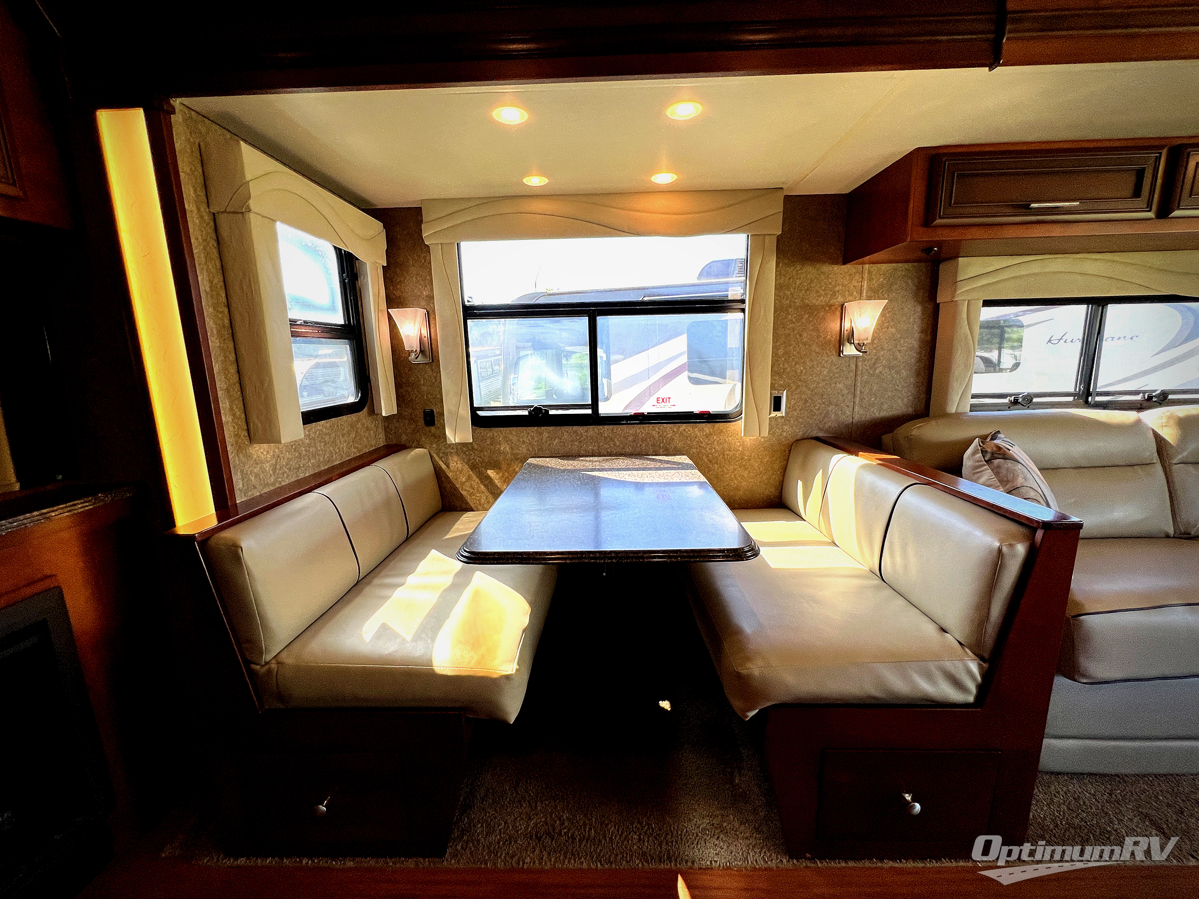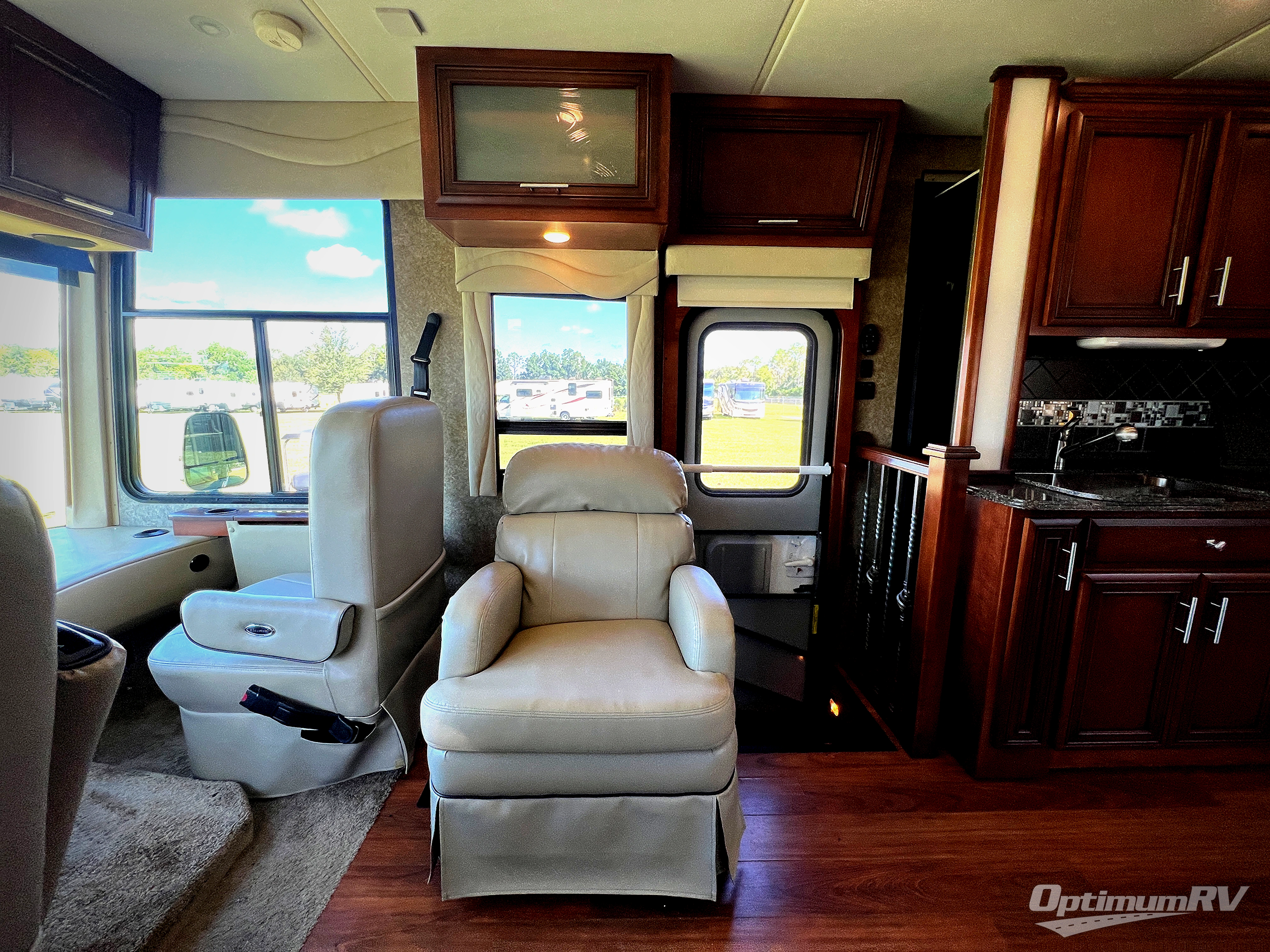 As you enter the motor coach, to the right is a recliner with overhead cabinets. The driver and passenger's chairs rotate to provide more seating in the living and kitchen space. There is additional storage above the cab.