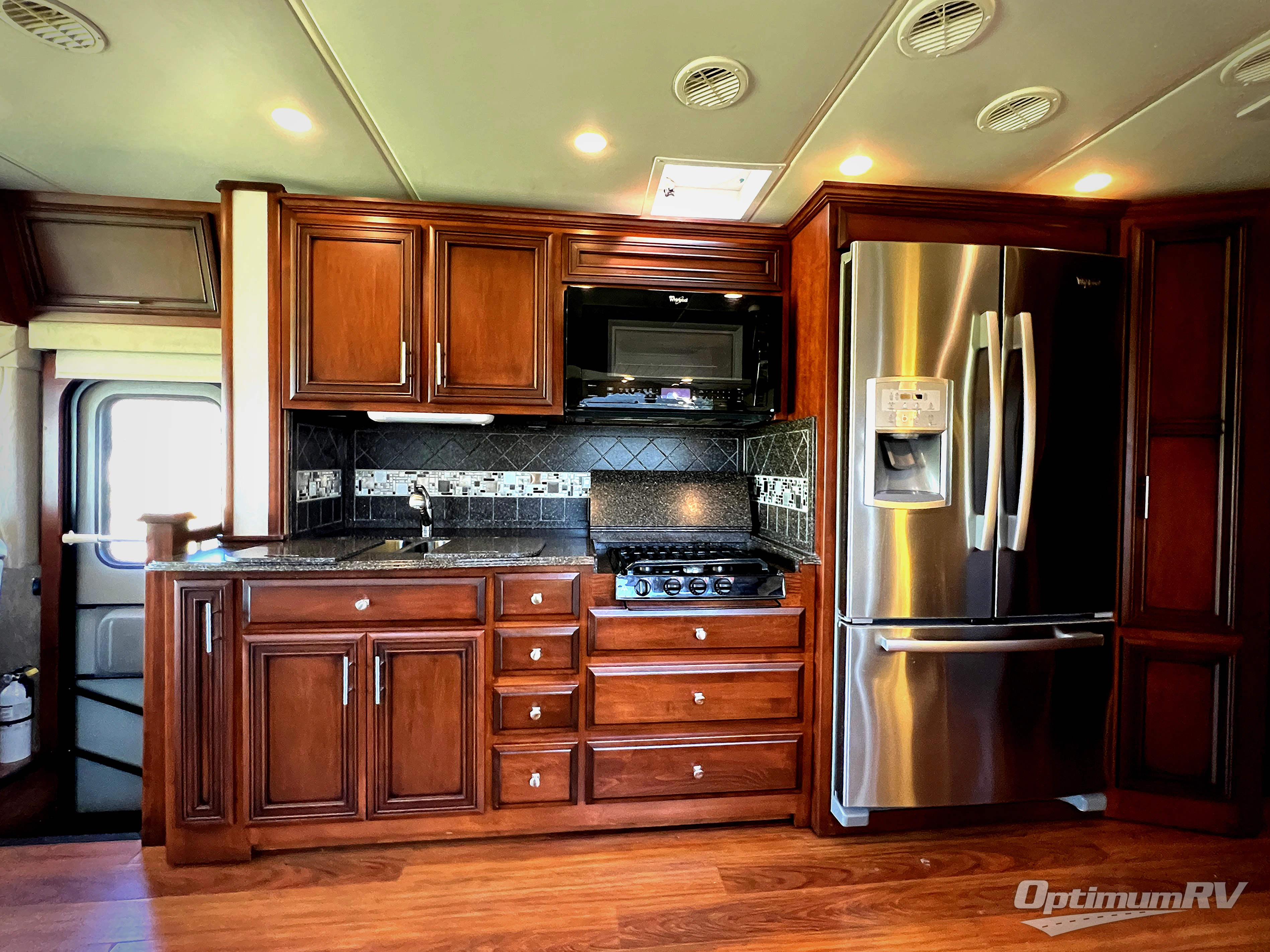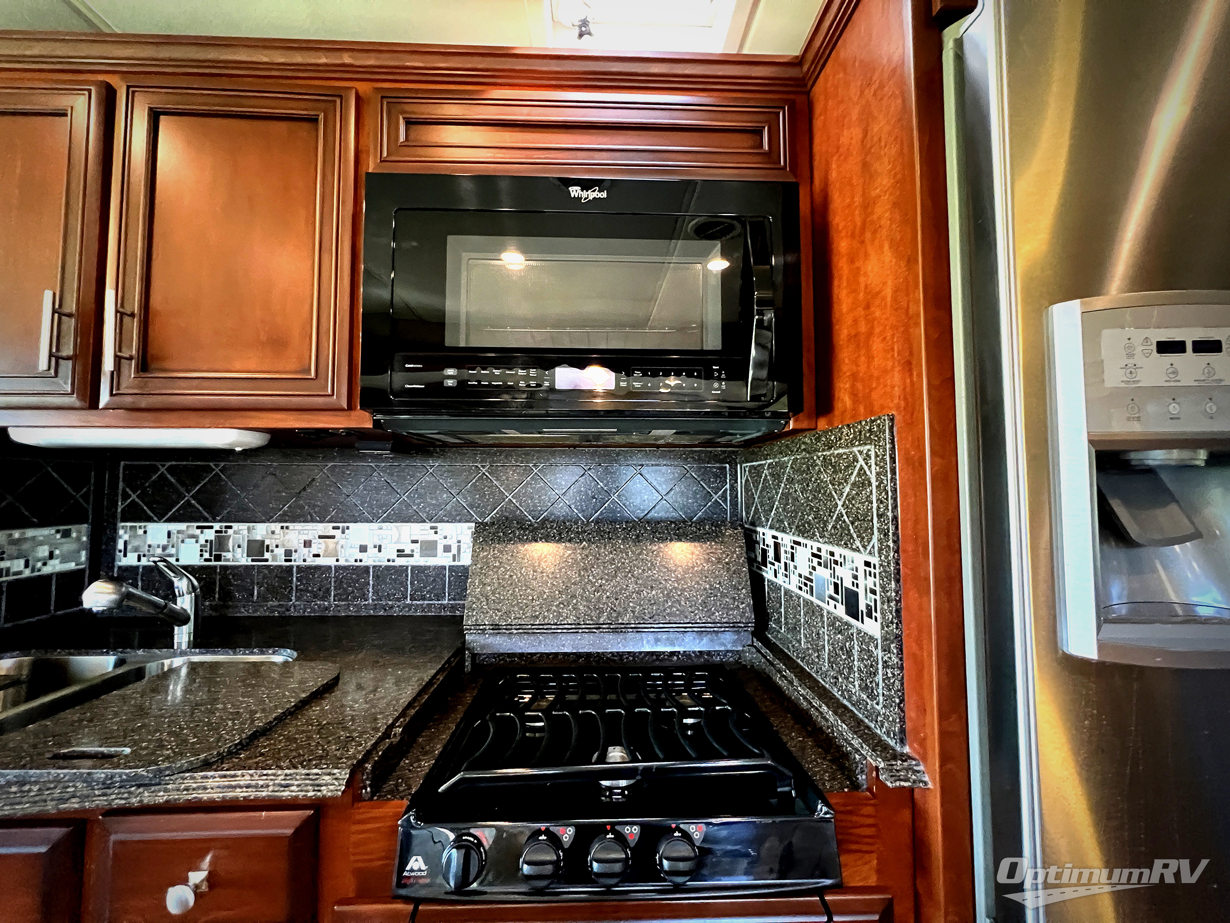 The kitchen includes a slide featuring a double kitchen sink, three burner range, refrigerator, and two pantries for your non-perishables.