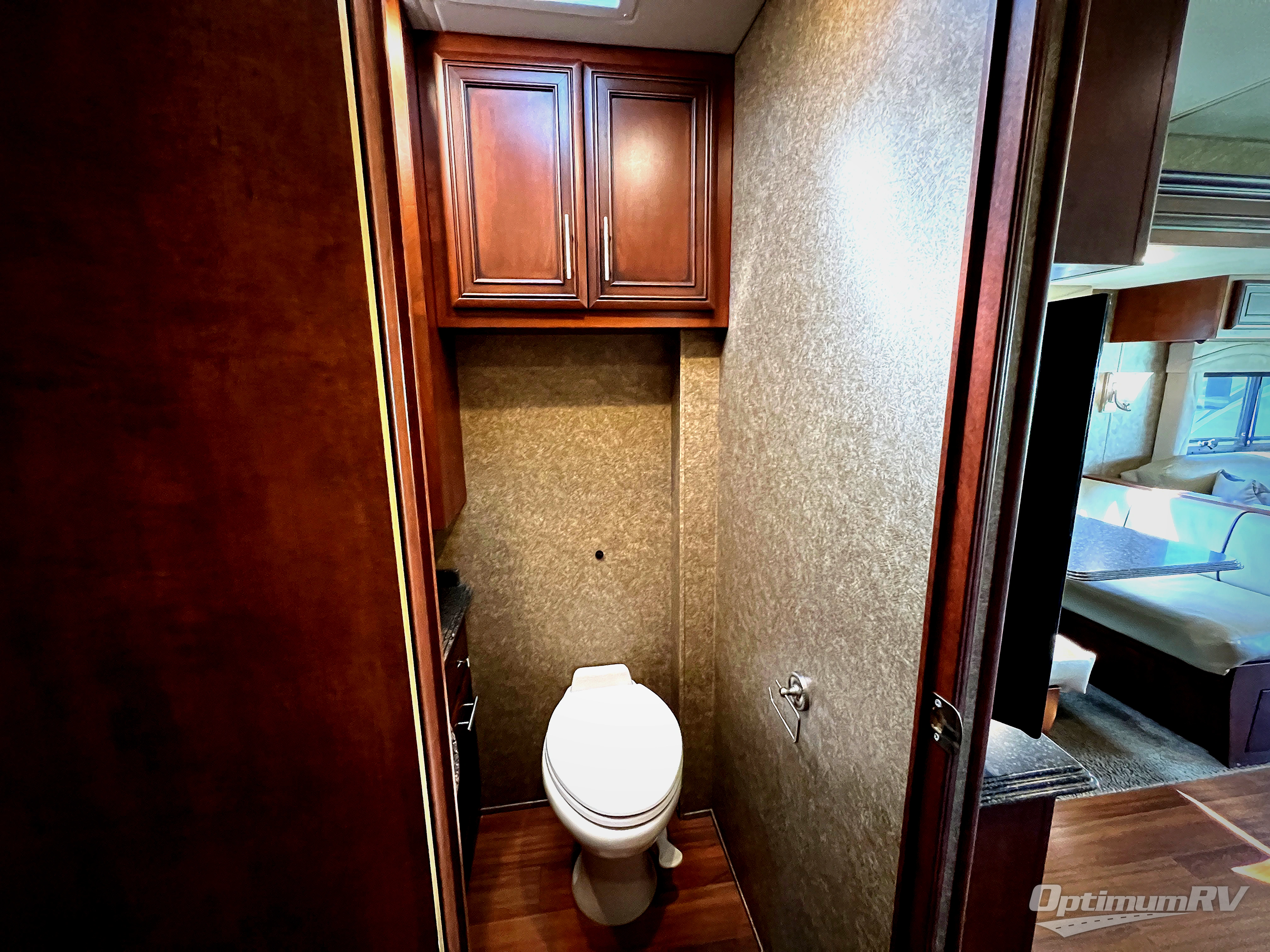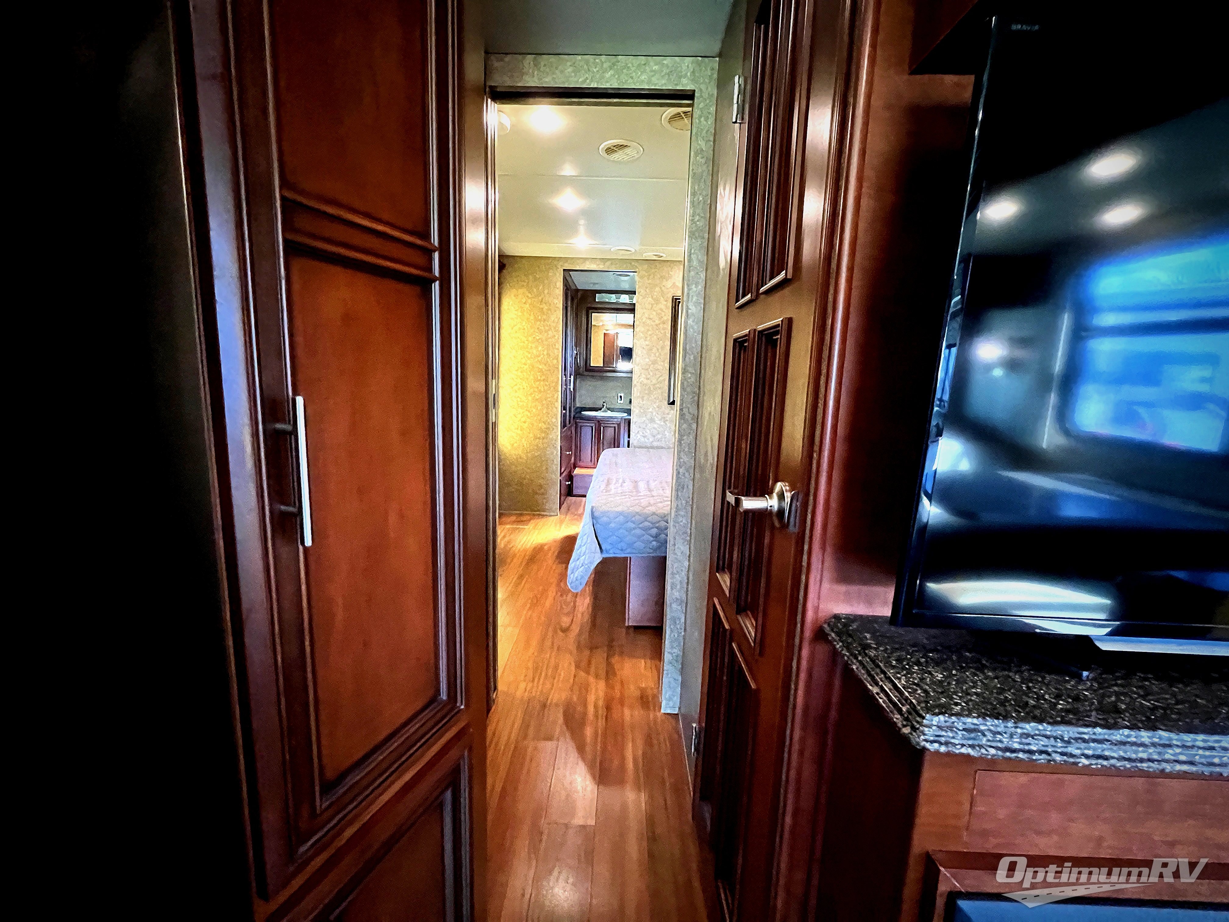 As you head to the rear bath, slide the master bedroom door open to see two slides, one slide includes the king bed with overhead cabinets, the other slide offers a chest of drawers and overhead cabinets including a TV.