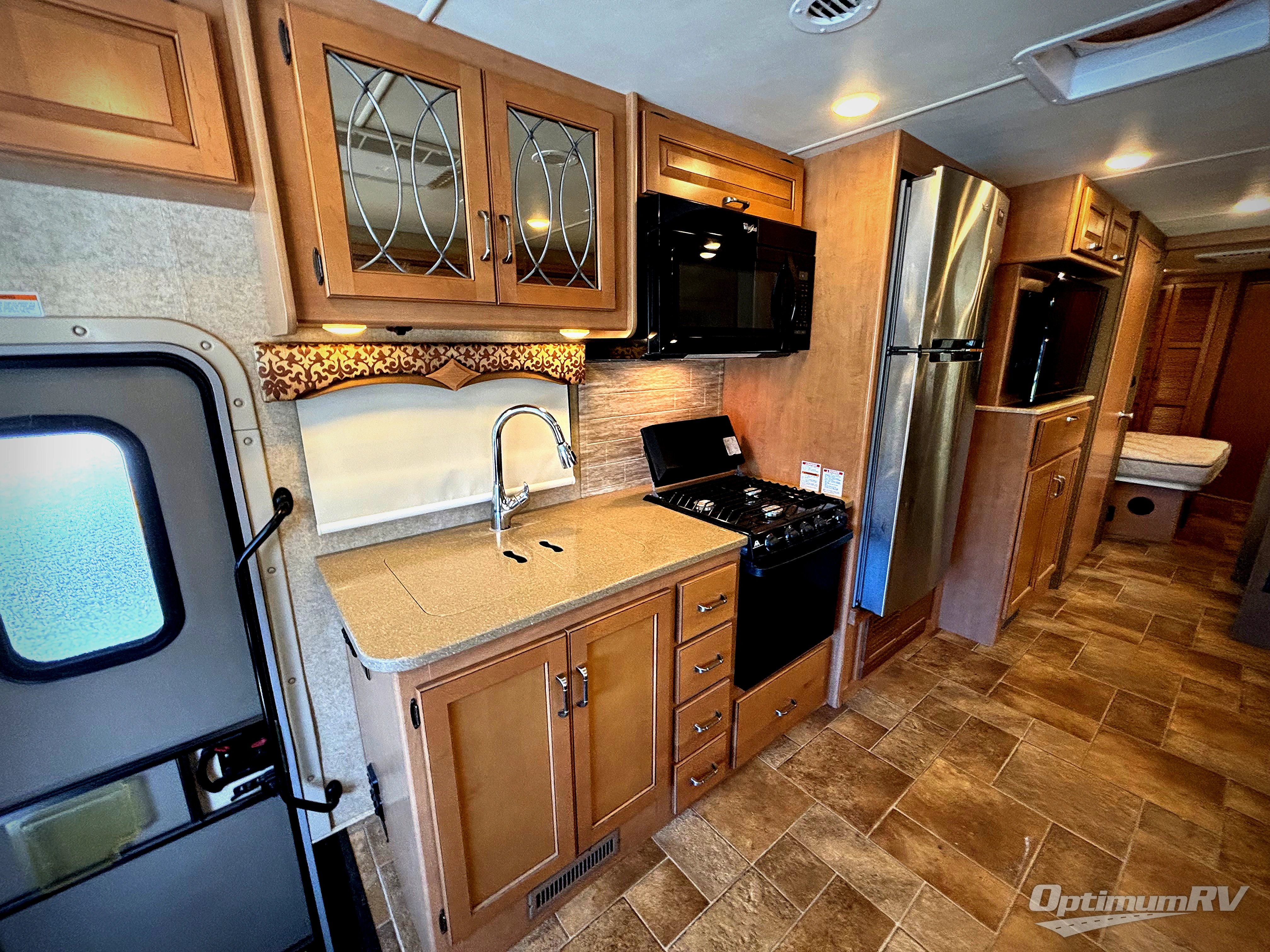 Step inside model 35C and see just how convenient your next road trip can be. There is a slide out dream dinette and theater seating for two opposite the entry door. With overhead storage above the theater seating, and two sets of seat belts, all of your guests and cabinet items will be secure while traveling. There is also a drop down overhead bunk above the cab area for added sleeping space if needed as well. The convenient coffee table between the captain's chairs allows for more table top space for just about anything. You can also choose a sofa with air bed in place of the theater seats if you like. Enjoy the 40" LED TV along the outer bathroom wall.