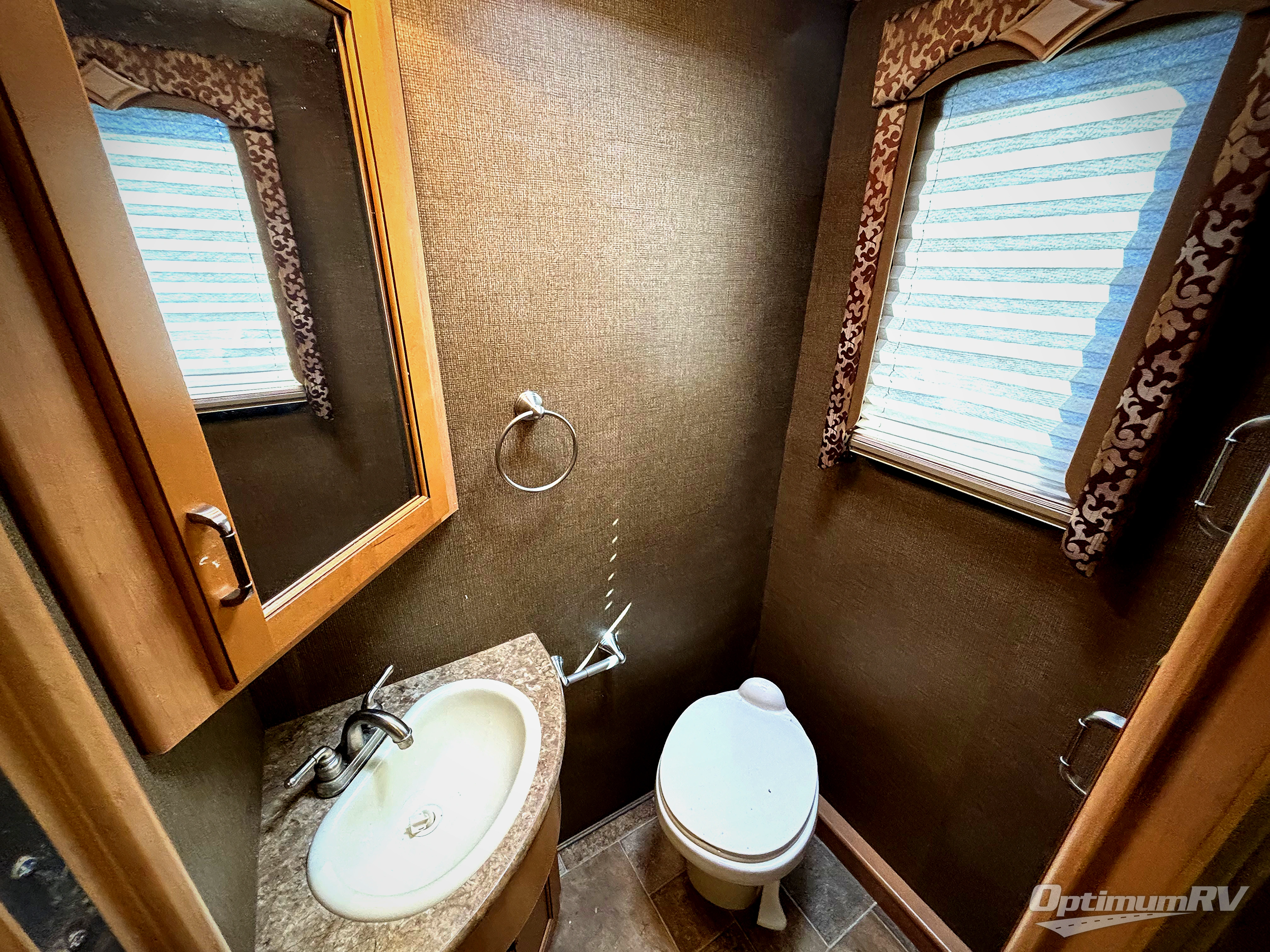 In the master bedroom you will find a slide out queen size bed with nightstands on both sides along with overhead storage above the head of the bed. Opposite find a wardrobe and dresser with an optional 32" LED TV. Across the rear wall there are pull-out shelves, a wardrobe that has been prepped for a washer/dryer, and a half bath mentioned above with a toilet, vanity with sink, plus overhead cabinet.