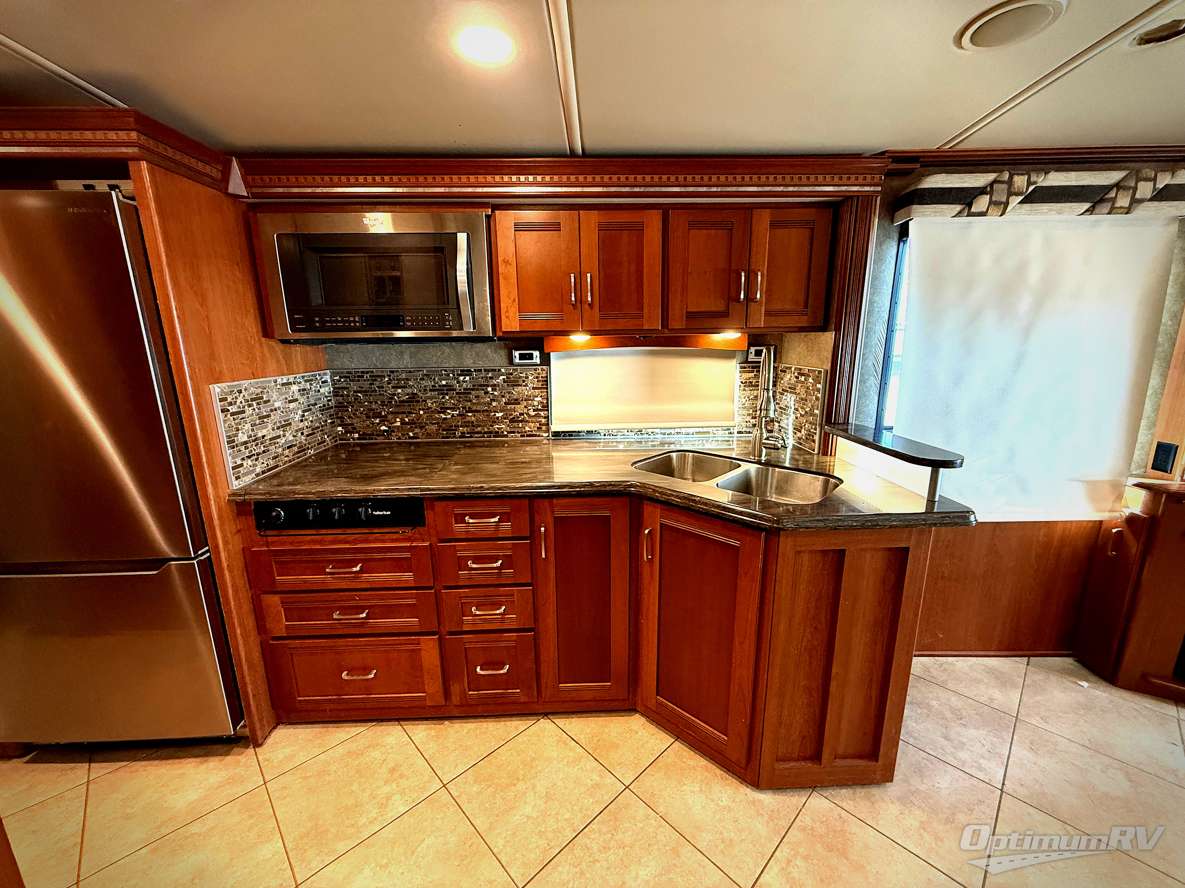 Heading further back you will come to the kitchen and bath area. The kitchen begins at the head of the driver's side slide out with an angled double sink, a three burner range, and a residential refrigerator. There is also a storage cabinet that can be the location of the washer and dryer if you wish to add that convenience. Here you will have no problem creating meals and snacks while on the move.