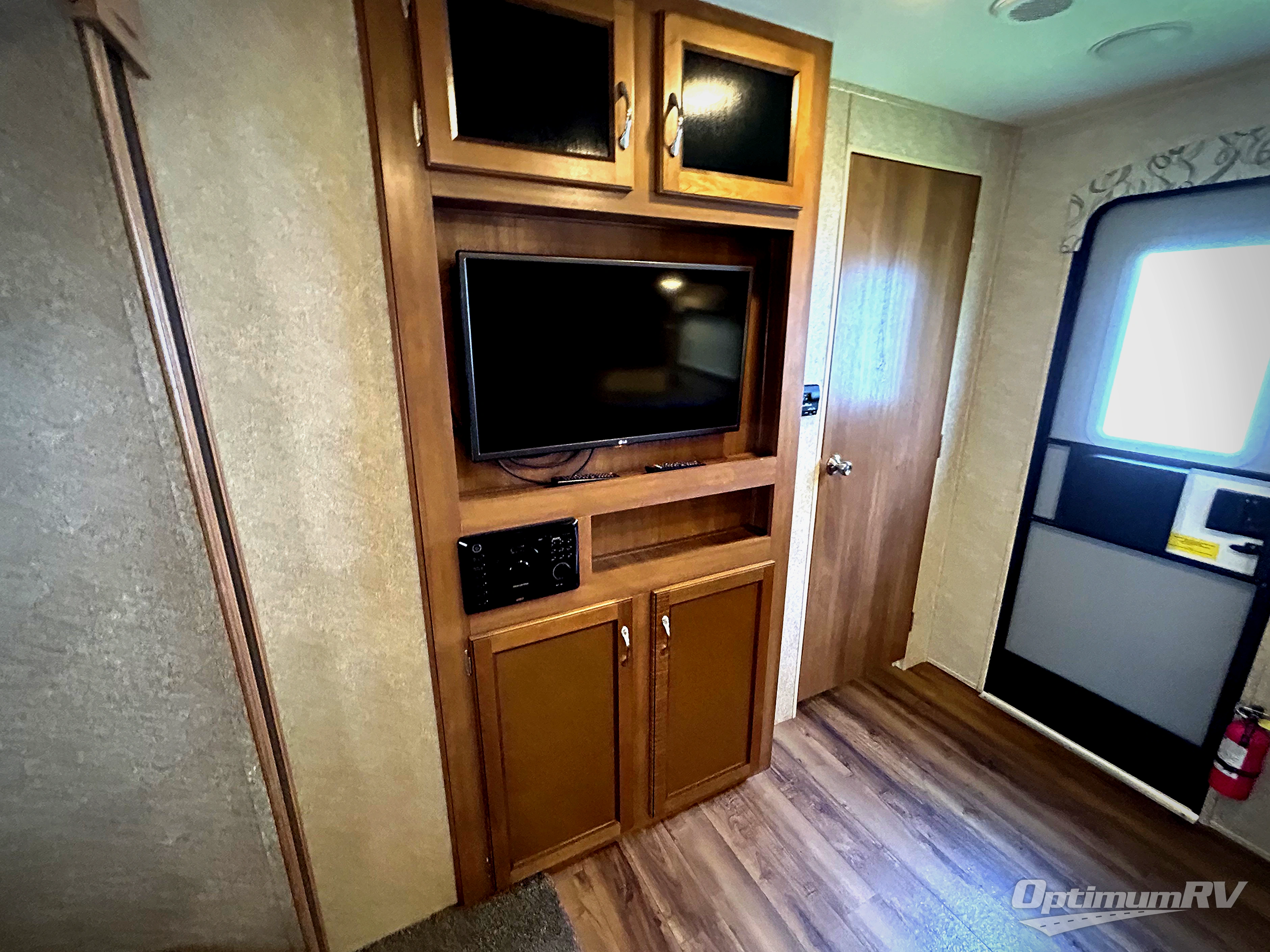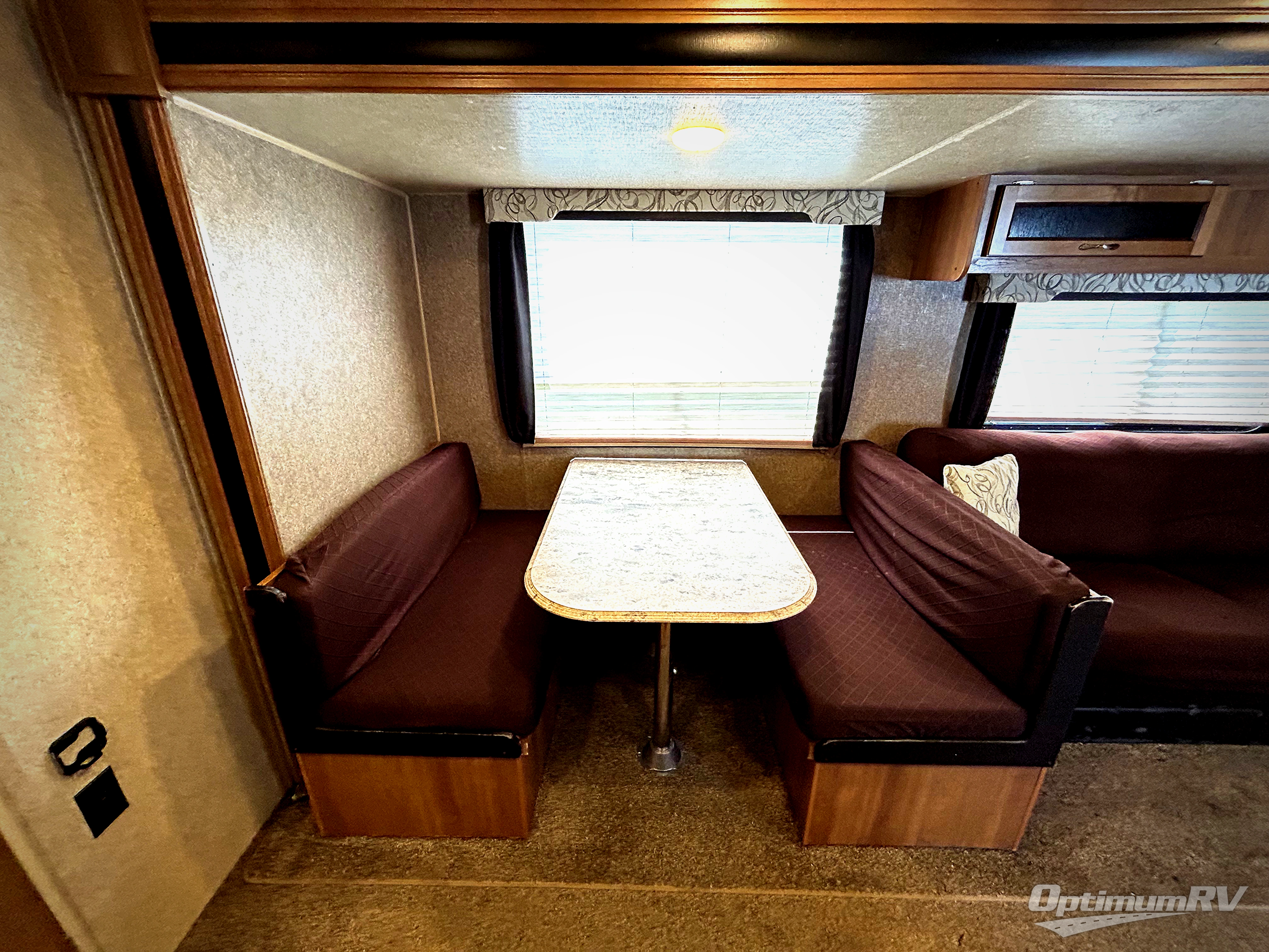 Enjoy your meals while seated at the booth dinette opposite the kitchen. The dinette is part of the slide out that also features a sofa. There is overhead storage above to keep things neat and organized. A nearby entertainment center can easily be viewed by any of the seating shown.