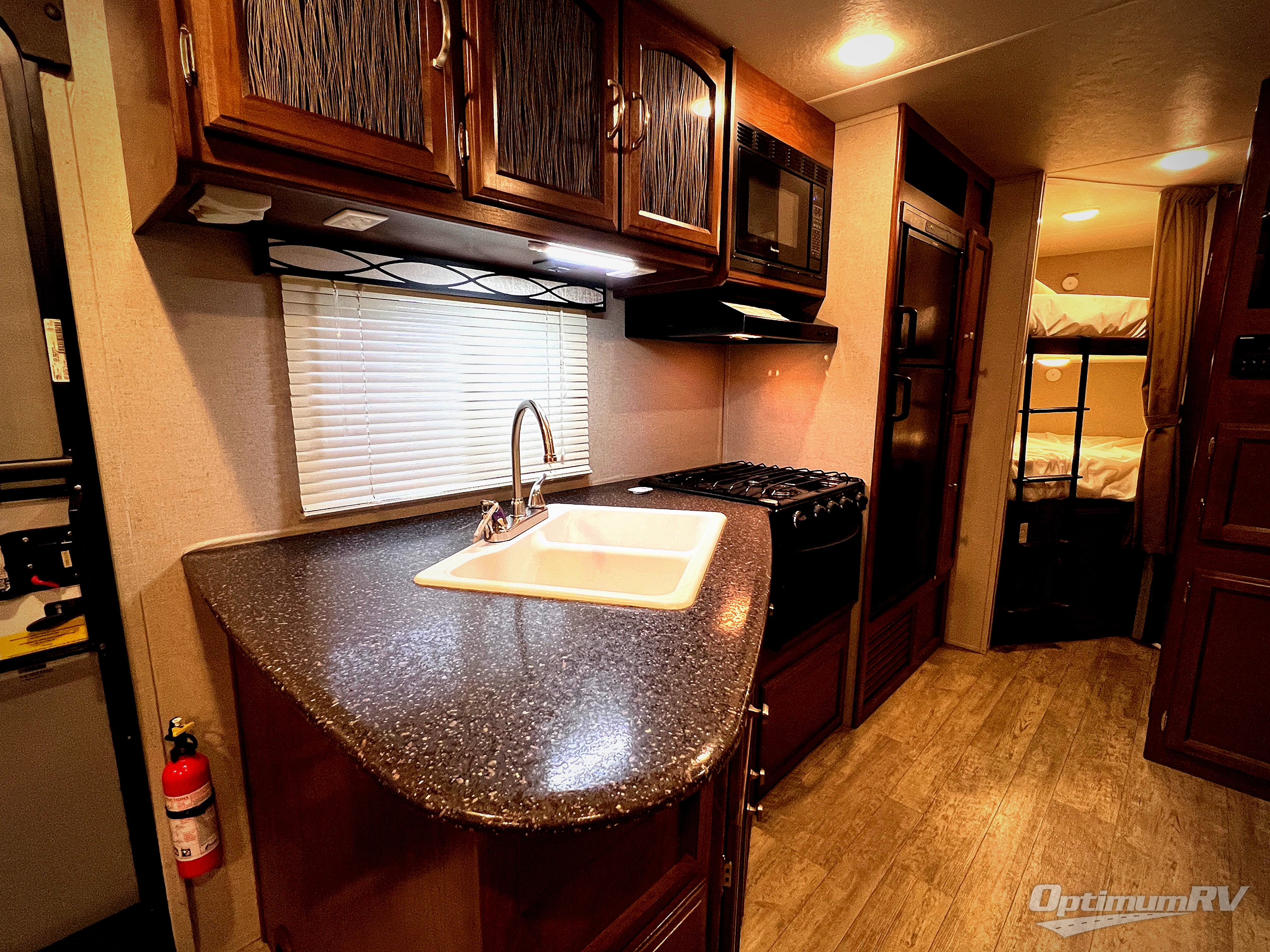The outside camp kitchen featured beneath the bunks inside offer a refrigerator, a sink, and cook-top. When you step inside you will find the kitchen is located just inside the door to your left. The counter-top is angled and features a double sink for cleaning up, plus there is a three burner range with overhead microwave oven, and a refrigerator for your perishable goods. The pantry is located between the refrigerator and the double bed bunks, and there is also overhead cabinetry for your dishes and things above the sink.