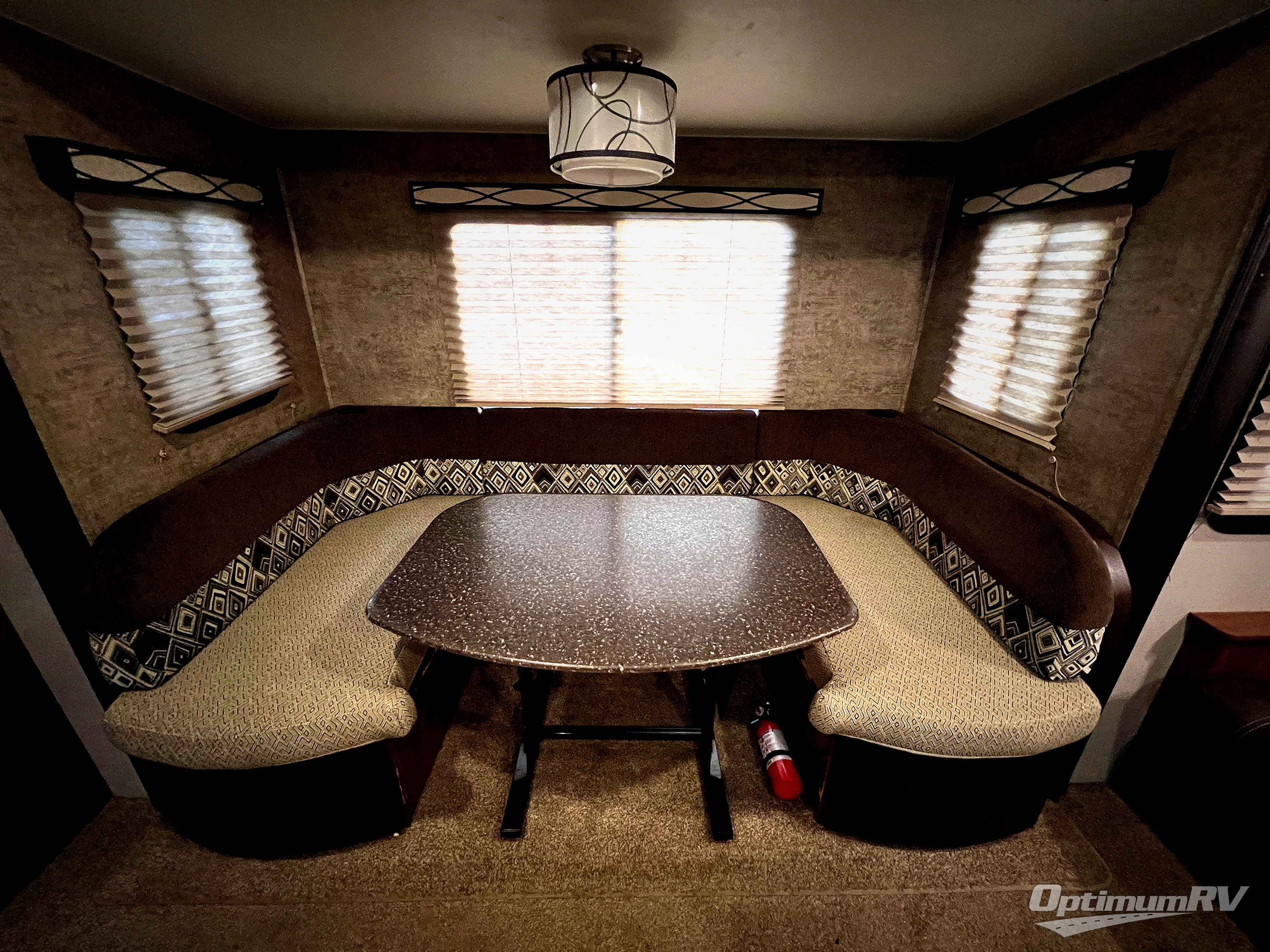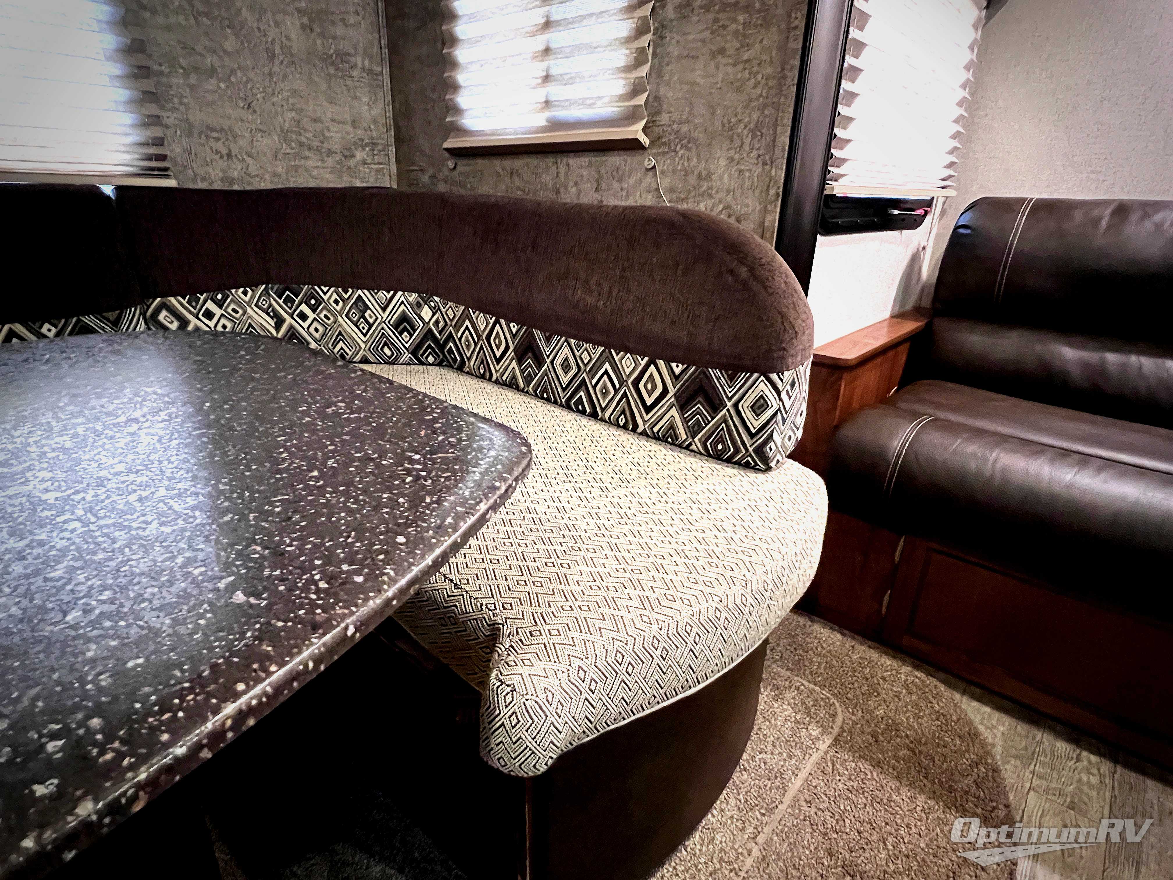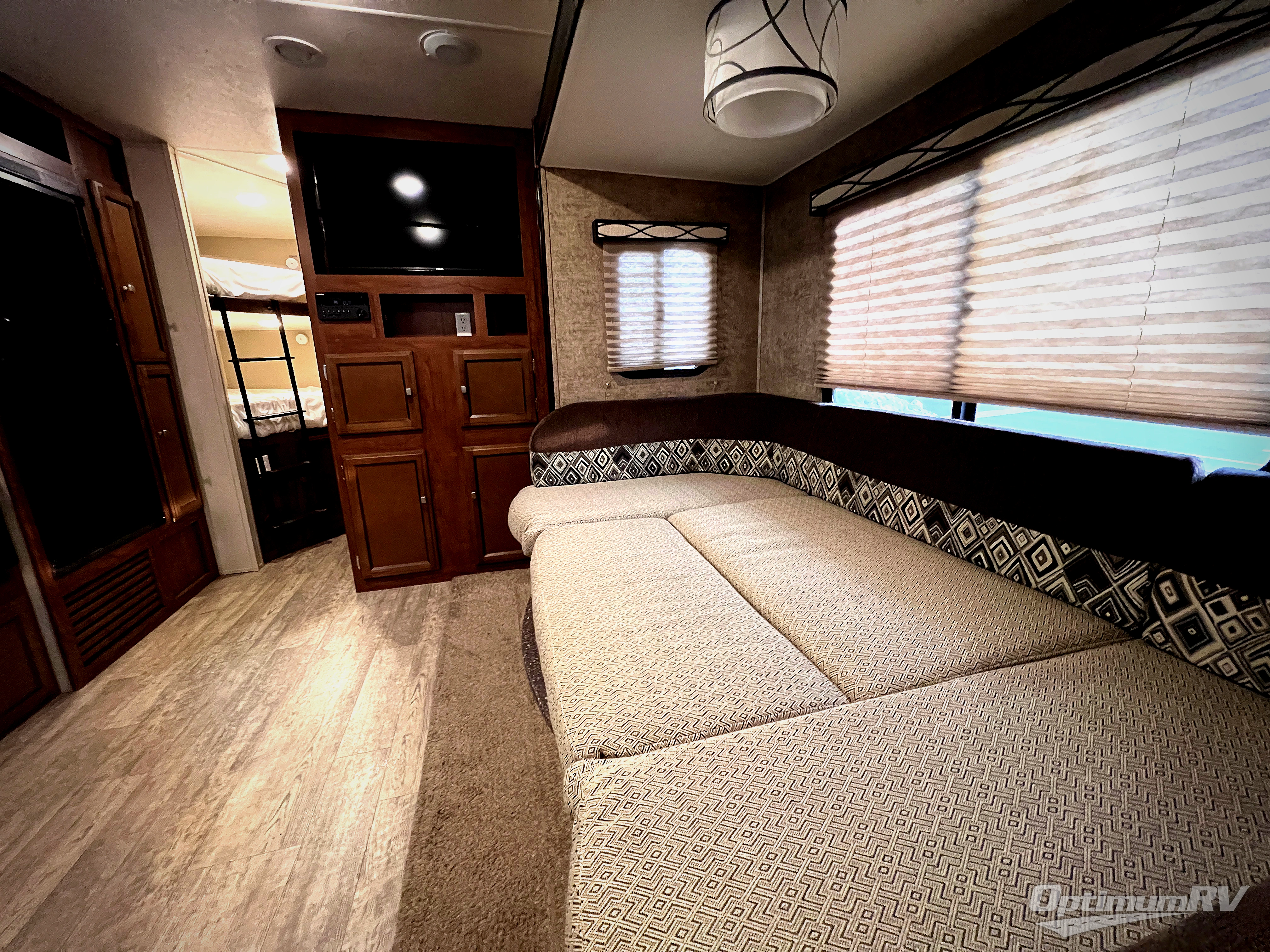 Straight in through the door you will find a sofa with storage overhead, and adjacent a slide out 88" wide u-shaped dinette. Both can also provide added sleeping space if needed at night. From either you can enjoy the entertainment center that is located just off the slide out dinette.