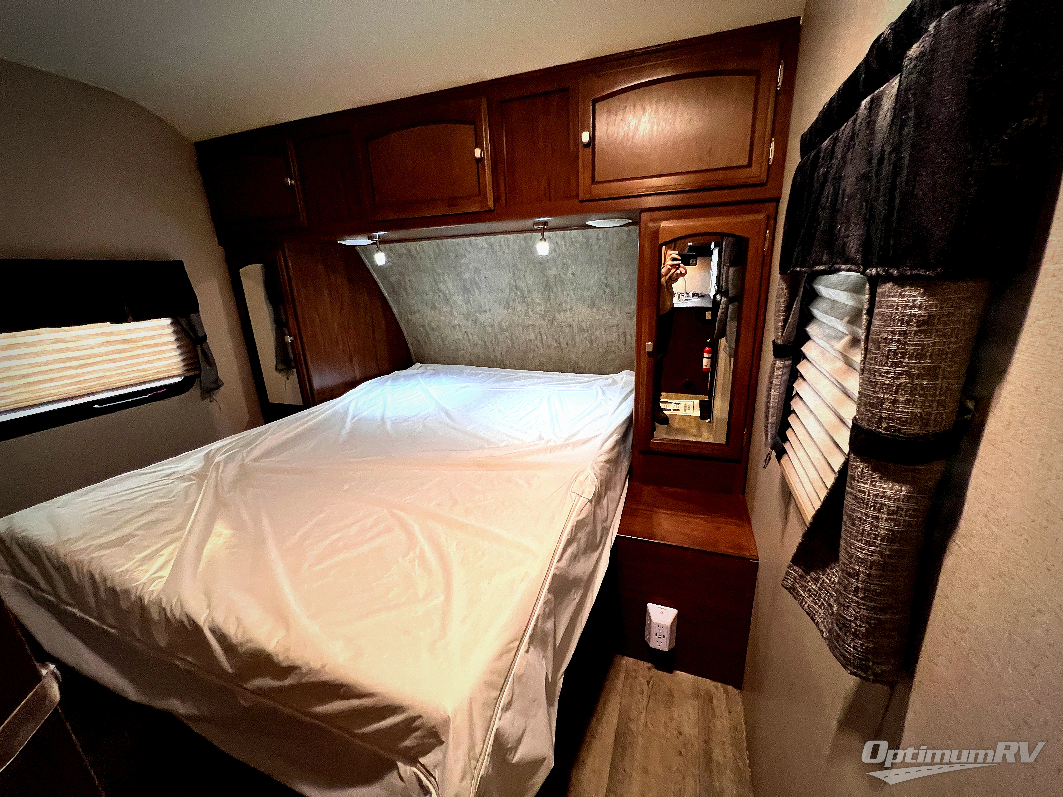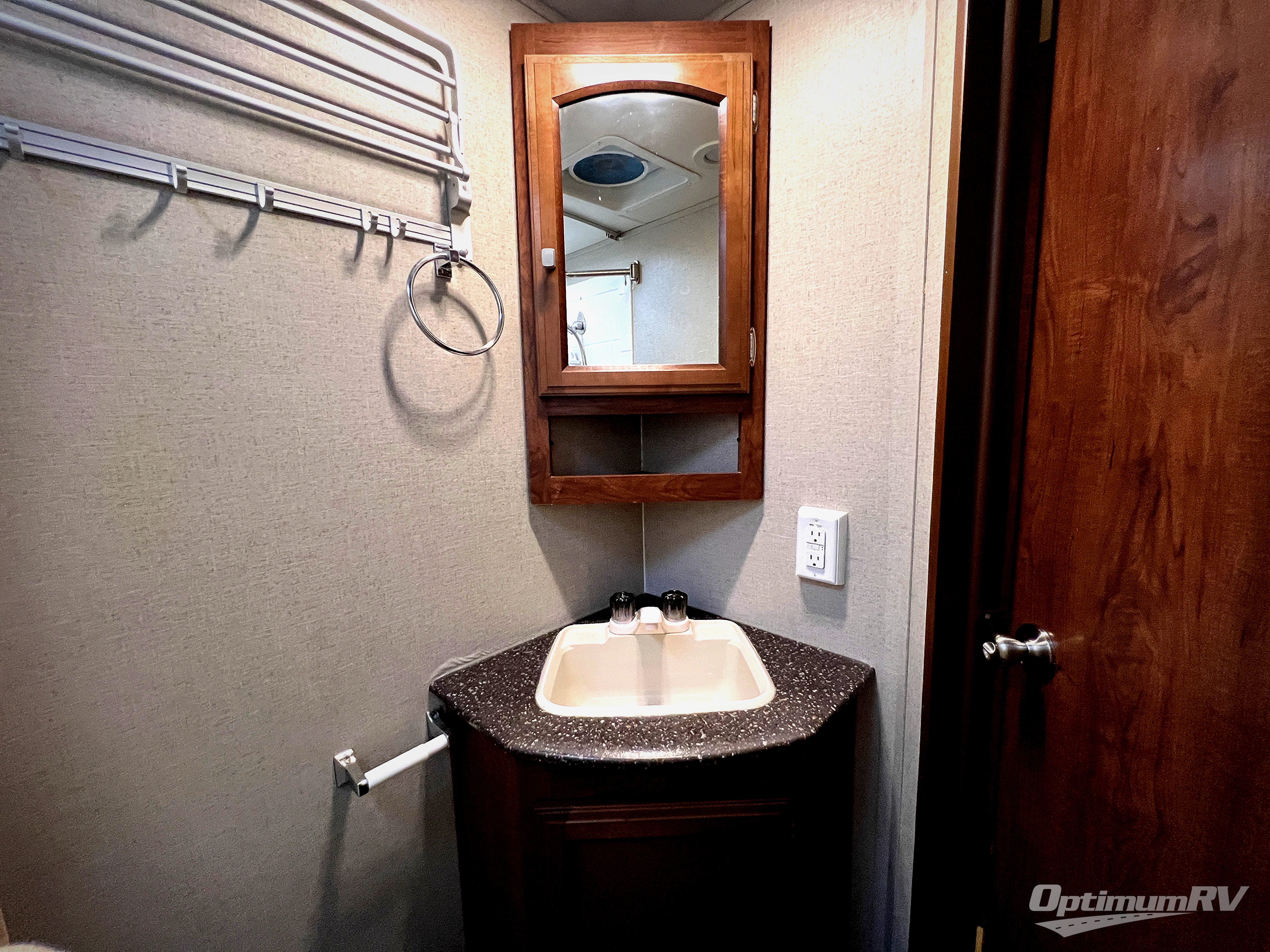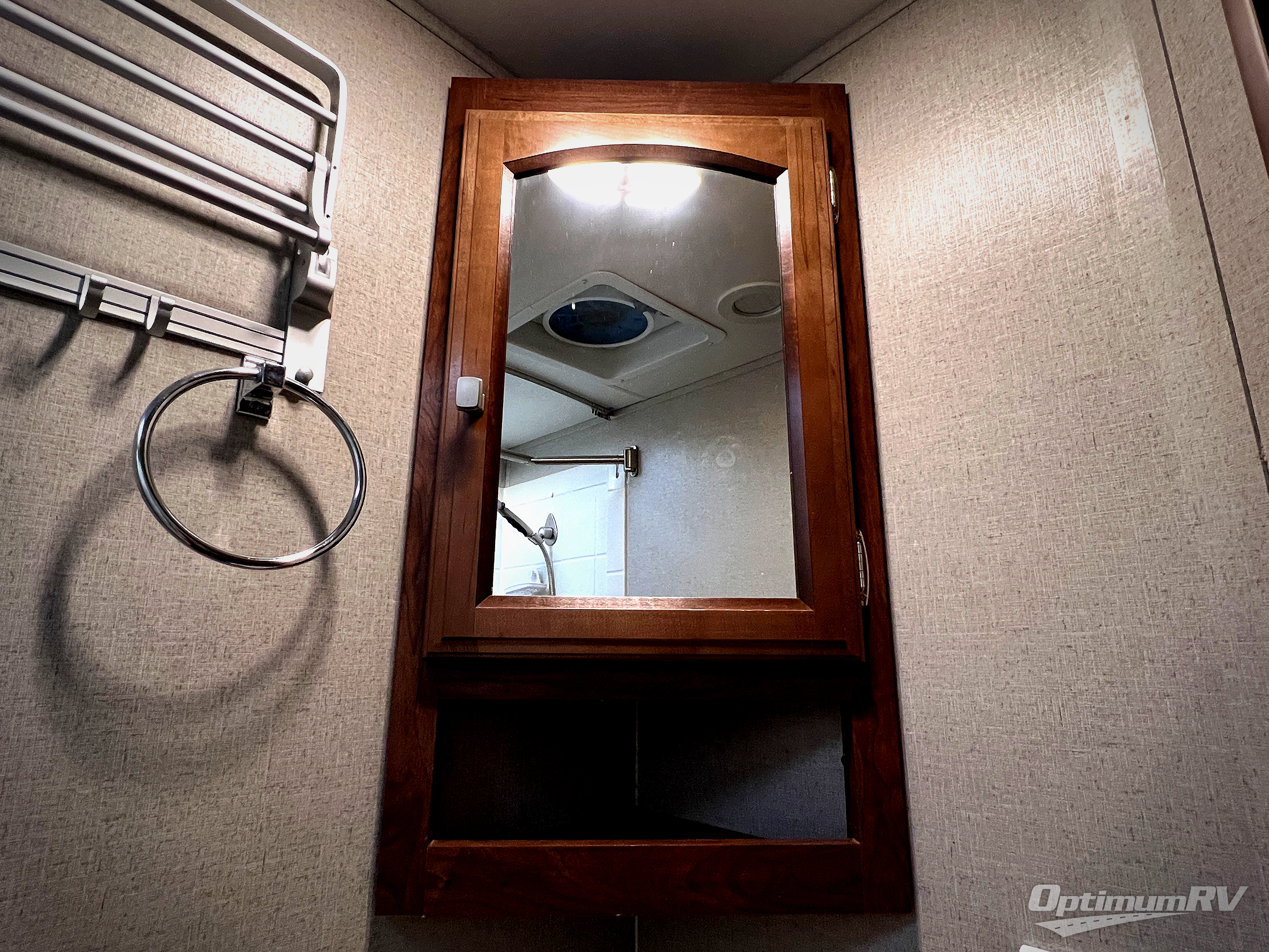 In the very rear of this model you will enjoy the convenience of a complete bath. In the rear right hand corner facing towards the back you have a tub/shower, toilet, and a corner vanity with sink. There is also an overhead medicine cabinet, plus a wardrobe for hanging clothes just outside the door.