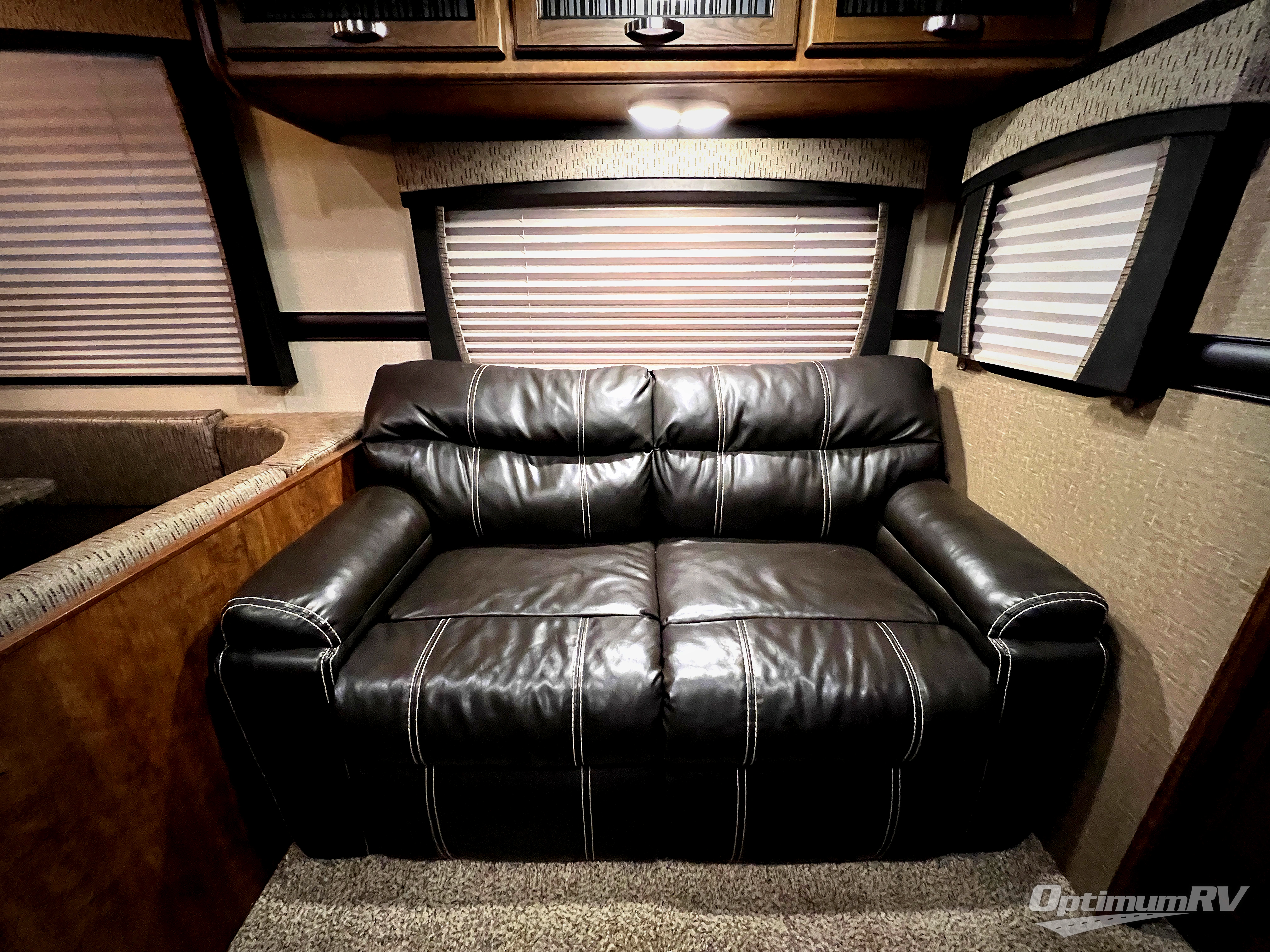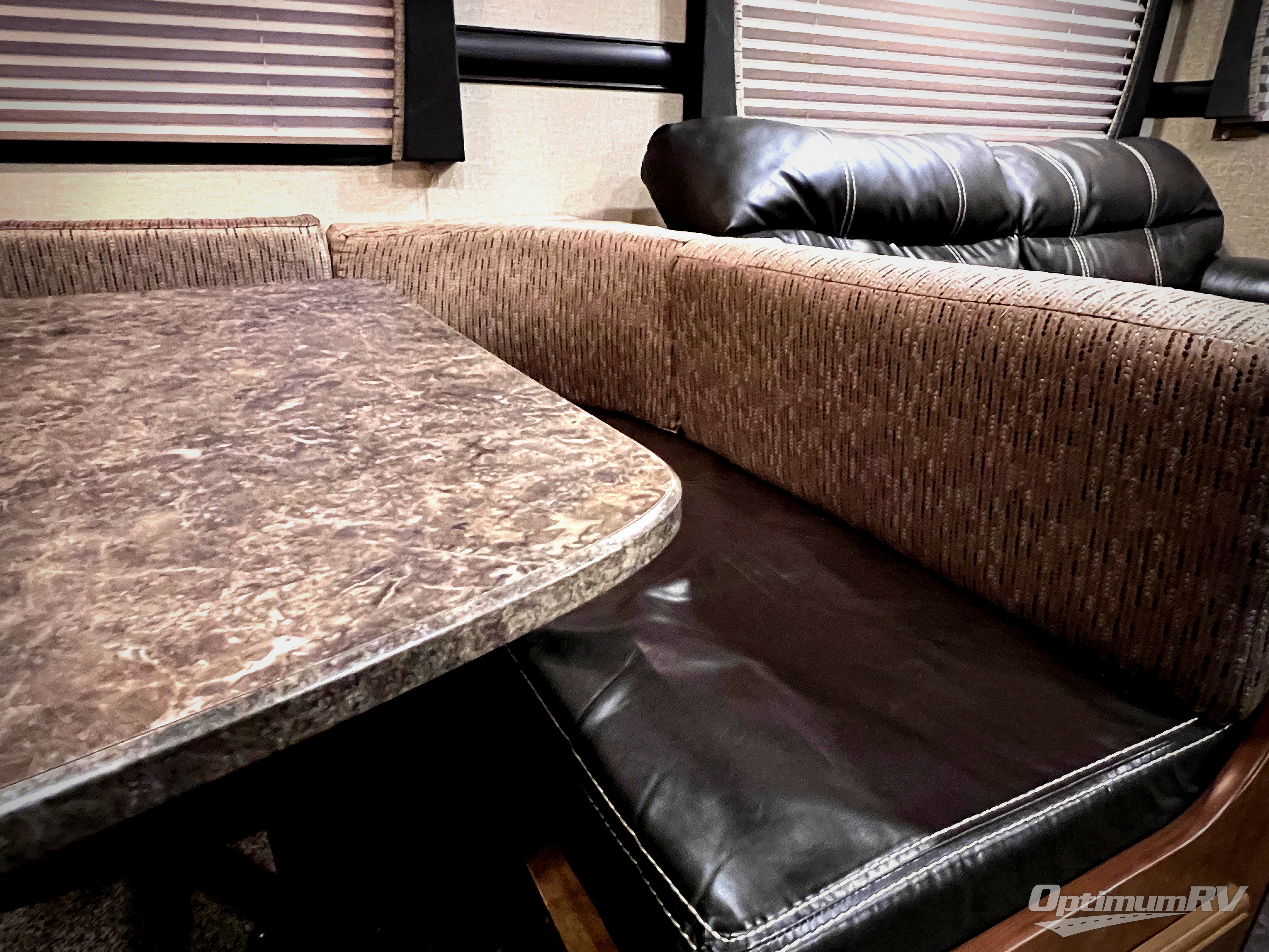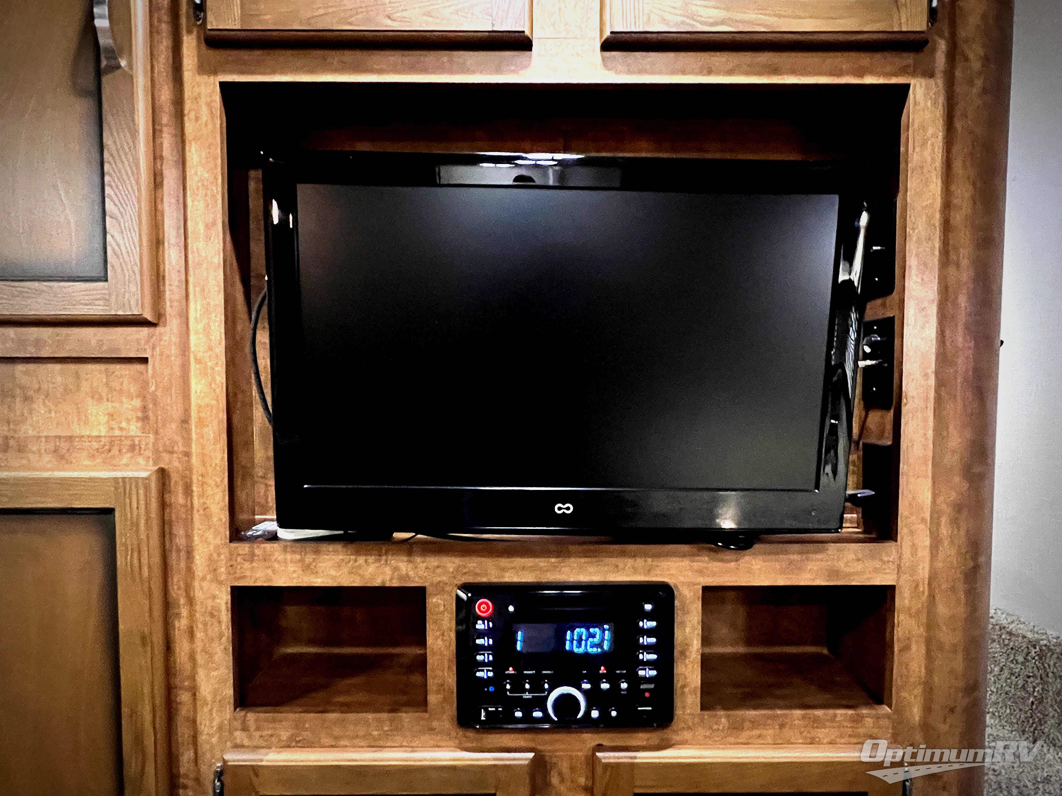 As you enter the fifth wheel, to the left is a double kitchen sink, range, microwave, and refrigerator. The opposite side has a slide with a sofa, overhead cabinet, and u-shaped dinette. Both the dinette and sofa convert into additional sleeping space at night. Next to the dinette you will find a large pantry. In the front of the living and kitchen areas there is a nice entertainment center.