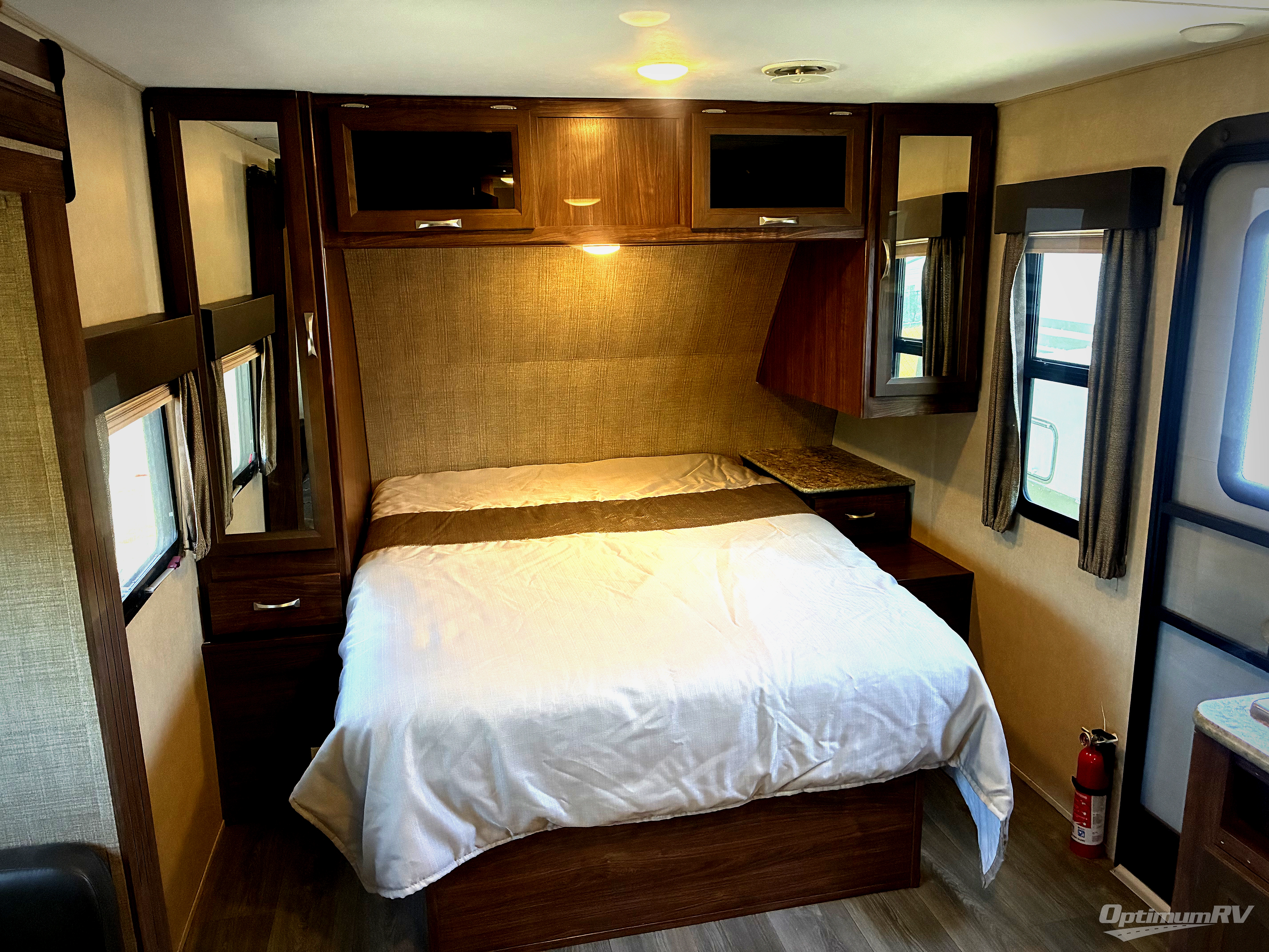 As you enter to your right there is a front queen bed with dual shirt closets and nightstands, plus a shelf for additional storage needs.