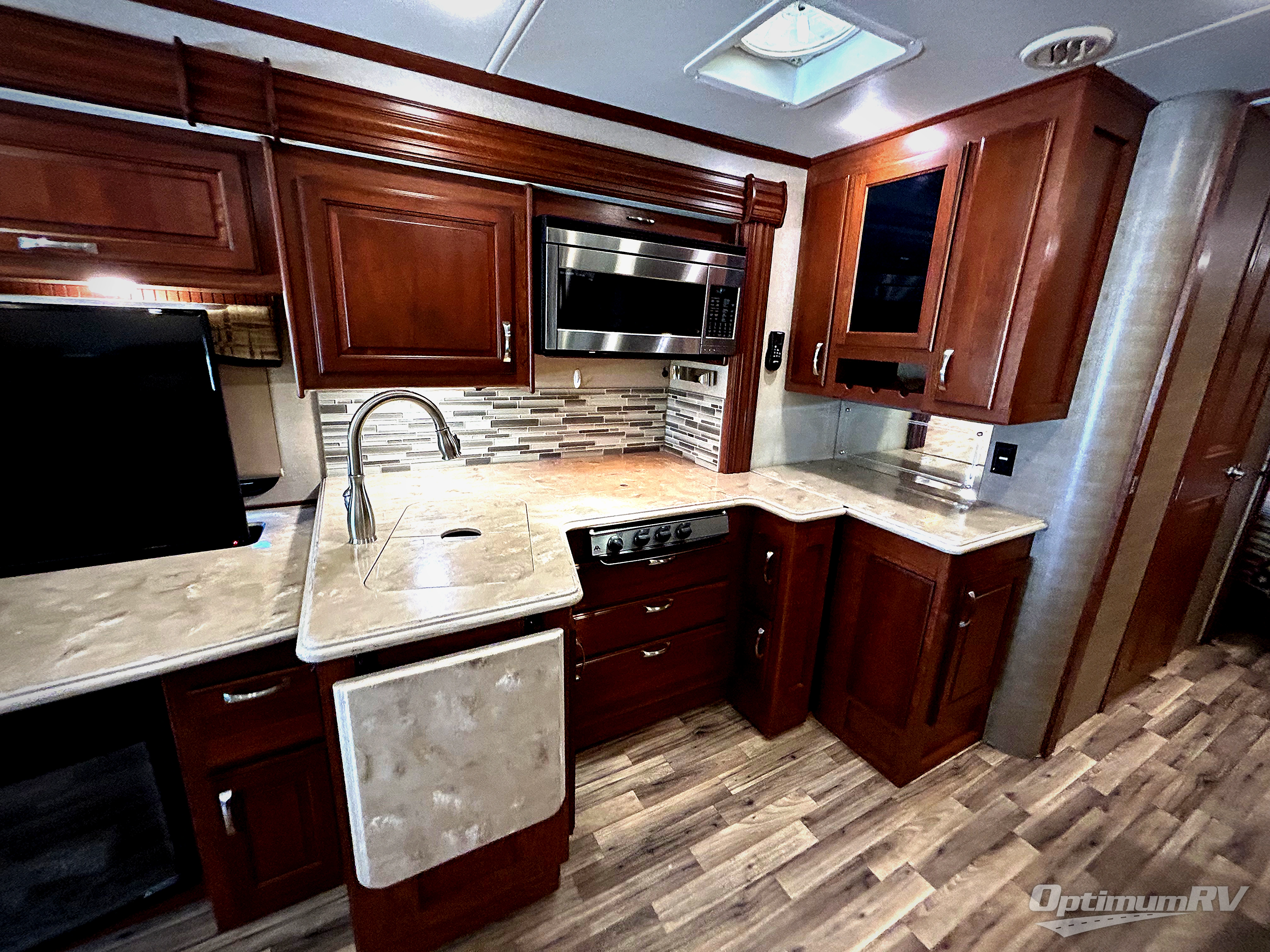 As you enter this model you will see to the left of the entrance, a slide with a lounge, double kitchen sink, three burner range, and microwave. Next to the slide out there is a large pantry. Along the opposite side of the motor home the slide has a Dream dinette and a hide-a-bed sofa with overhead cabinet. Next to the slide there is a refrigerator and additional pantry. Above the cab, the cab over bunk provides additional sleeping space. There is also a 39" TV on an electric swivel bracket in the cab.