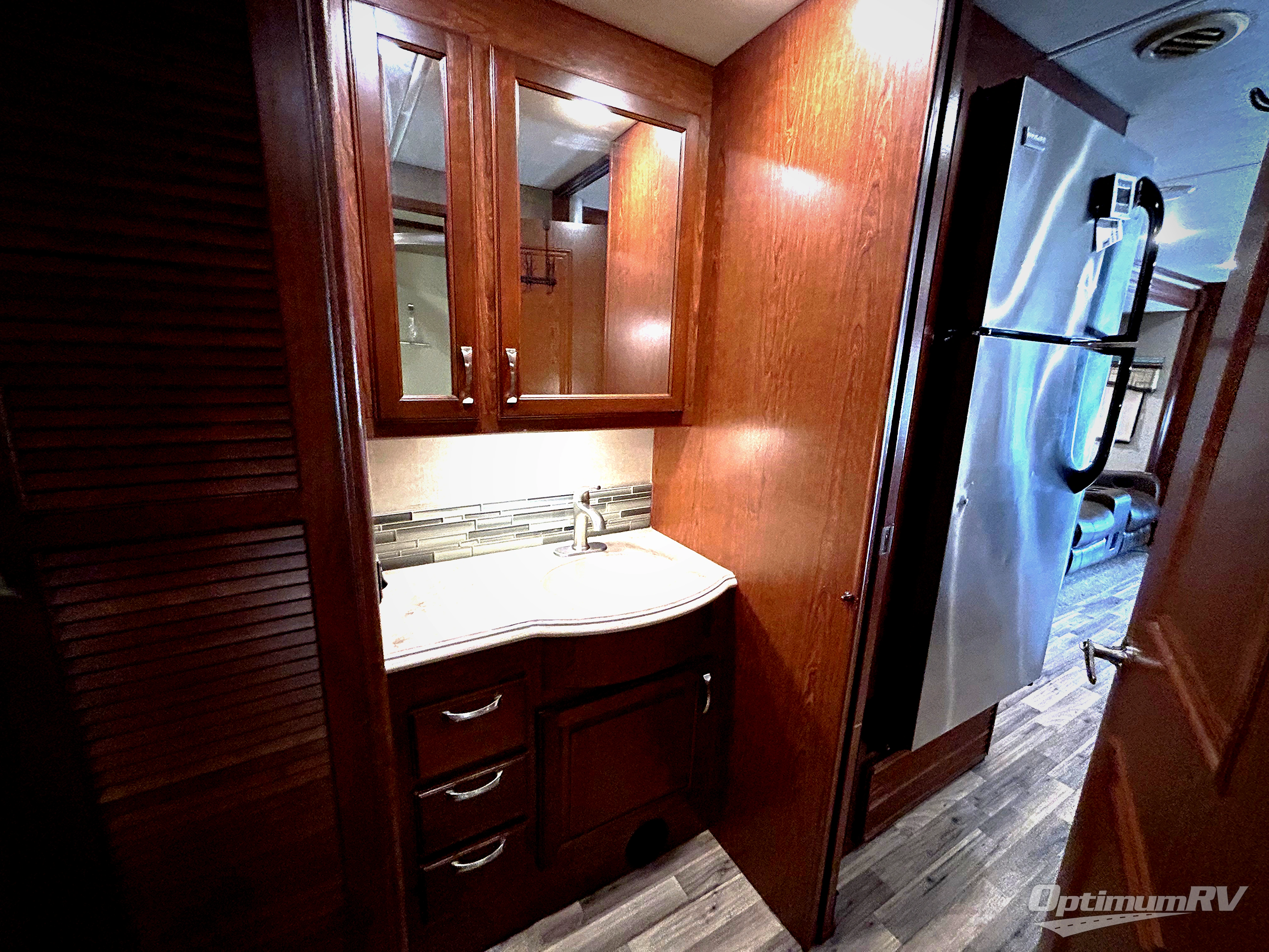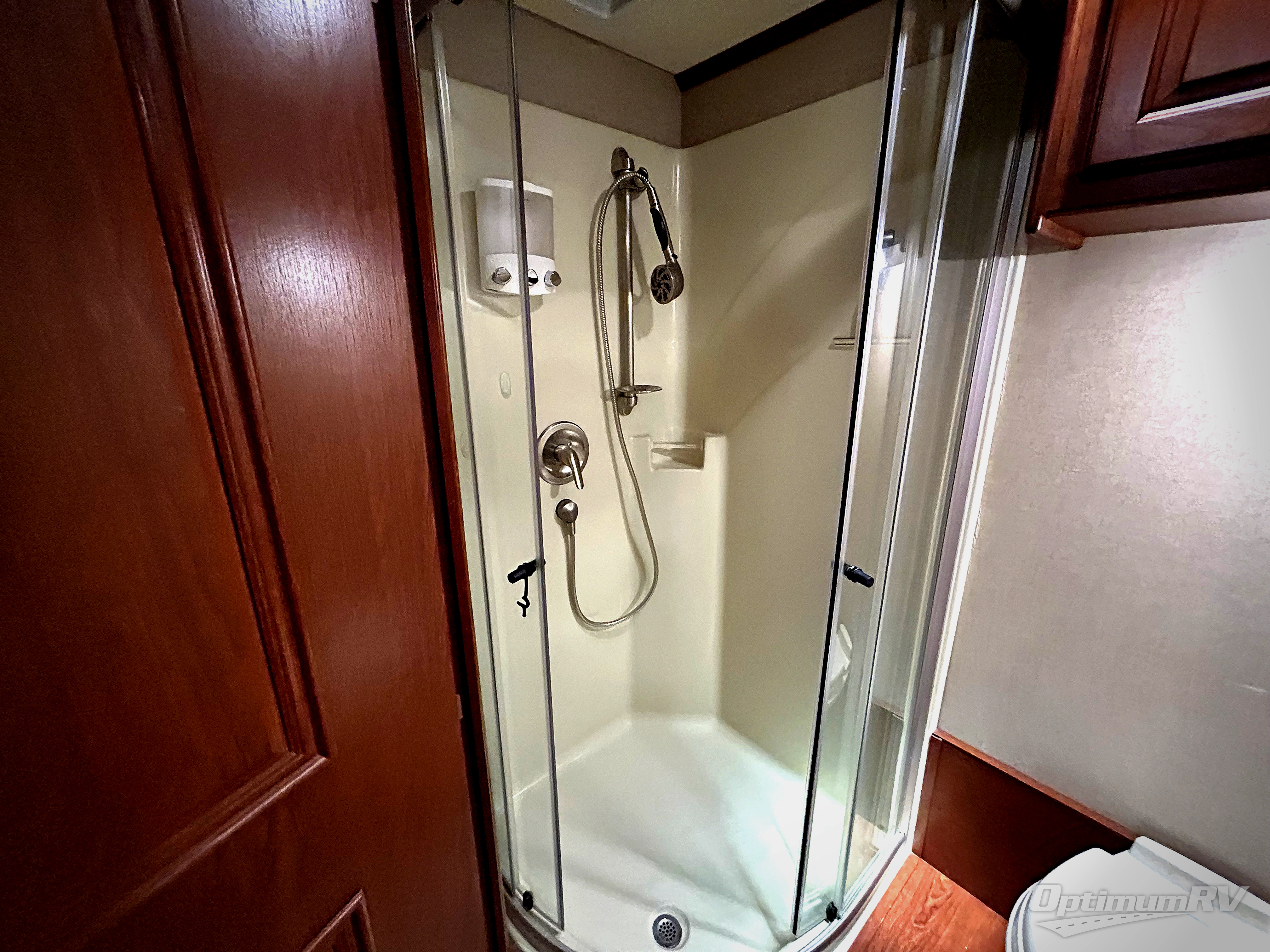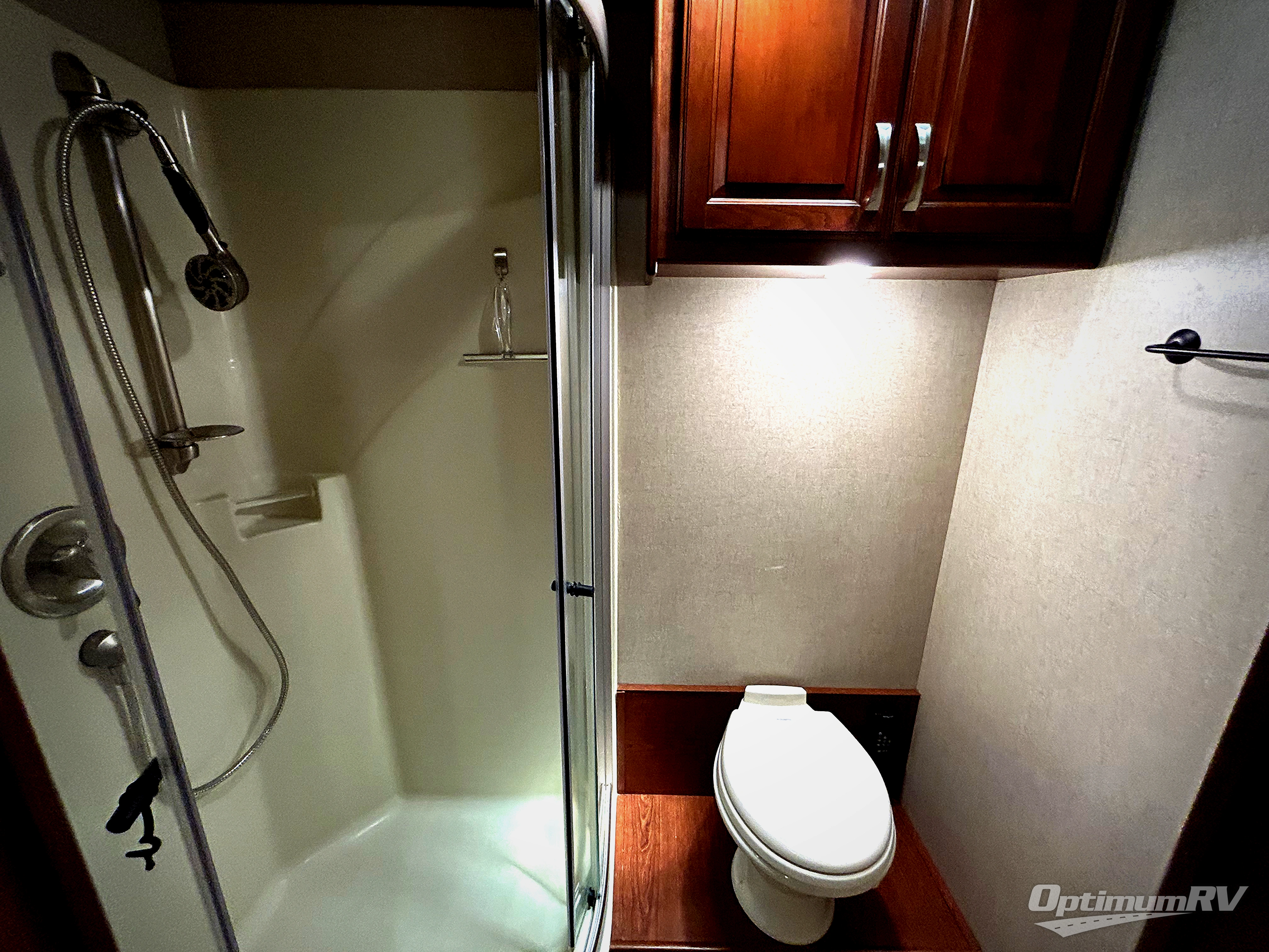 The bathroom has a private toilet and shower area on one side of the motor home. On the opposite side there is a sink and medicine cabinet.