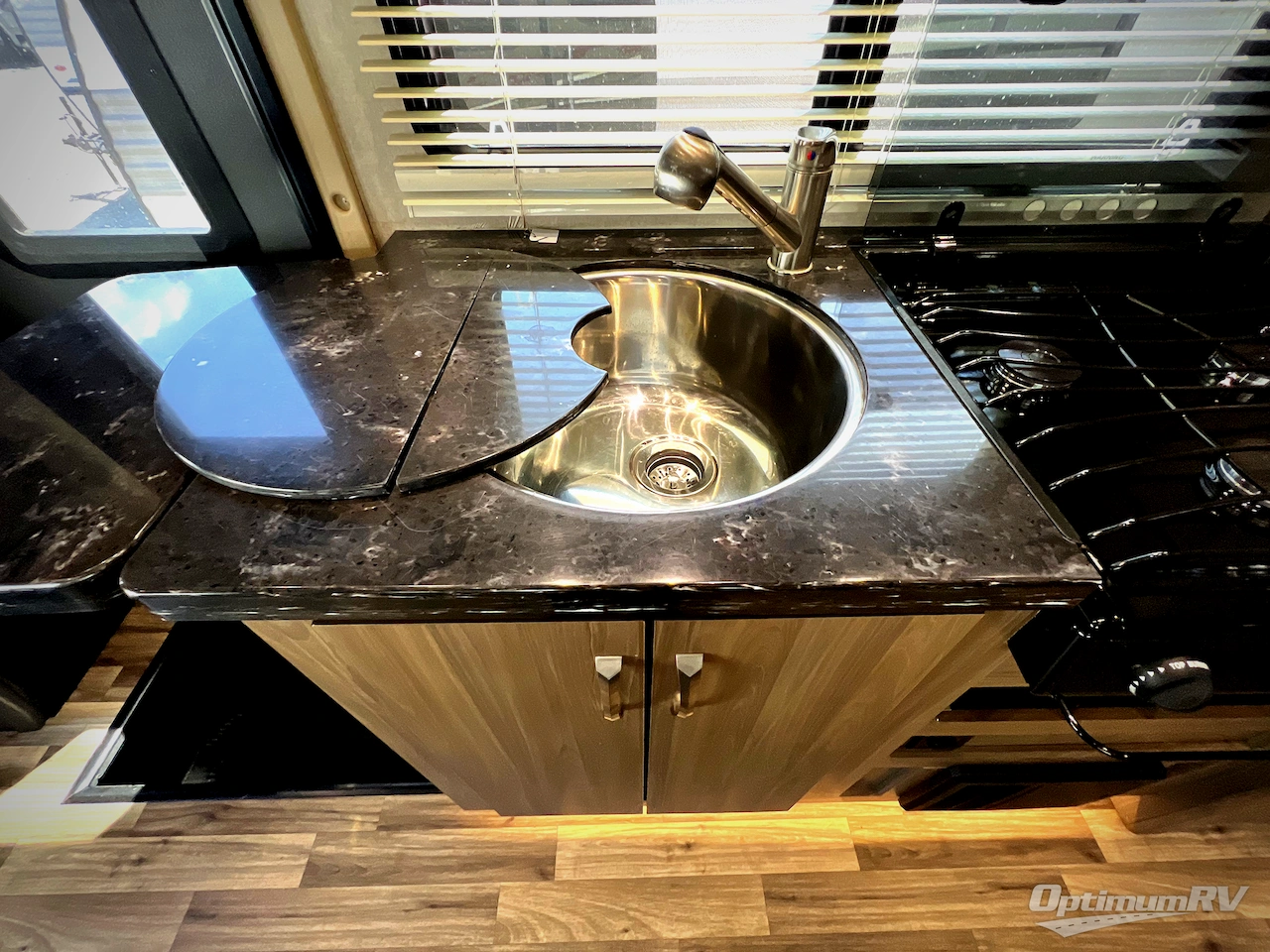 To the left of the main entry door you will find the kitchen appliances which include a round single bowl sink, a three burner range with overhead microwave oven, and a refrigerator. There is also overhead storage for dishes and things you might need. Here you can easily create great meals and snacks while on the move!