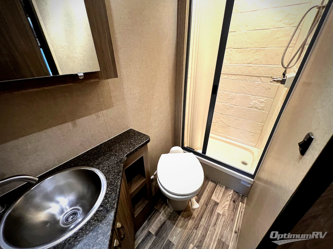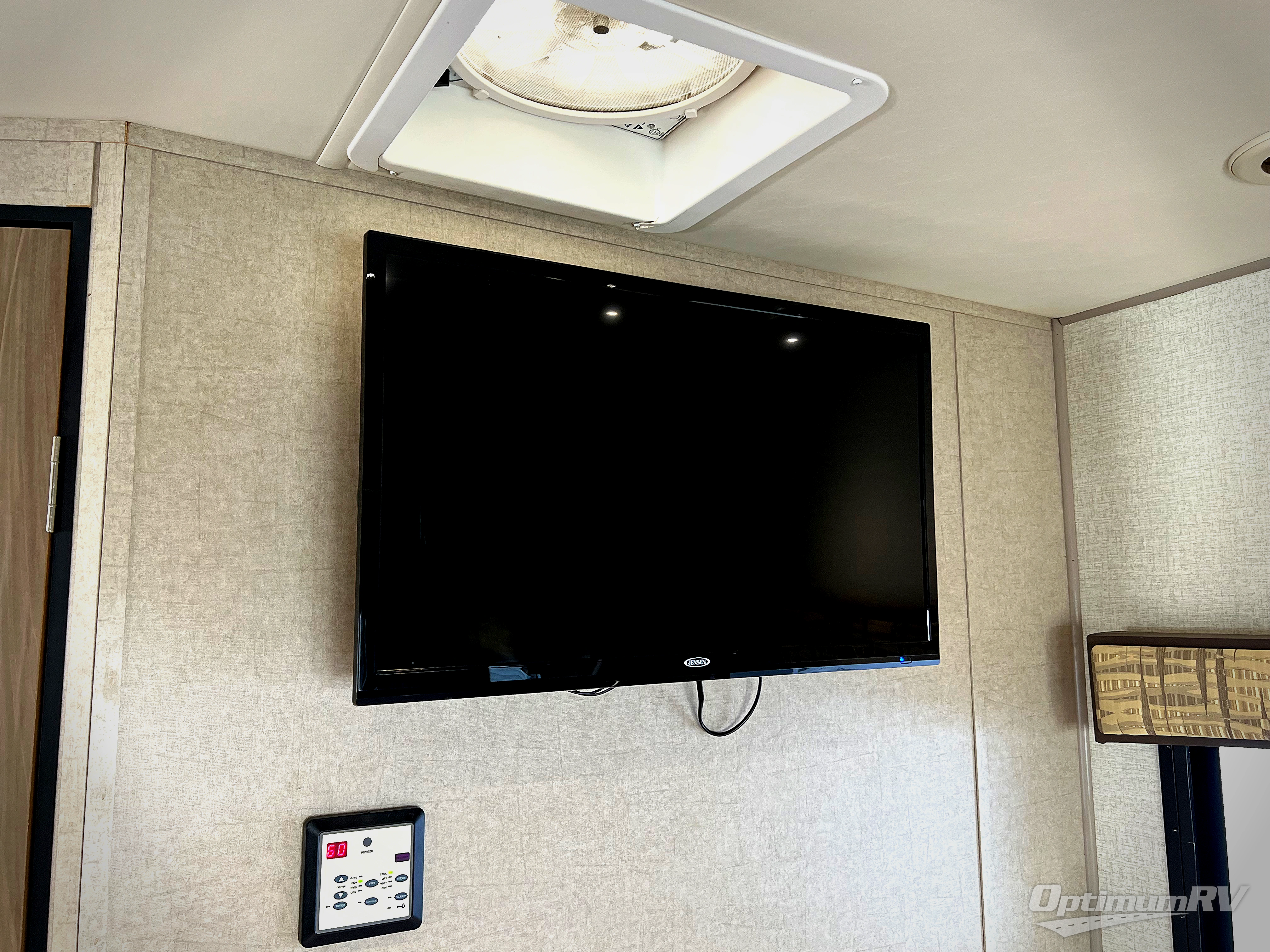 Step inside just behind the front passenger seat and find an overhead cabinet above the door. Above the cab you will find a 32" LED TV as well as overhead cabinets. There is a full wall slide out along the driver's side which creates a nice open feel inside. The slide contains a booth dinette, pantry, wardrobe, and queen size bed.