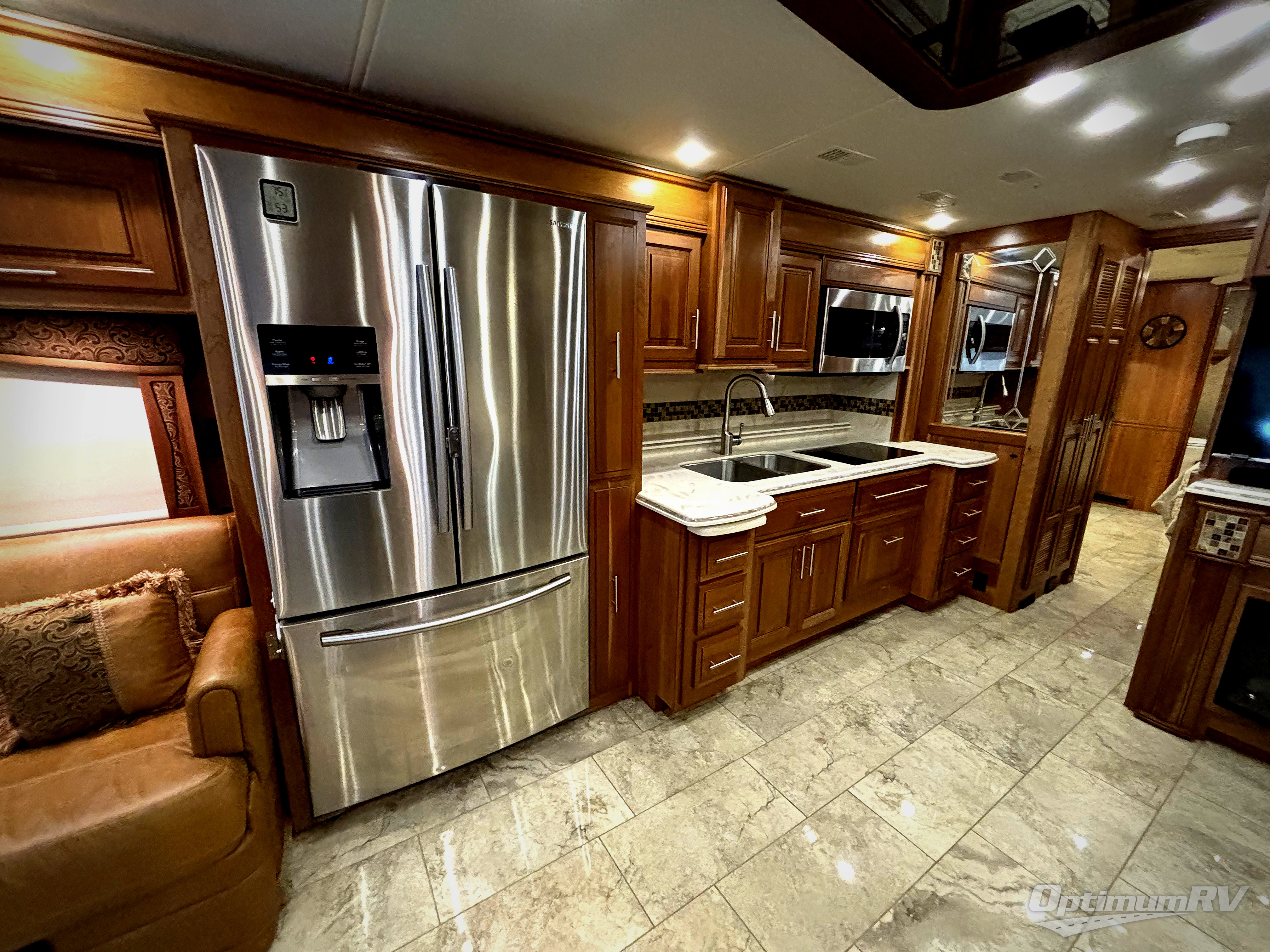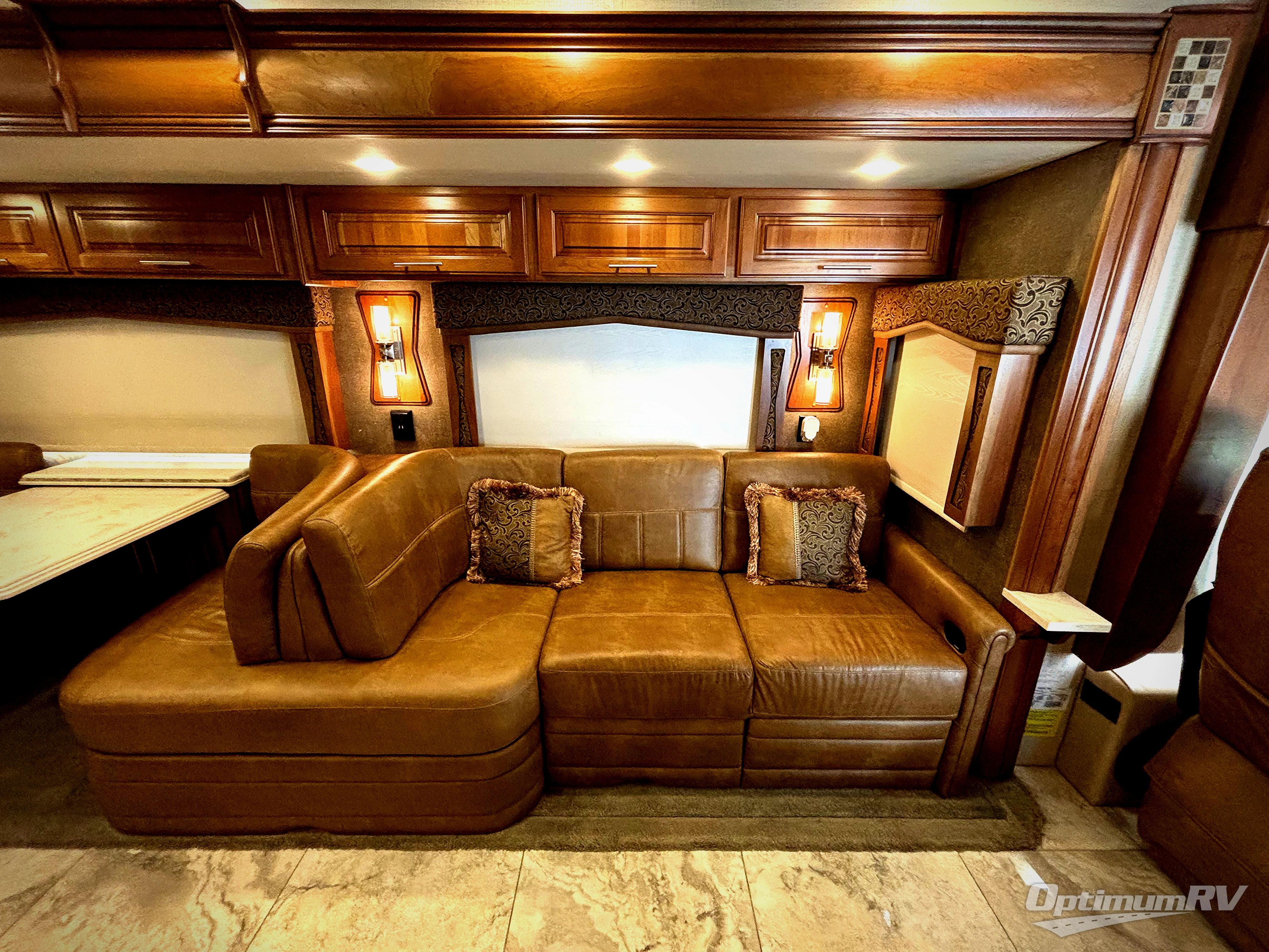 On the passenger side of the motor home, you will find a slide with a hide-a-bed sofa or an optional easy bed, a refrigerator, pantry, double kitchen sink, microwave, overhead cabinets, a shelf, and a two burner range. Next to the slide you will find a washer and dryer. The opposite side of the motor home has a slide with a sofa and dinette, or you can choose an optional free-standing table and desk with chairs plus a hide-a-bed. Next to the slide there is an entertainment center with a 48" LED TV, and a fireplace option.