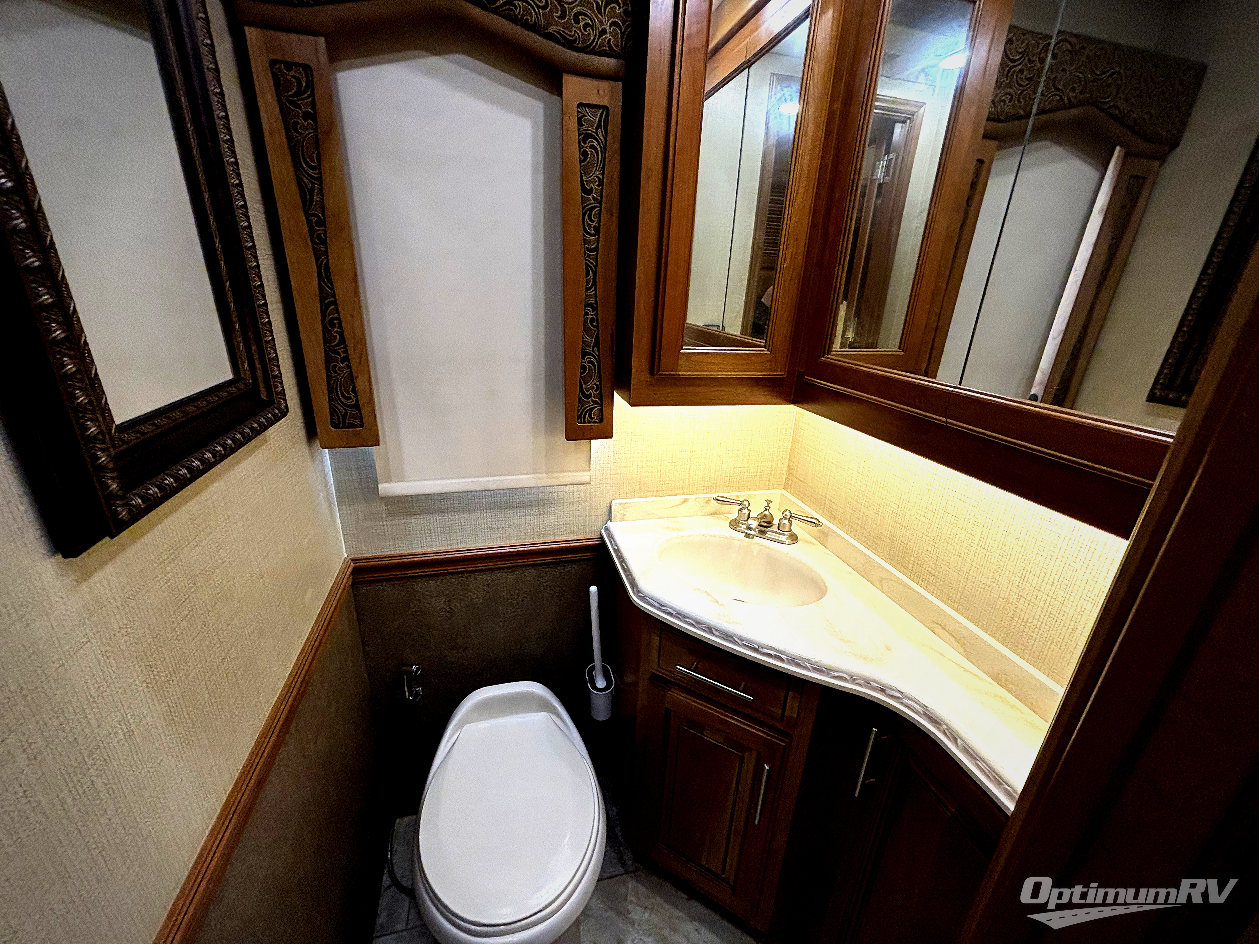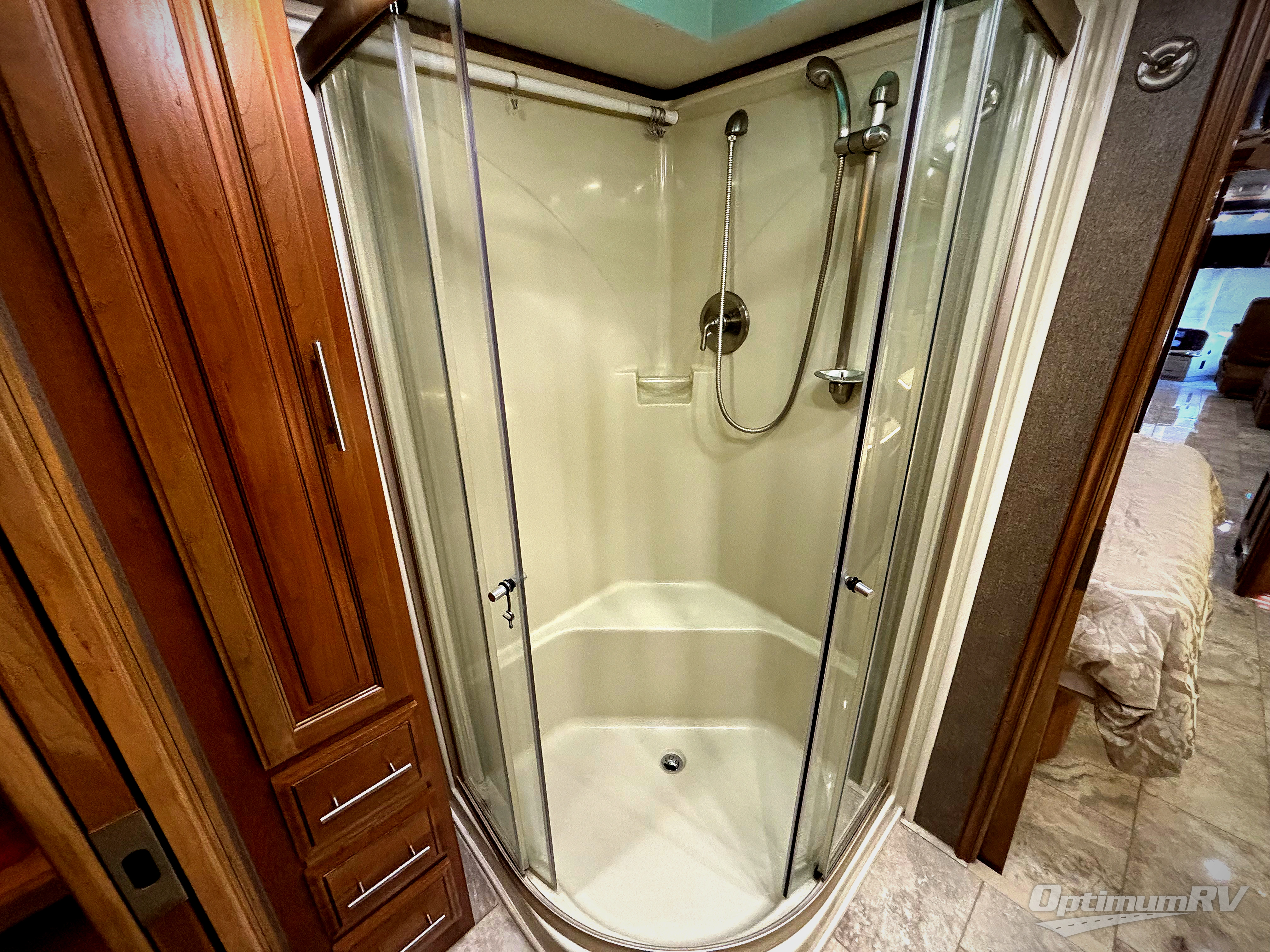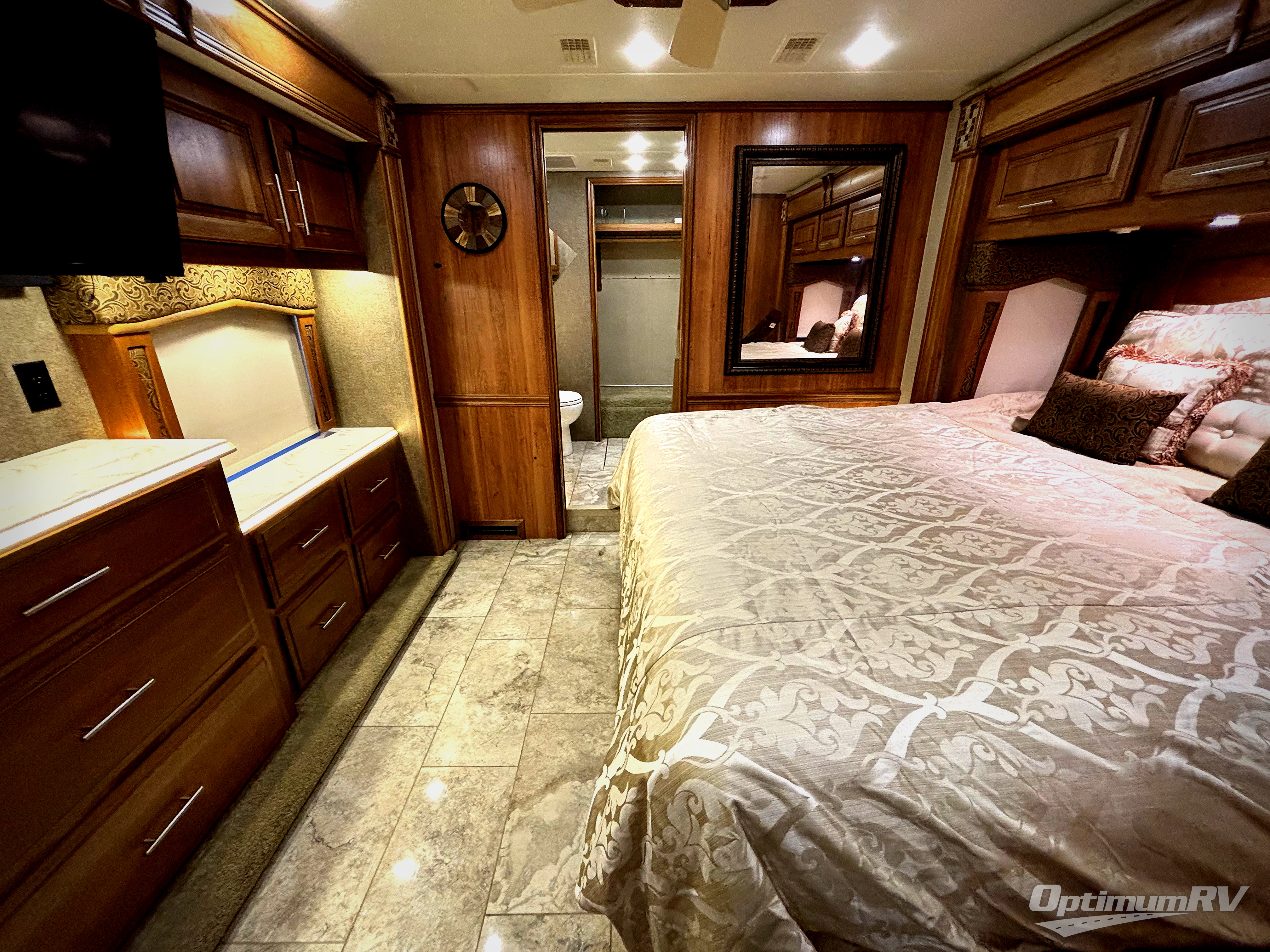 The bedroom offers a king bed slide with nightstands. Across from the bed there is a slide with a vanity and dresser, overhead cabinets, and a 32" LED TV. In the rear of the motor home you will find a master bath with a corner shower, linen cabinet, toilet, sink, and medicine cabinet. Along the full rear wall there is a wardrobe with sliding mirror doors.