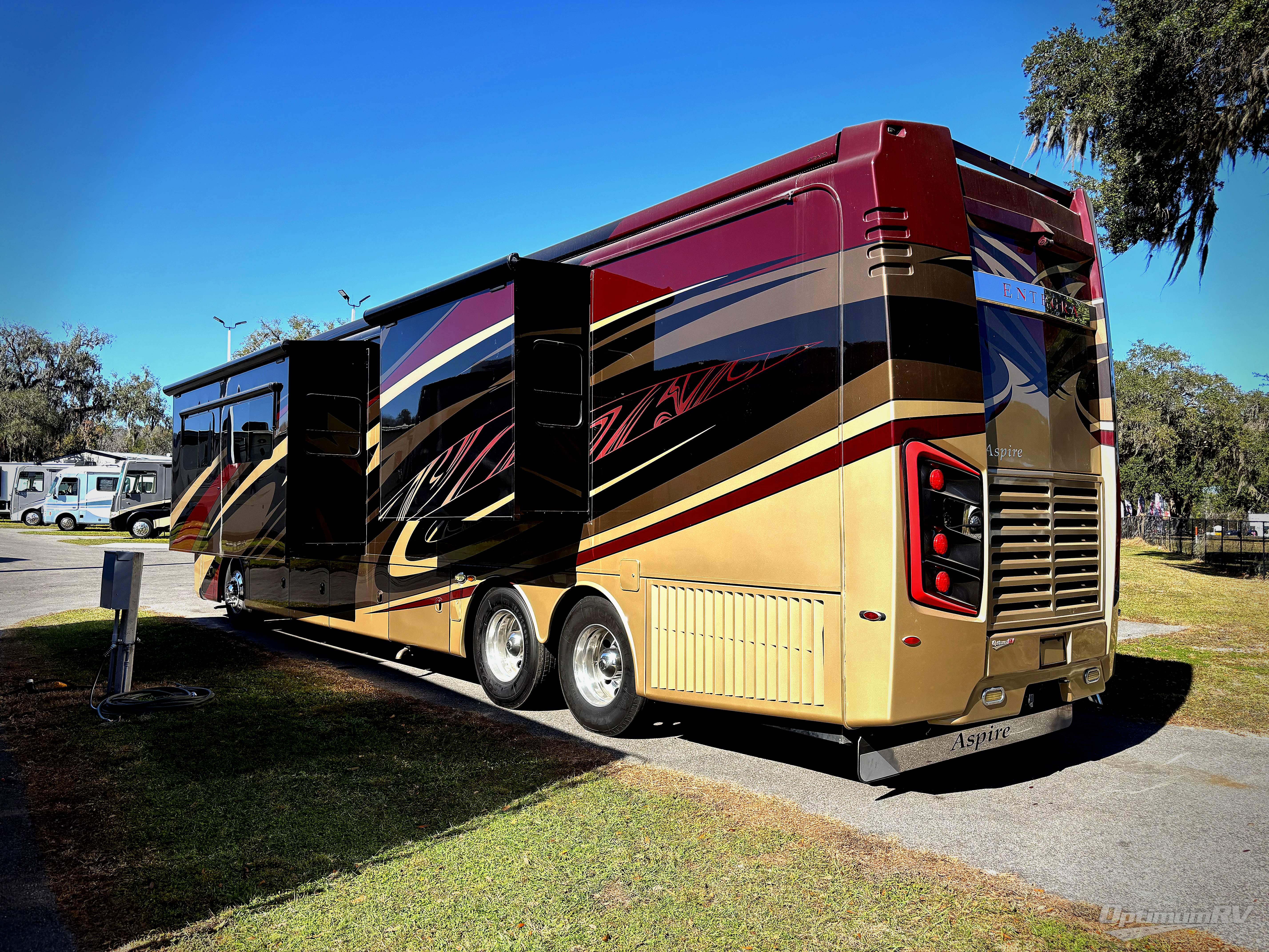 This Aspire 42RBQ class A diesel motor home by Entegra Coach offers quad slides for plenty of walking around room, a bath and a half, and an outside entertainment center with a 40" LED TV to watch your favorite shows in the great outdoors, plus more!