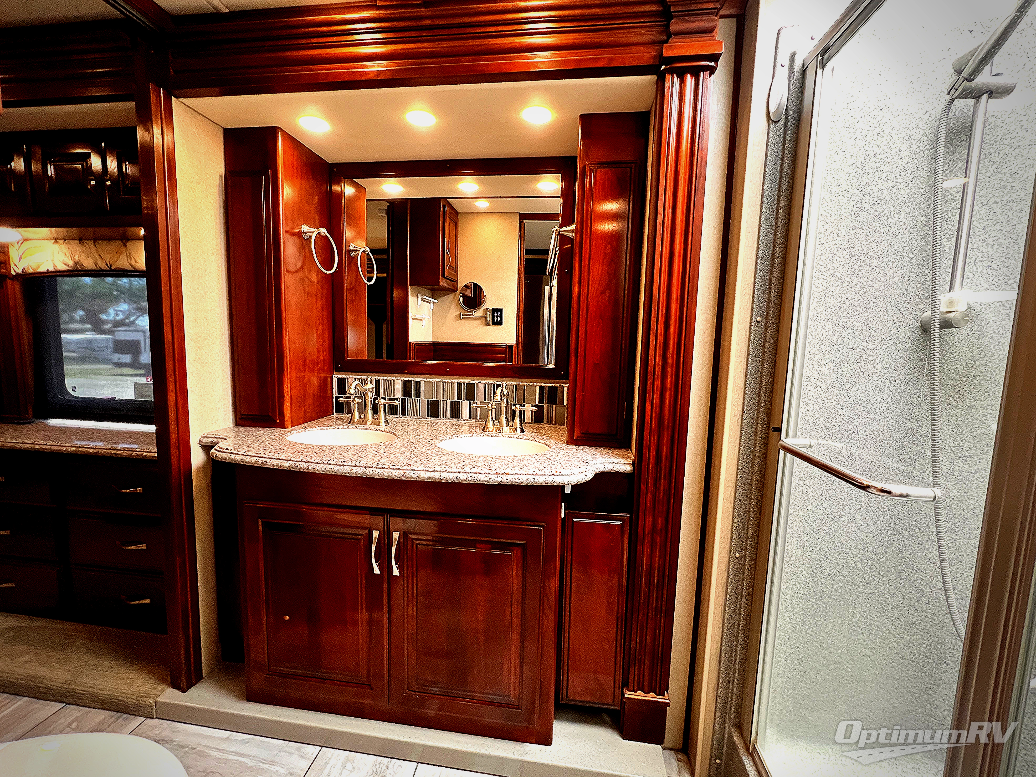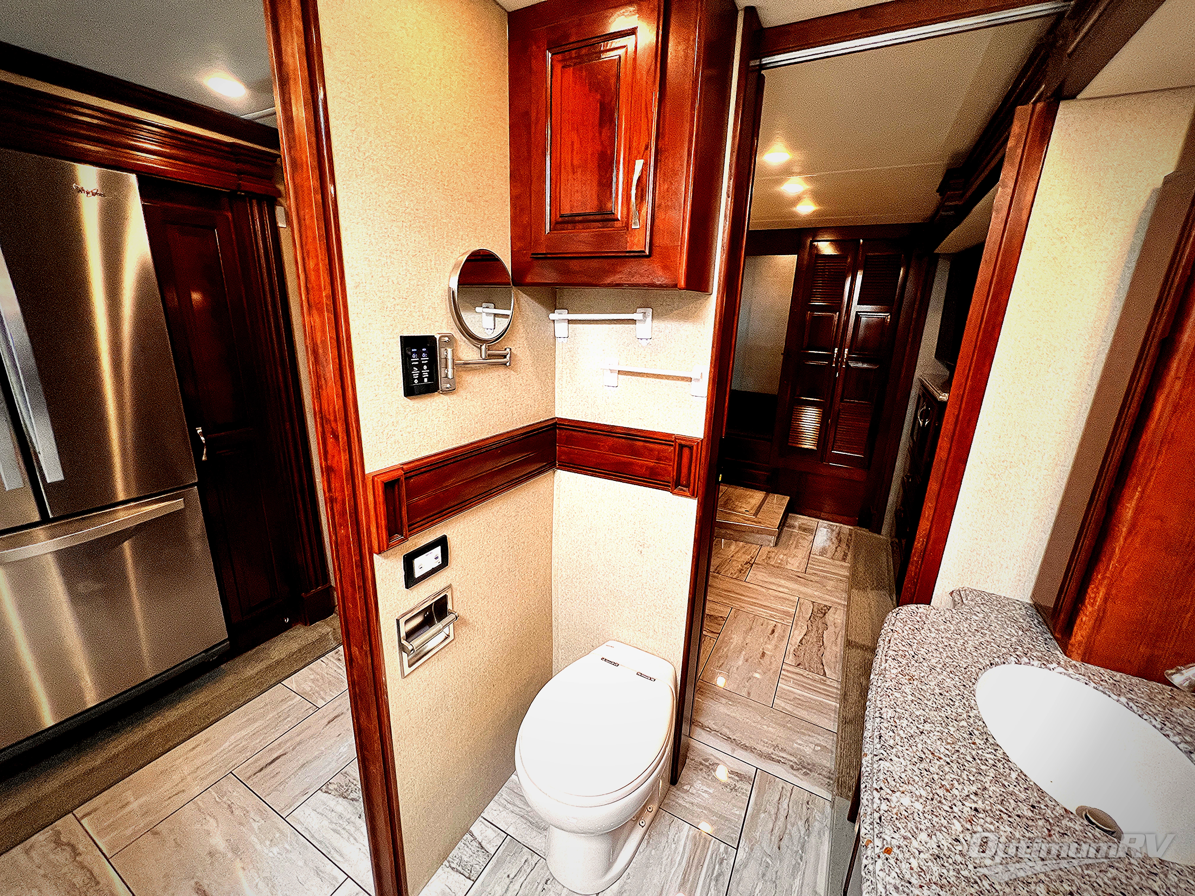 Enter into this model, and you will immediately notice dual opposing slide outs in the front of the motor home. Along the curb side the slide out features a 74"x44" dinette, a galley with a pull out counter, three burner cooktop, overhead microwave, double kitchen sink, overhead cabinet, pantry, residential refrigerator, and a broom closet. Along the opposite side of the motor home there is a sofa L-transformer, a lounge chair, and an overhead cabinet. Adjacent to the slide out, along the interior wall, there is a 40" LED TV for your viewing pleasure.