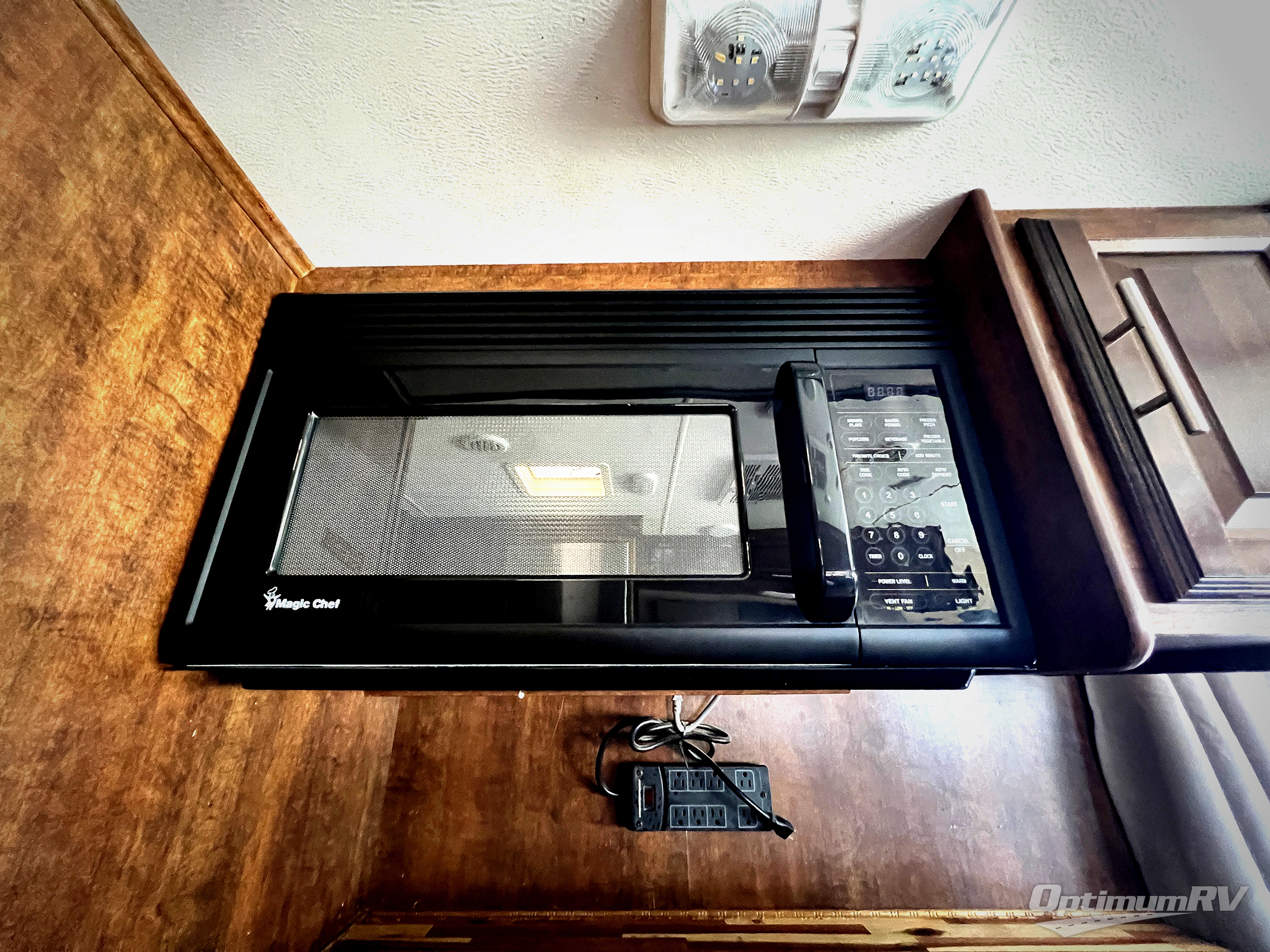 As you enter the motor home, on the left you will find a jackknife sofa with footrests, refrigerator, and a pantry. On the opposite side there is a slide out with a wrap-around booth dinette, residential microwave, and three burner range, plus a pullout countertop. Adjacent to the slide you will find a double kitchen sink, another pullout countertop extension, and a 32" LED TV.
