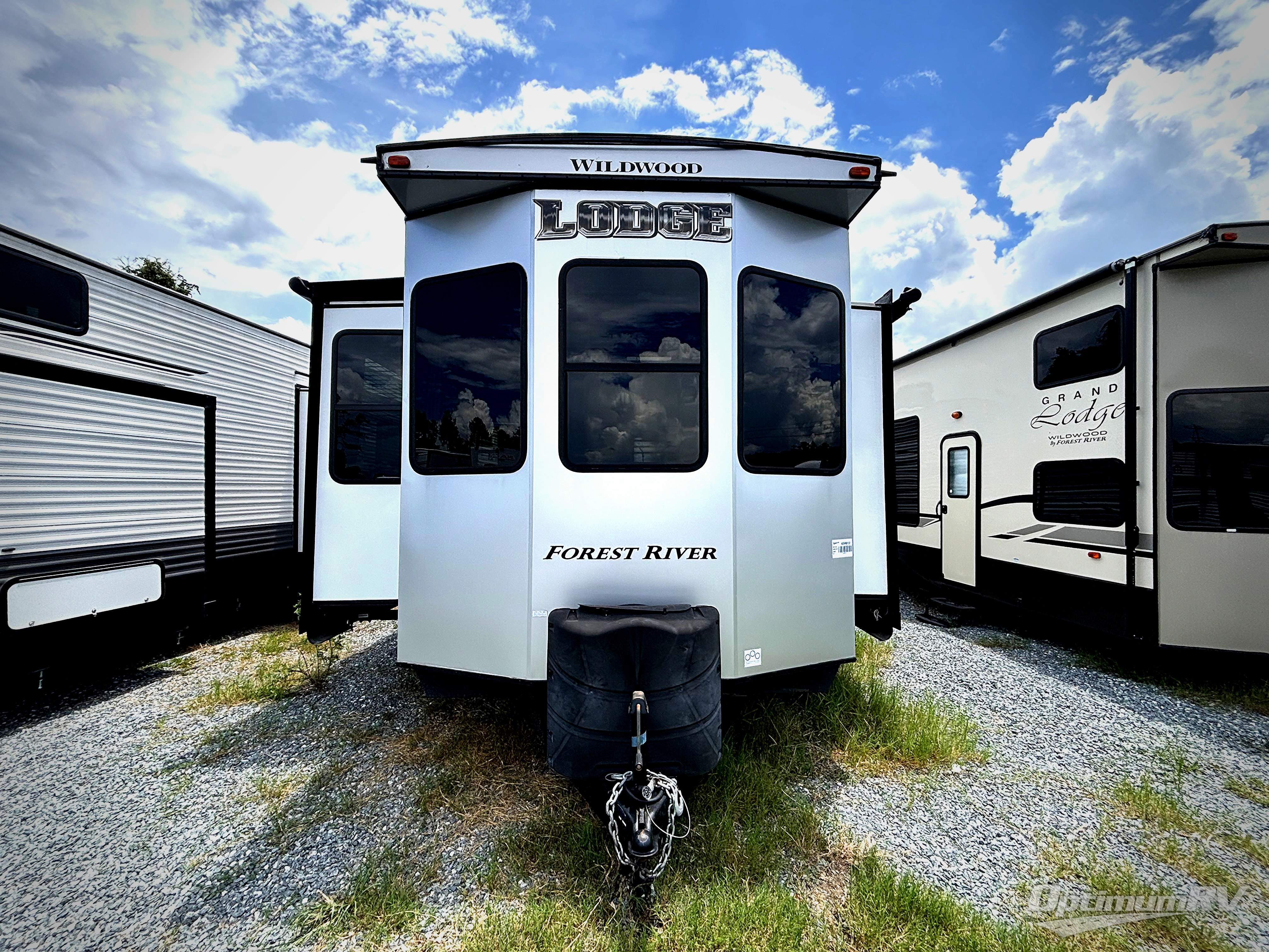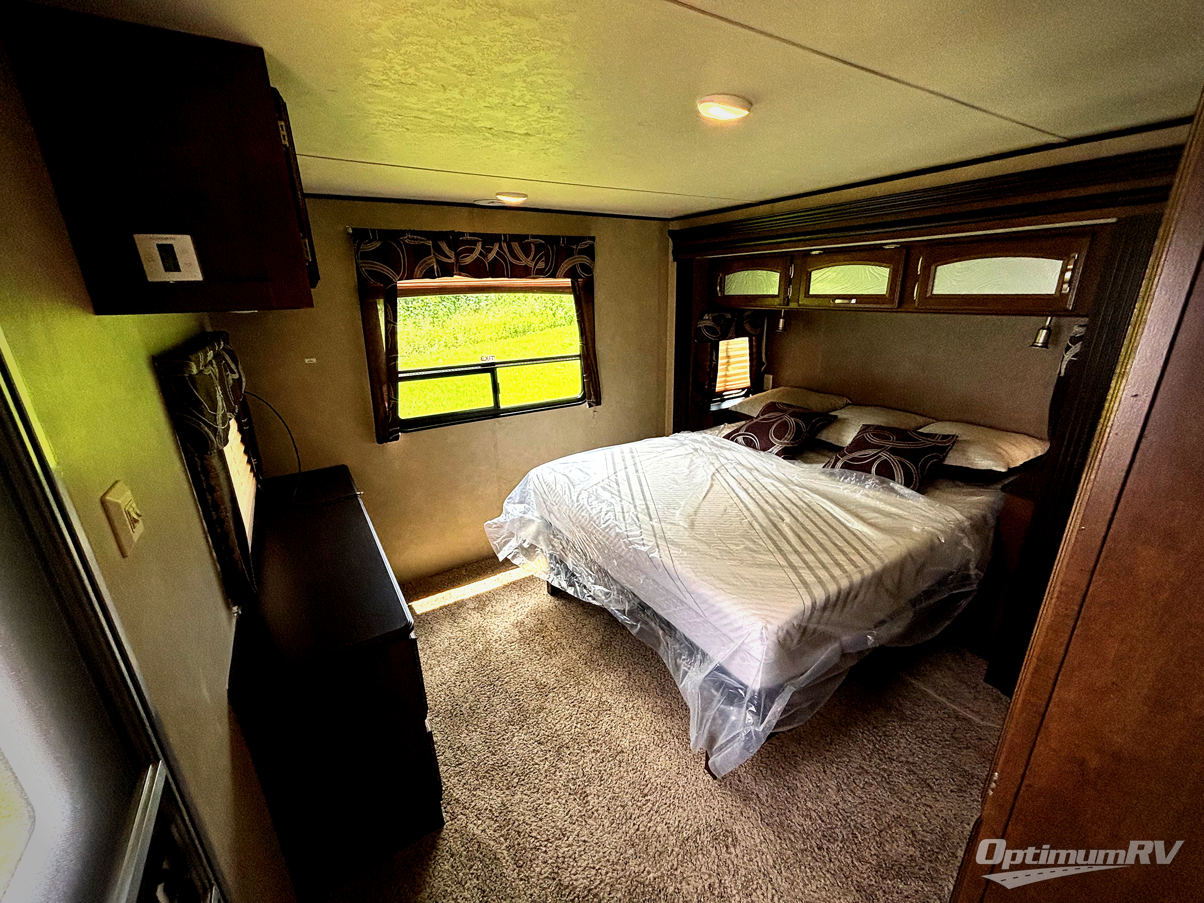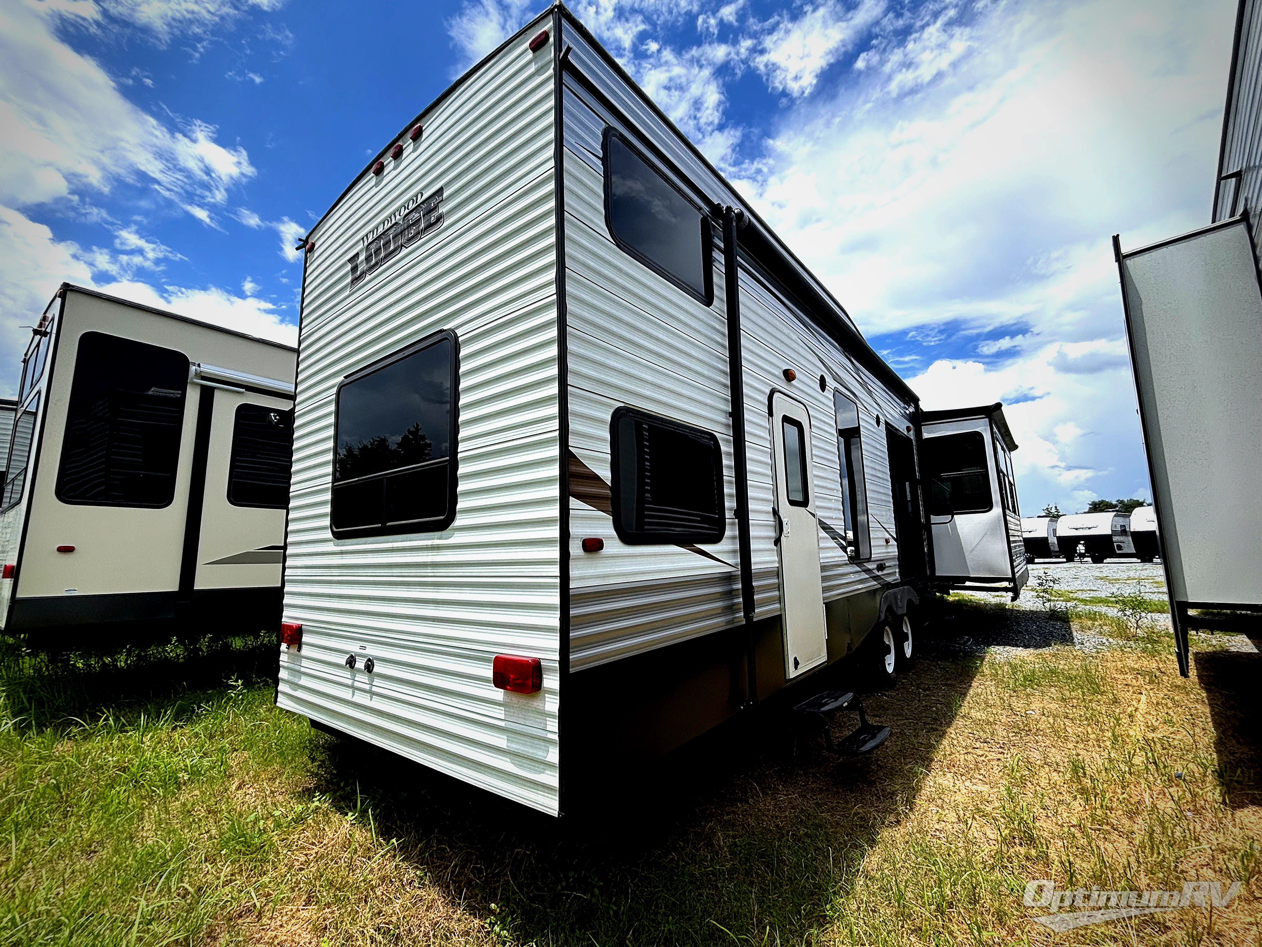 As you enter the rear entrance of the Wildwood Lodge 4092BFL destination trailer by Forest River, you will be in the rear bedroom. Along one wall there is a dresser, the opposite side of the trailer has a slide out with a queen bed. There is also a wardrobe and an optional washer/dryer along the interior wall.