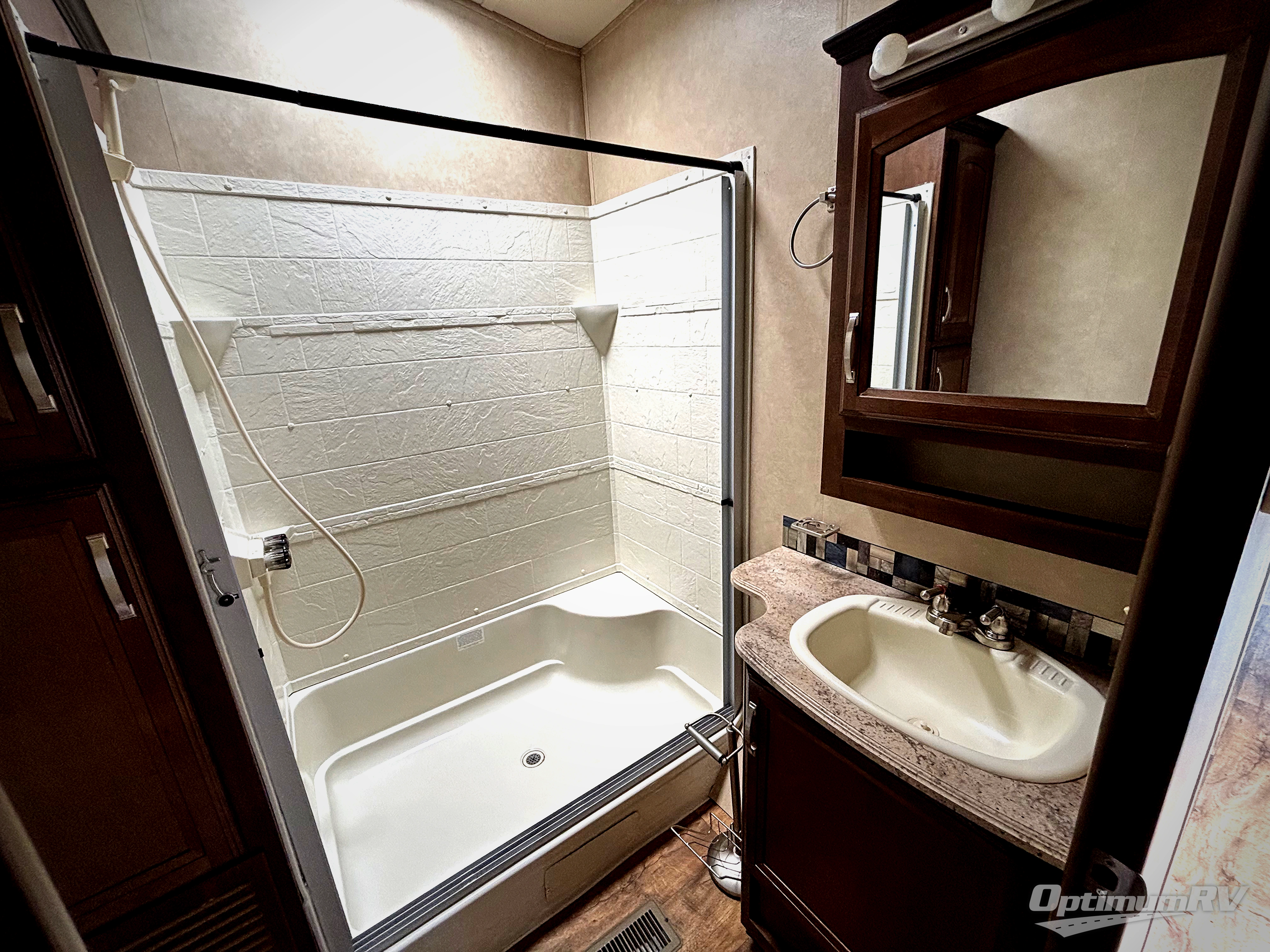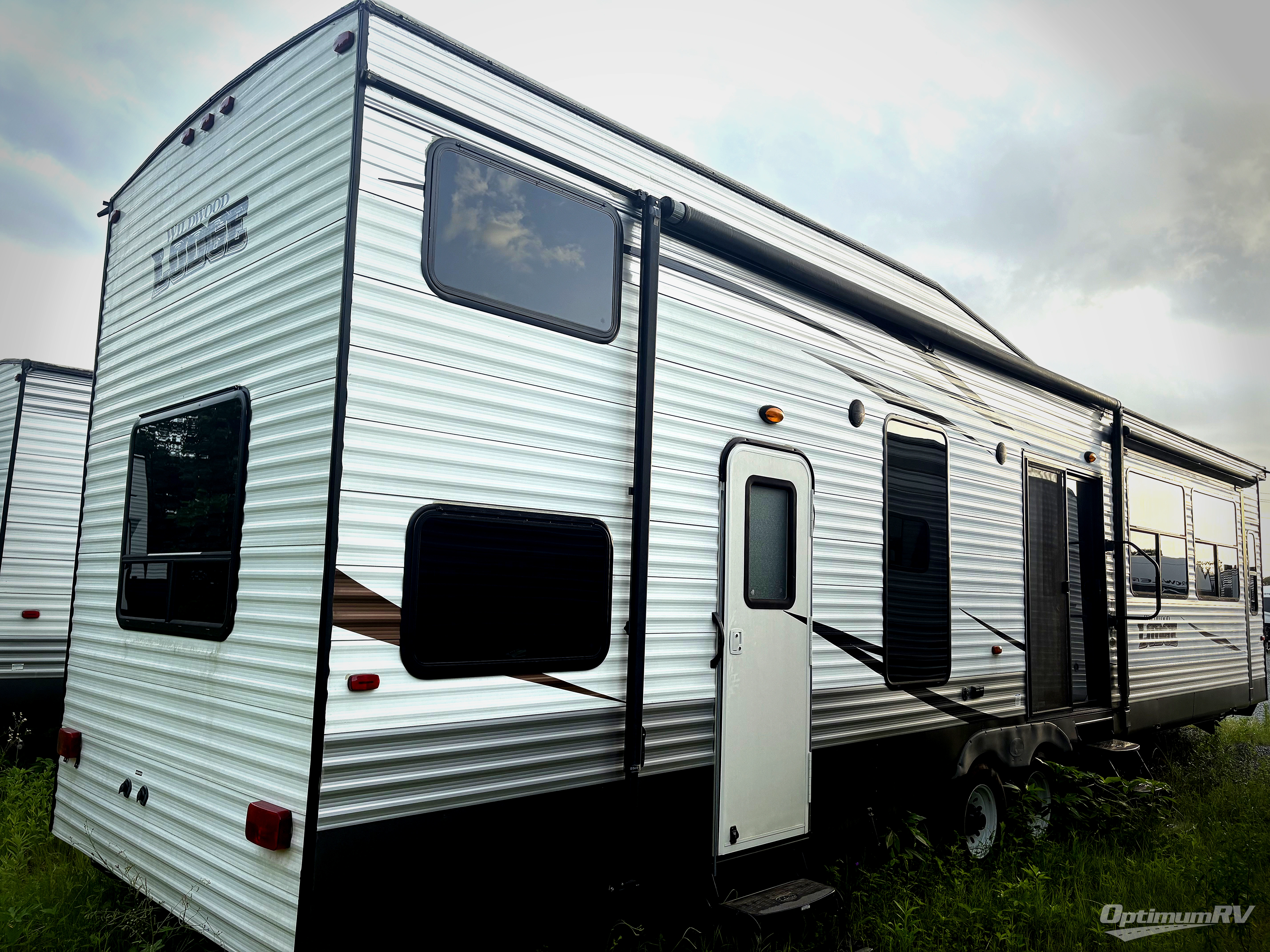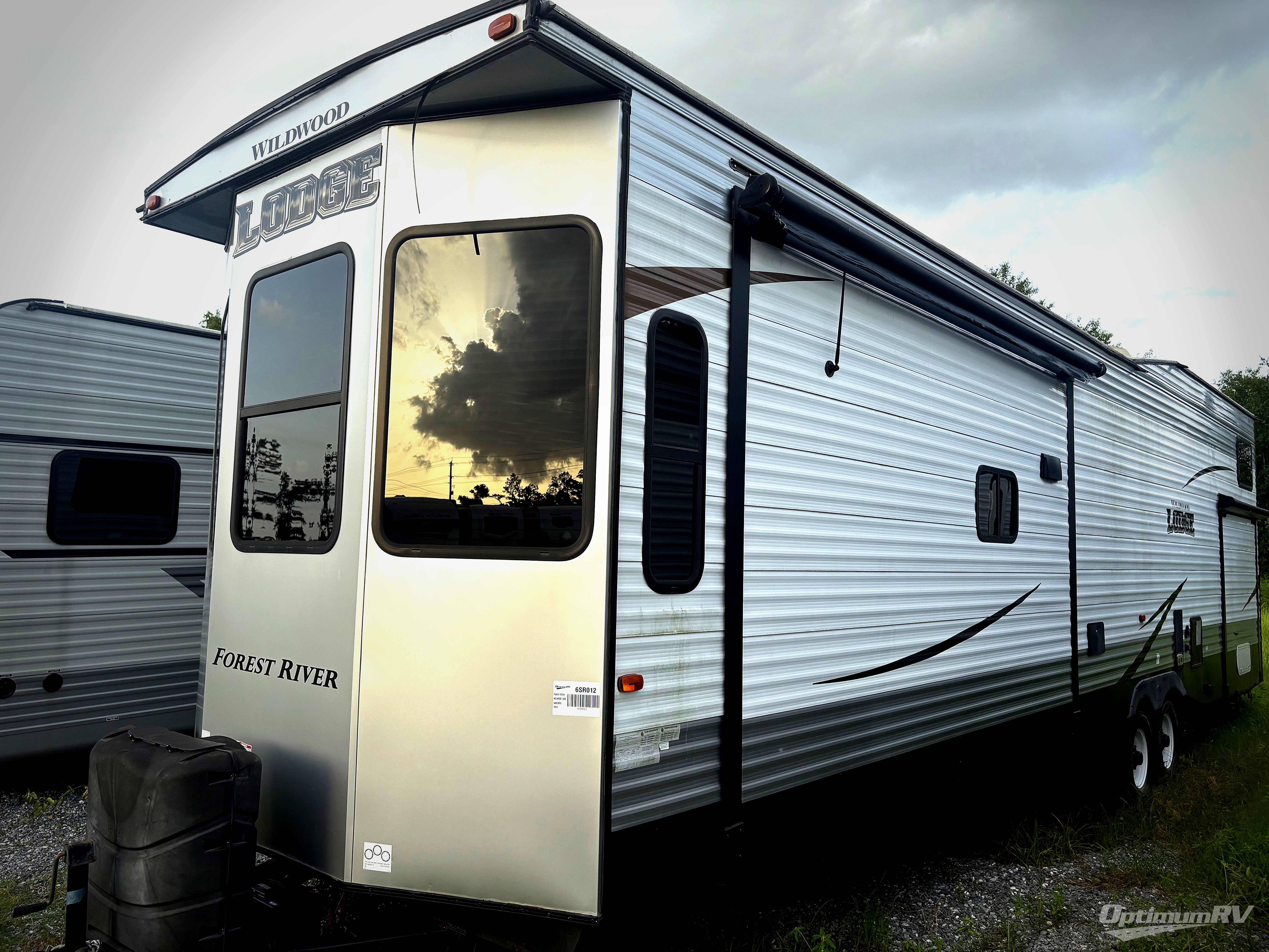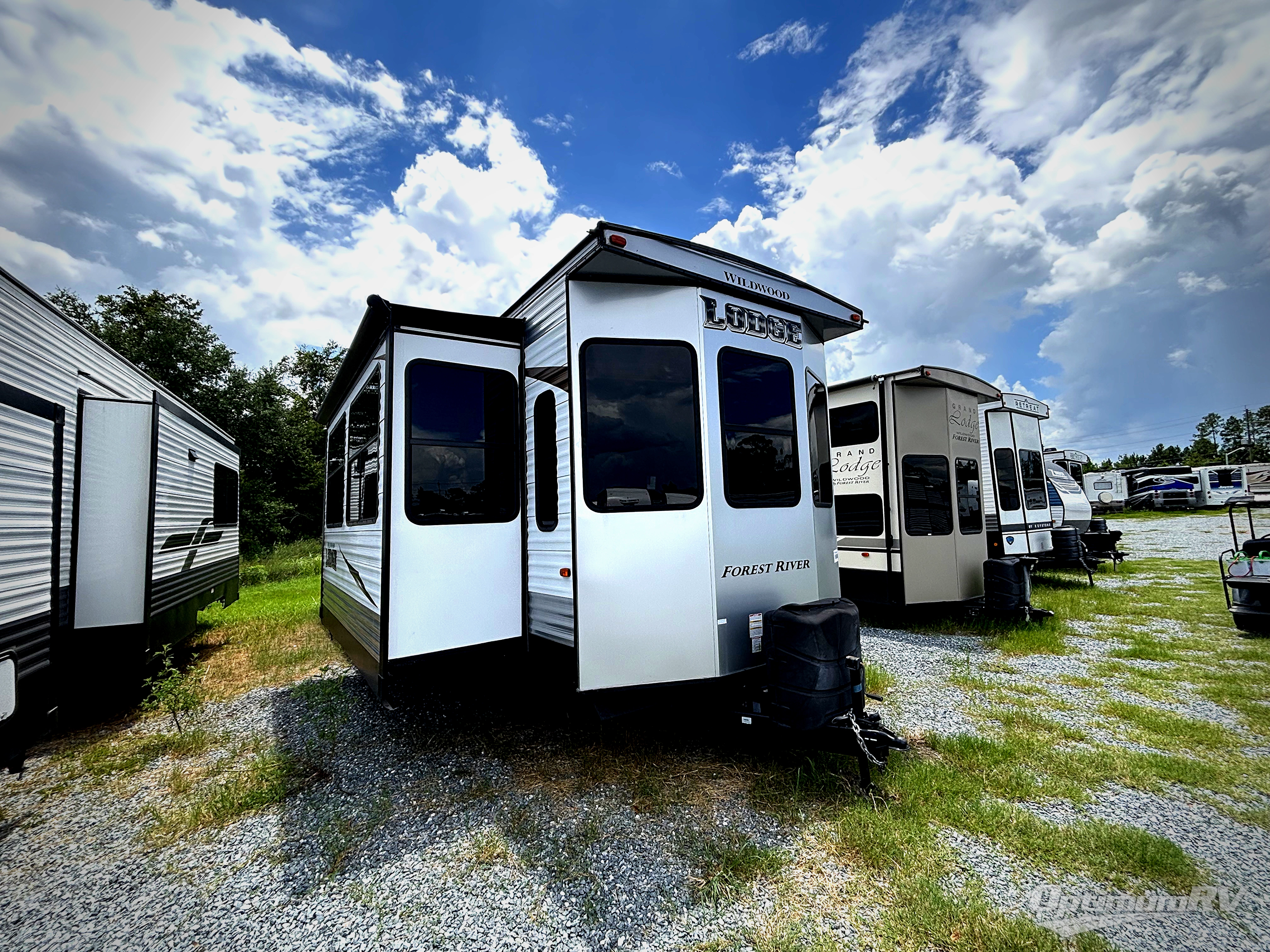 As you enter the rear entrance of the Wildwood Lodge 4092BFL destination trailer by Forest River, you will be in the rear bedroom. Along one wall there is a dresser, the opposite side of the trailer has a slide out with a queen bed. There is also a wardrobe and an optional washer/dryer along the interior wall.