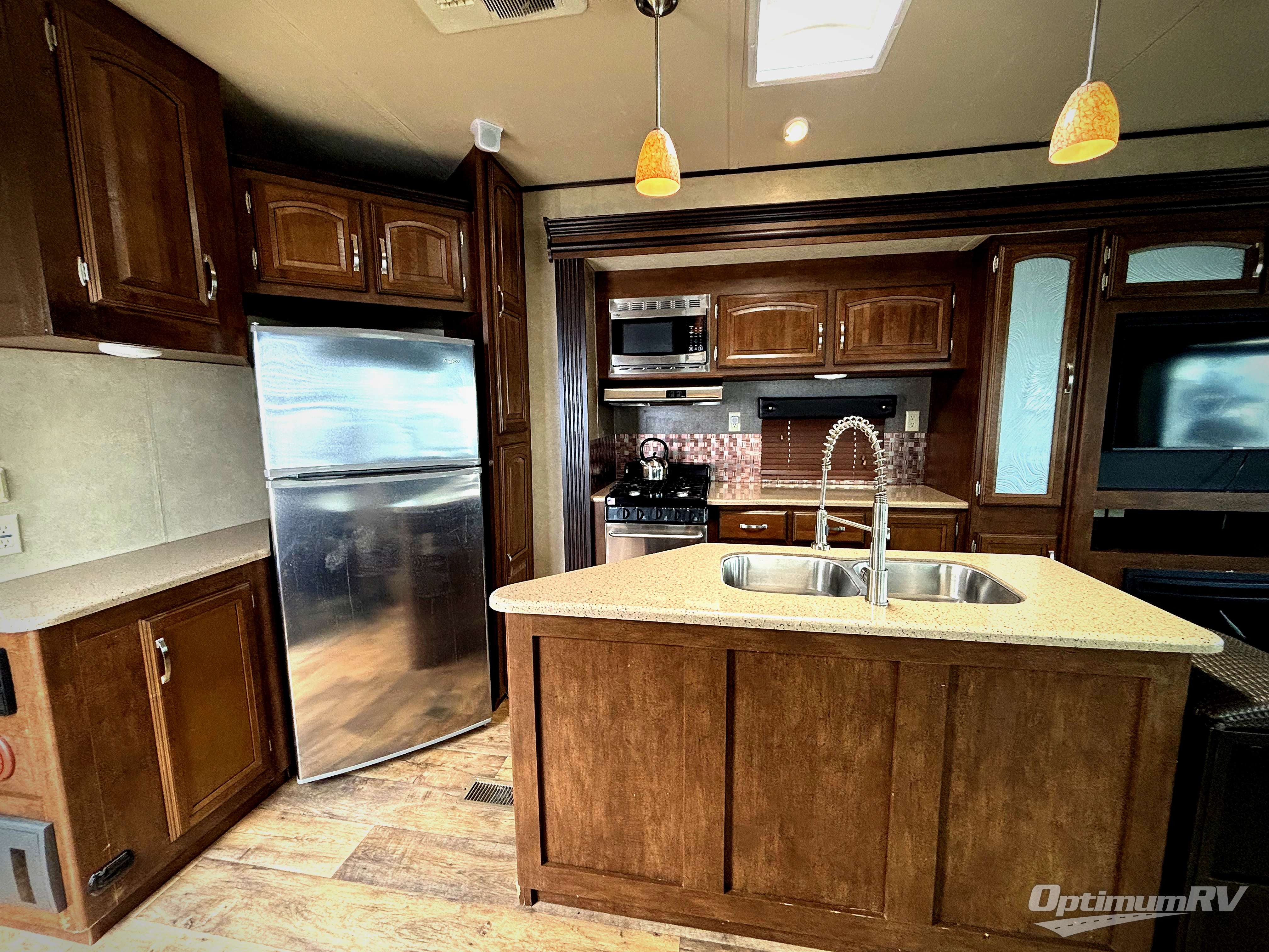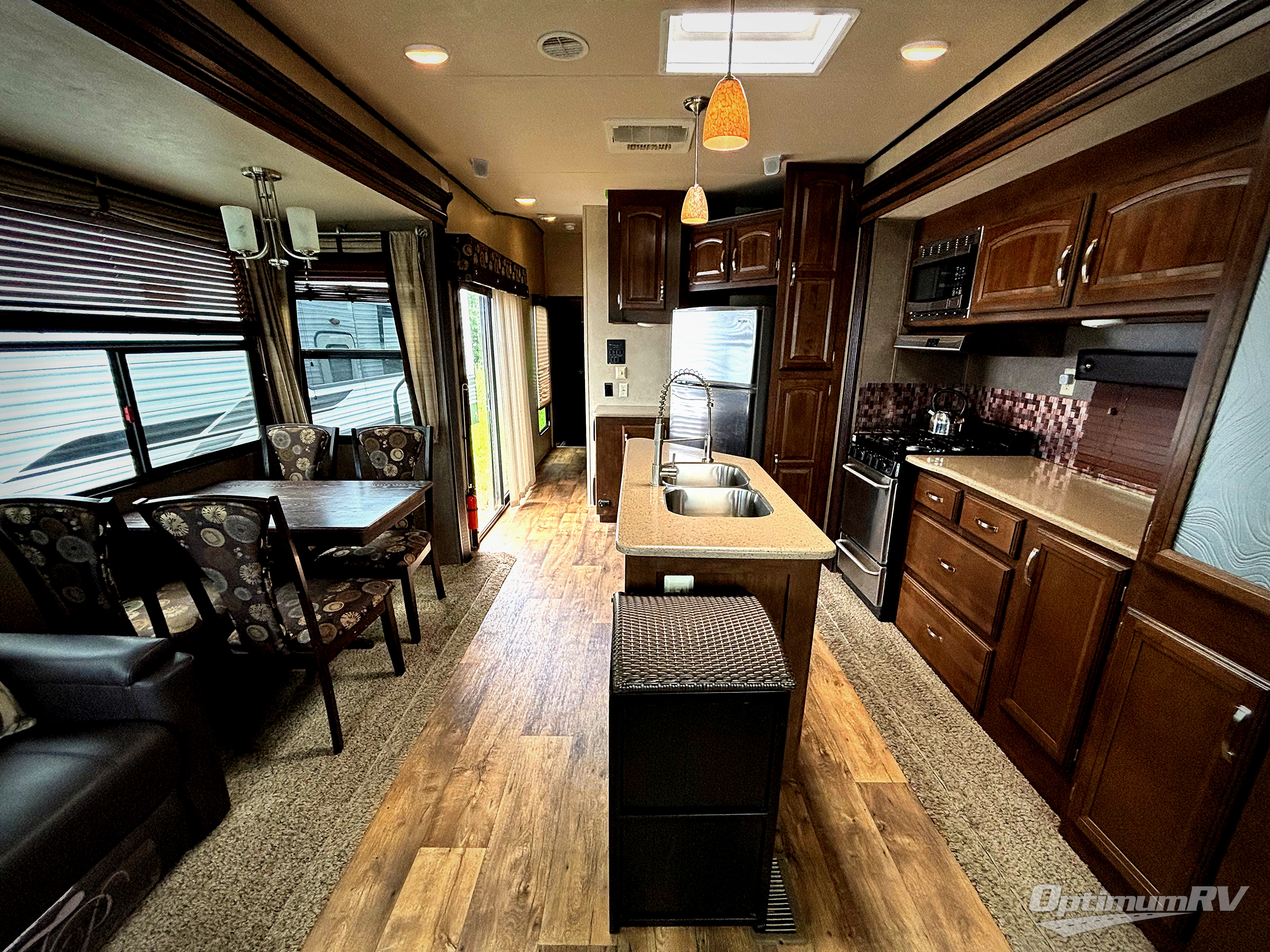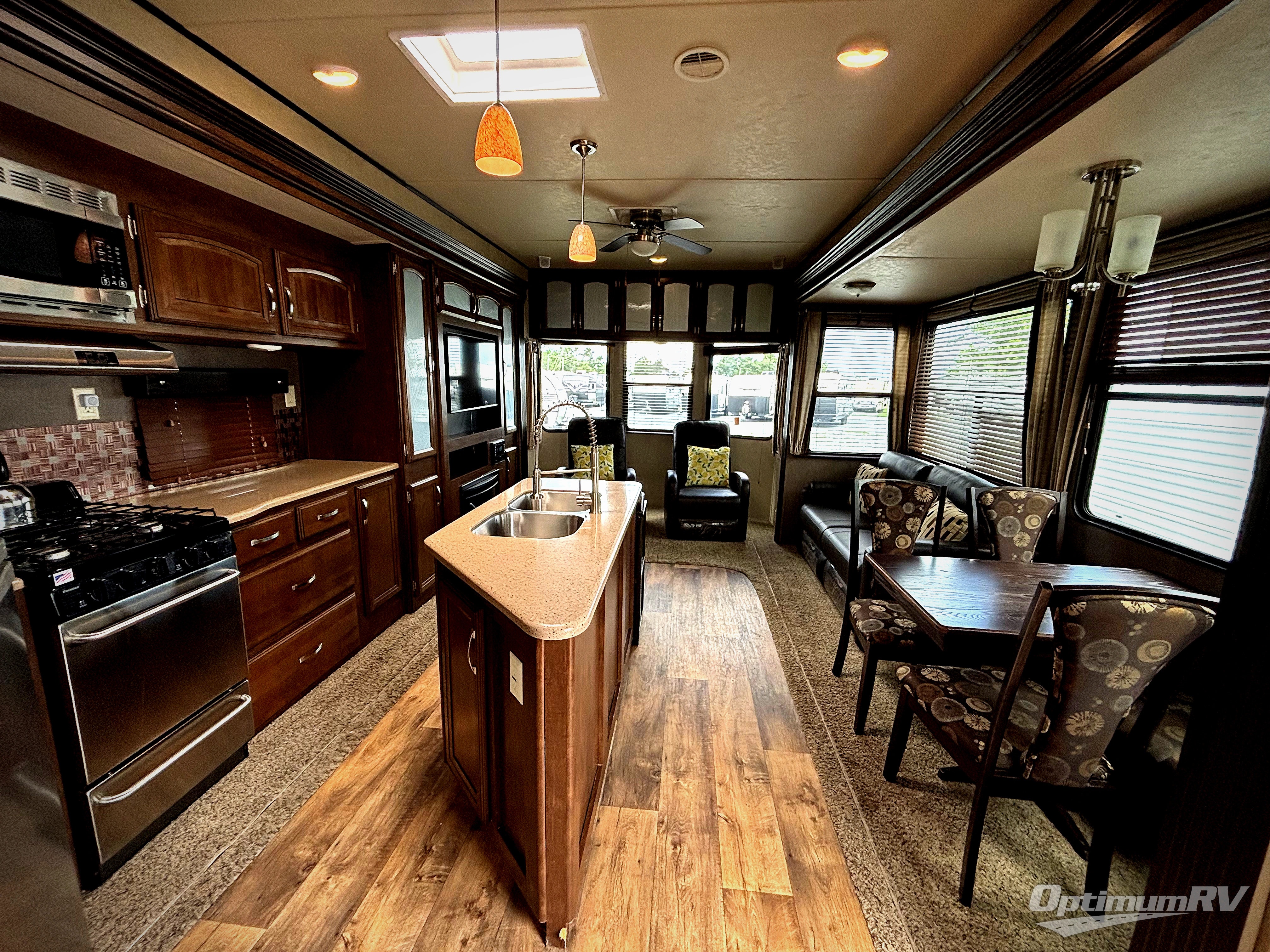 The kitchen and main living area have a refrigerator and pantry along the interior wall. The slide out along the road side offers a four burner range, microwave, and entertainment center. The slide out opposite has a free-standing table and a sofa. Along the front wall there are two lounge chairs. In the middle of the kitchen you will find a kitchen island with a double kitchen sink, plus more!