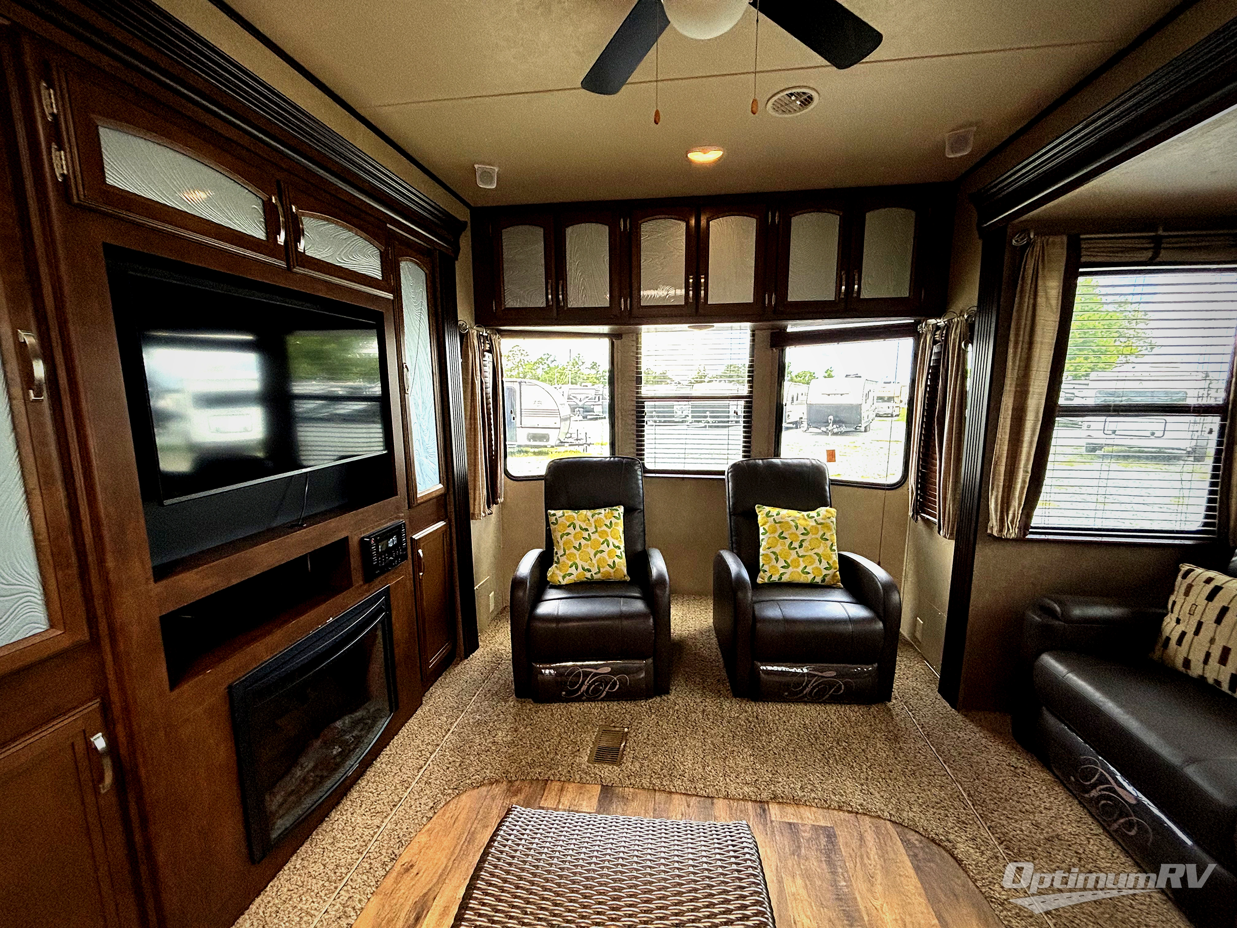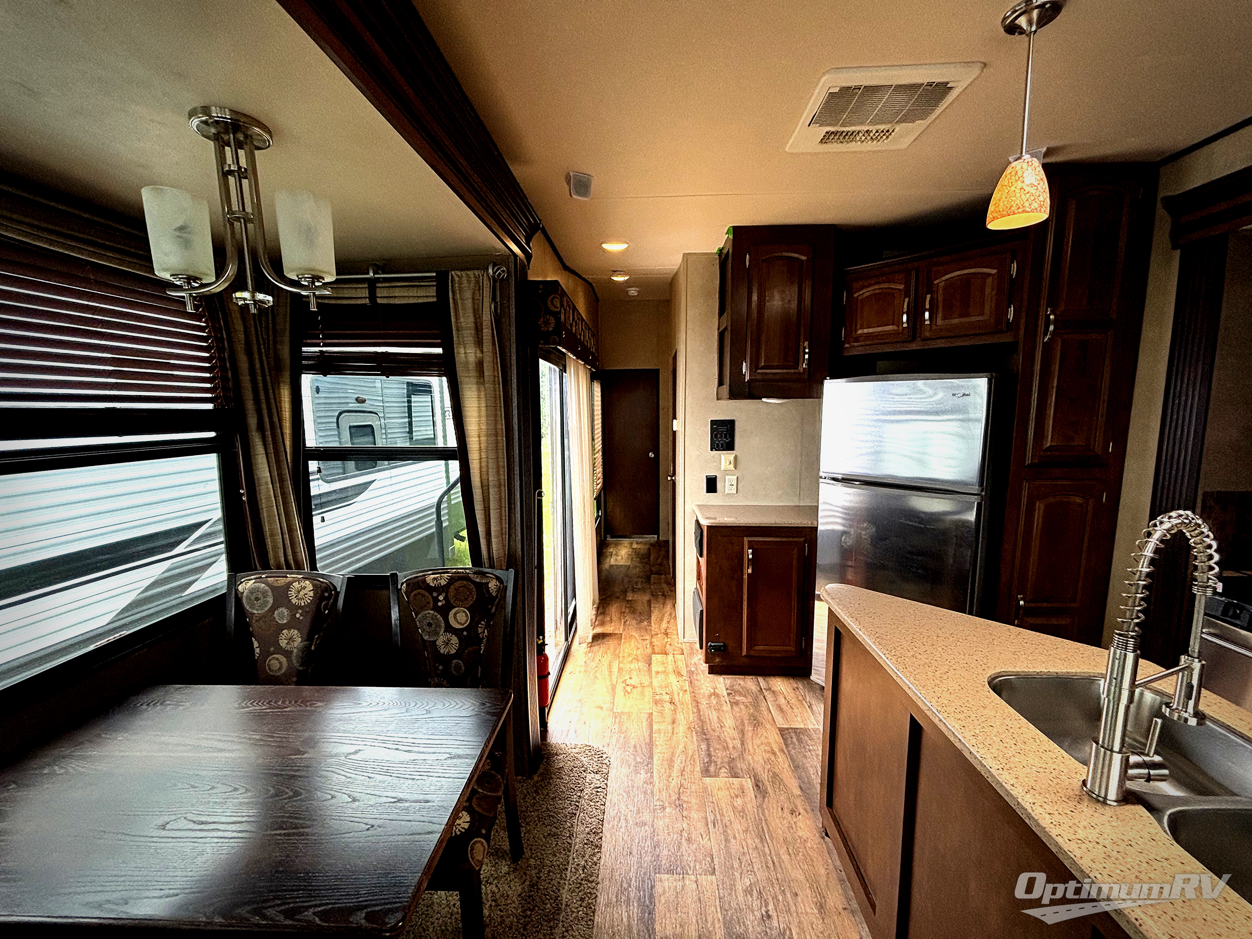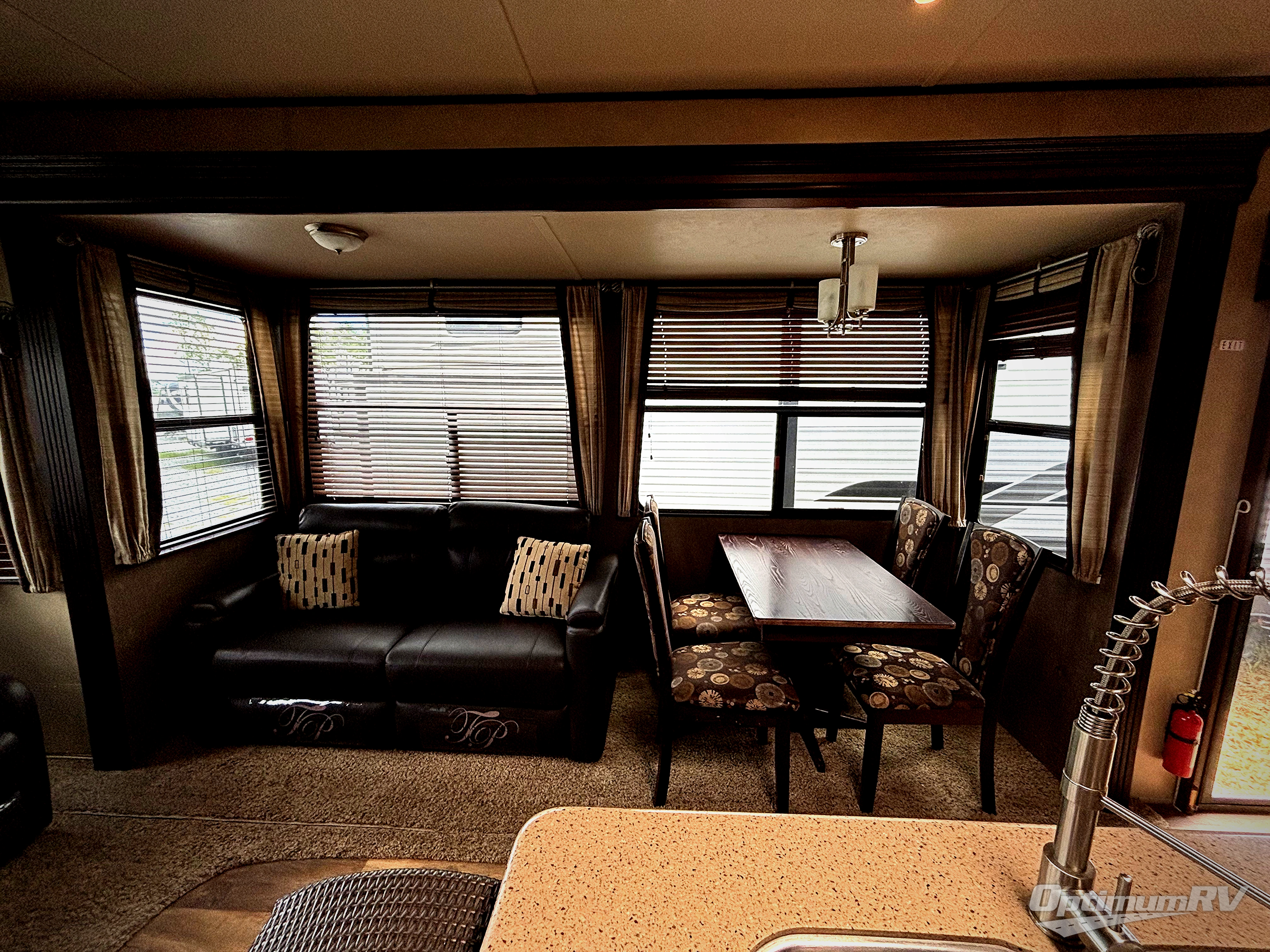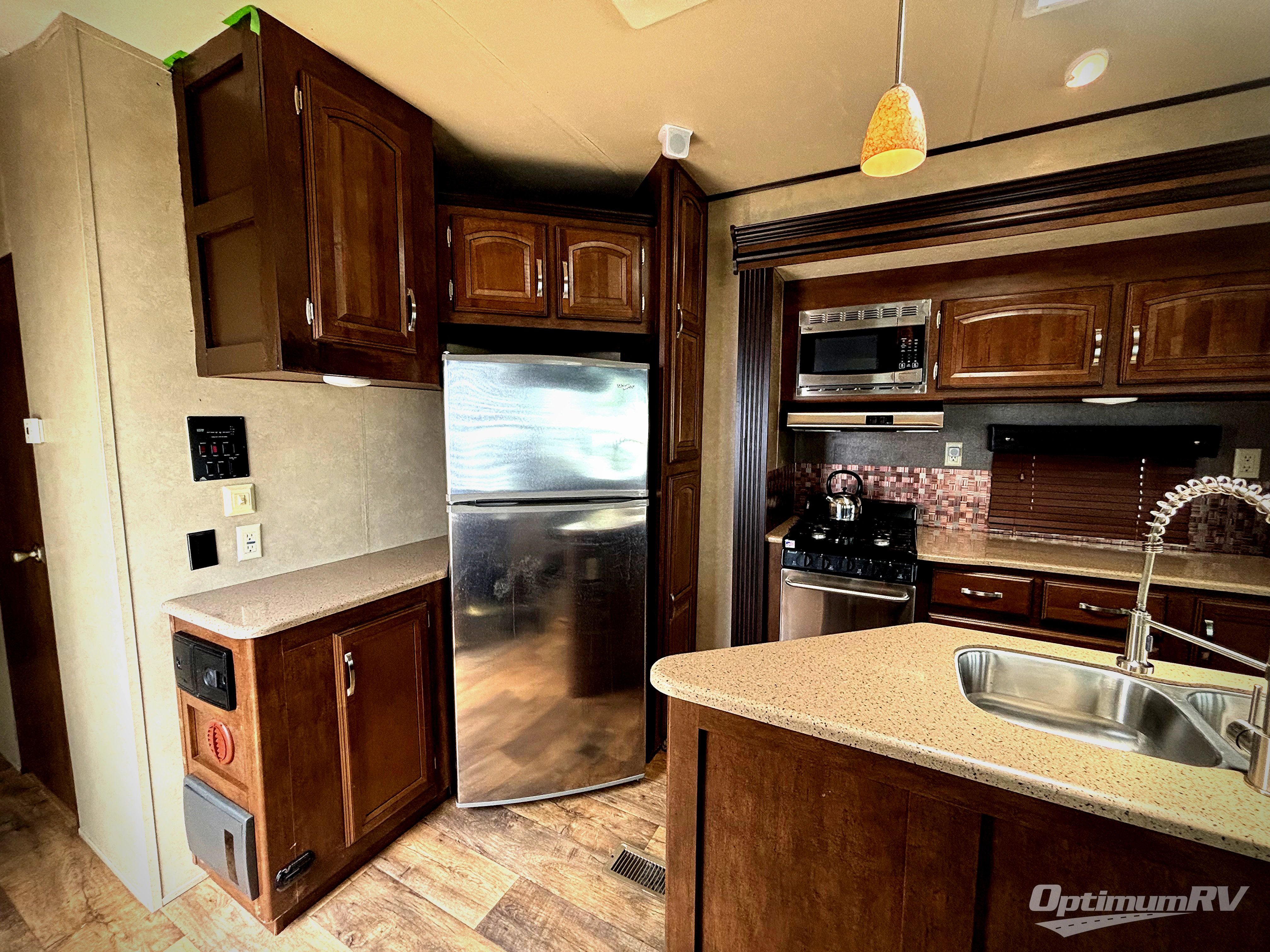 The kitchen and main living area have a refrigerator and pantry along the interior wall. The slide out along the road side offers a four burner range, microwave, and entertainment center. The slide out opposite has a free-standing table and a sofa. Along the front wall there are two lounge chairs. In the middle of the kitchen you will find a kitchen island with a double kitchen sink, plus more!