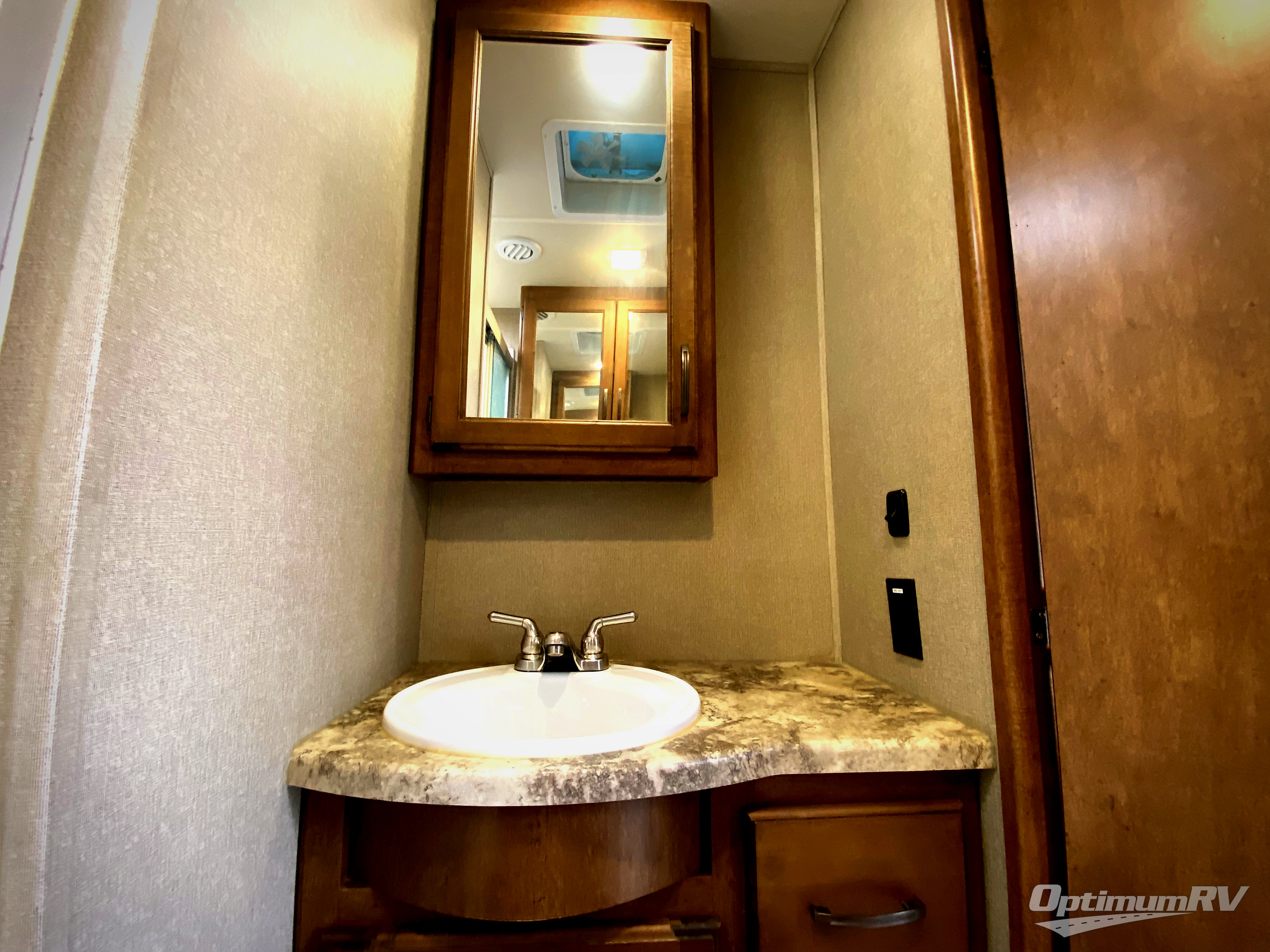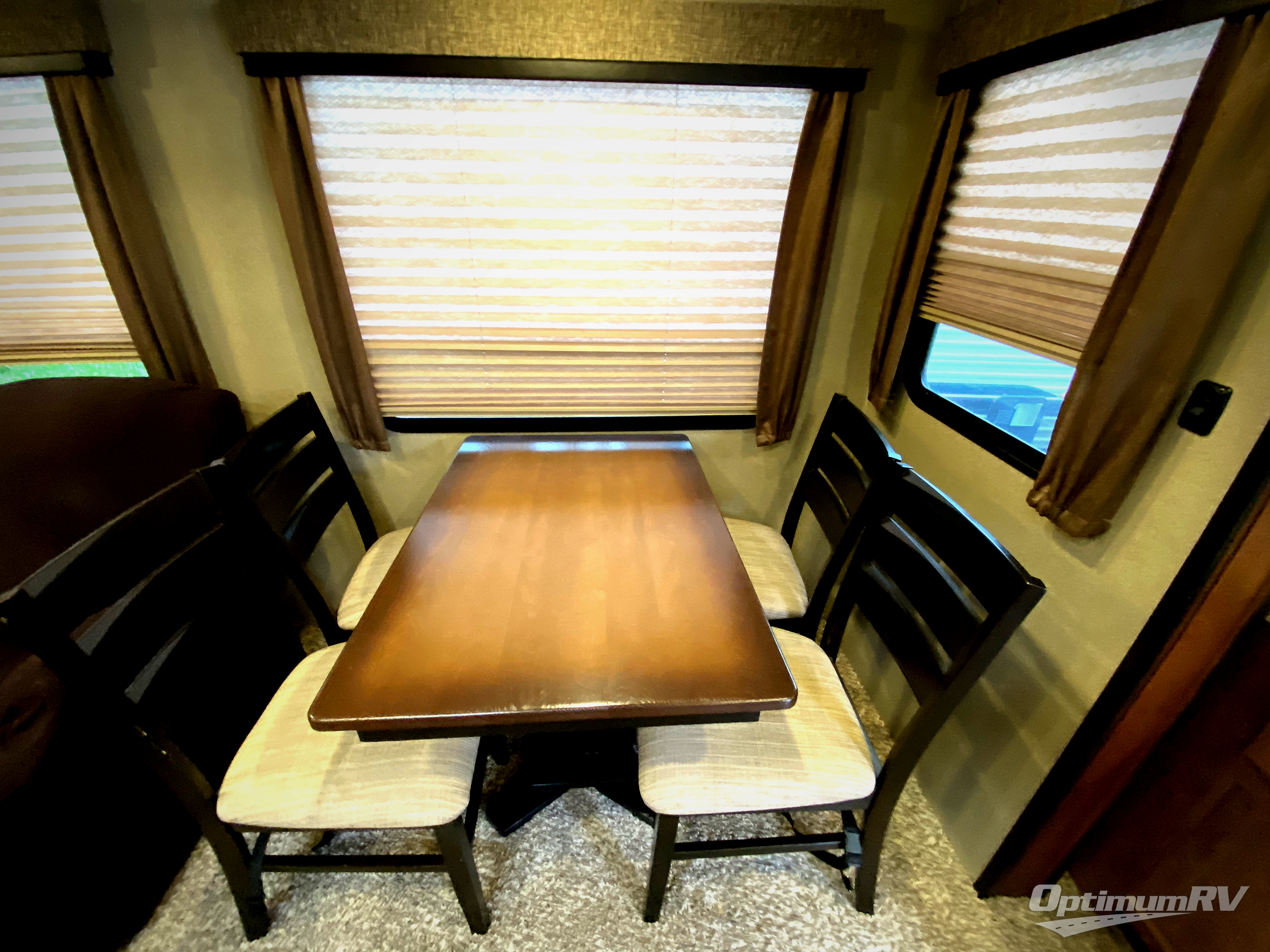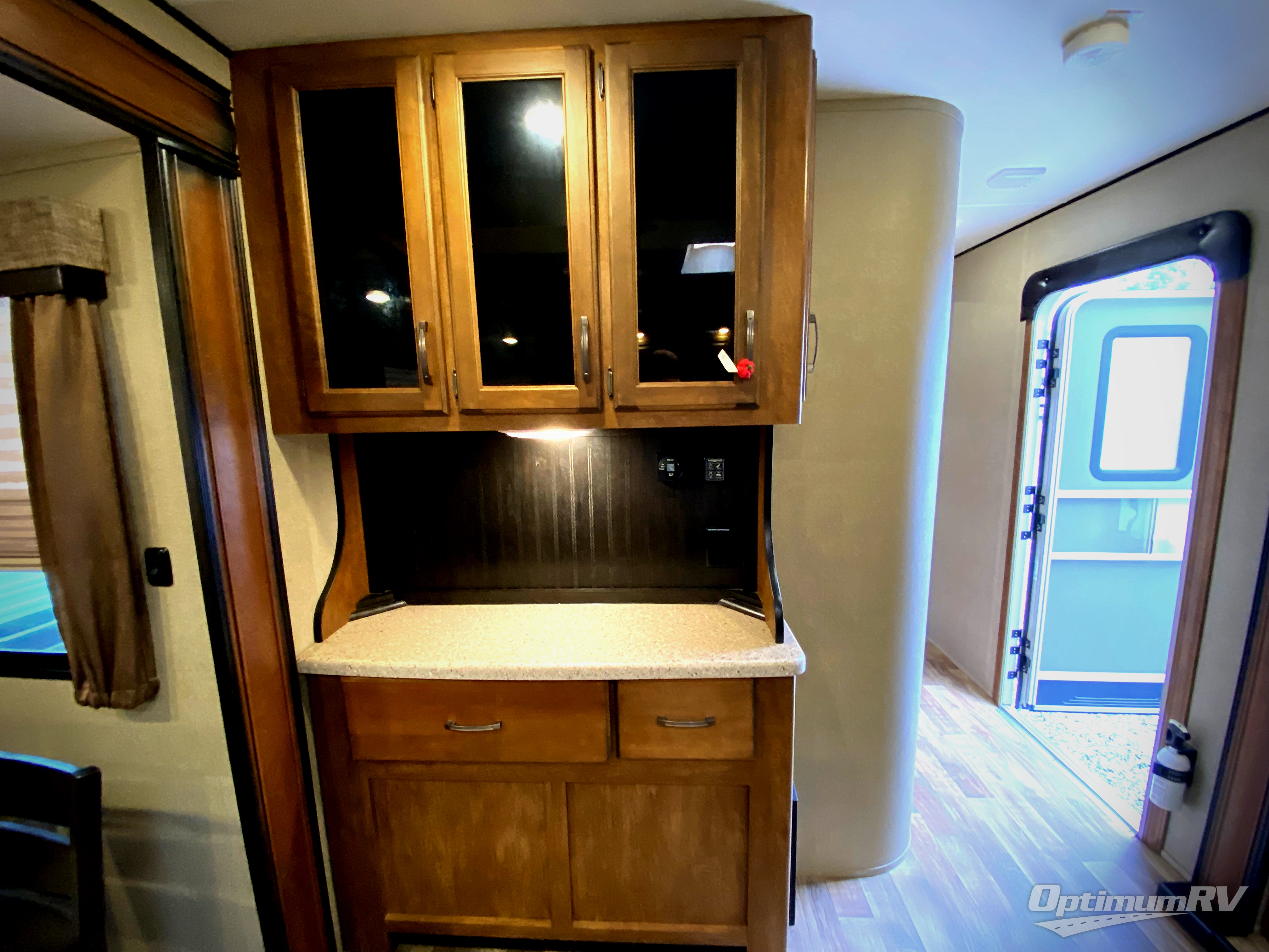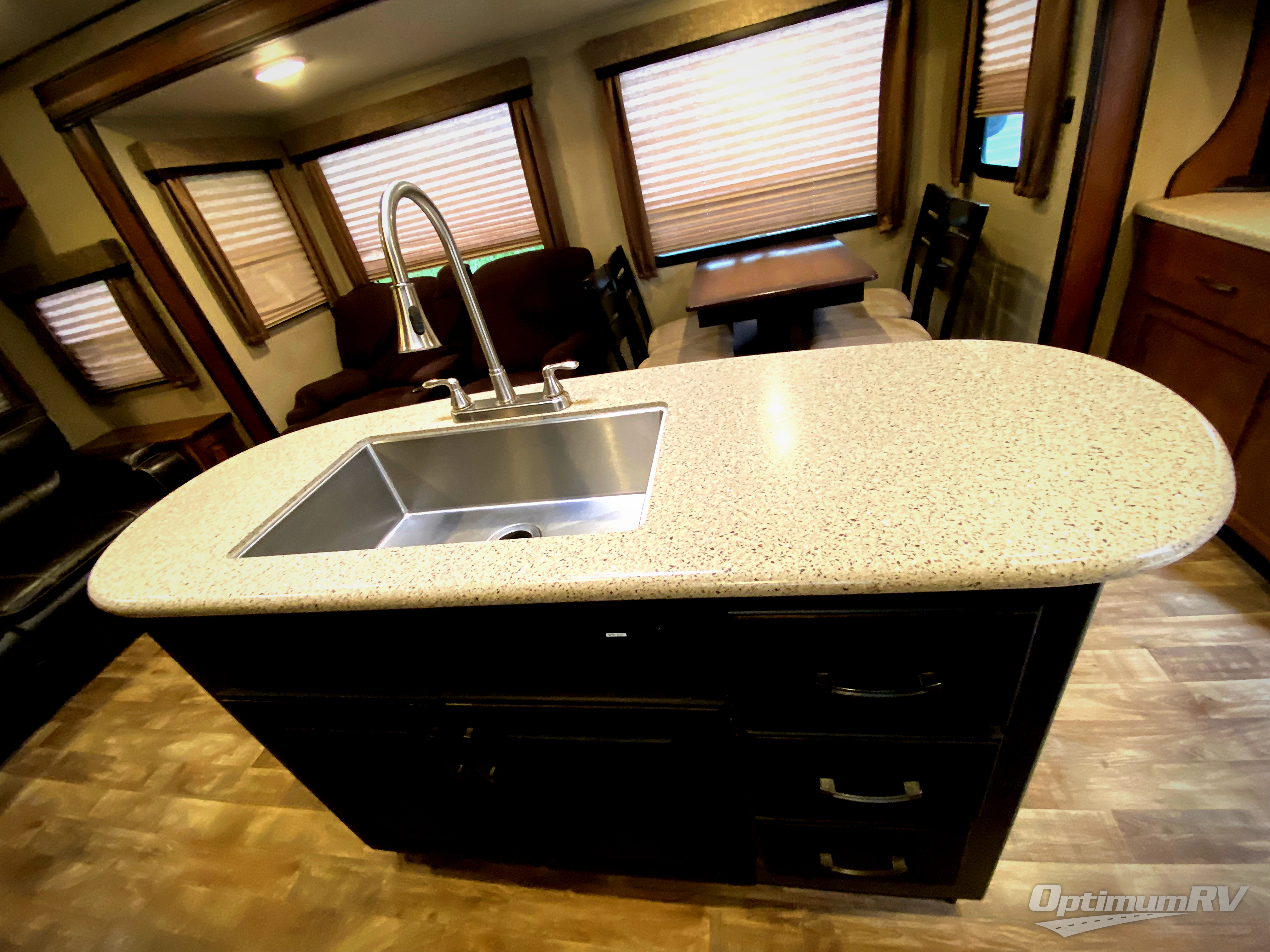 Back to the entry door continue on into the spacious combined kitchen and living room. There are dual opposing slides which really open up the space. A nice kitchen can be found to your immediate left that features a slide out including a three burner range plus counter space. There is also an overhead convection microwave oven, and a refrigerator within the slide. The center island offers more food prep space plus a large sink for cleaning up. Opposite dine comfortably at the optional free standing dinette shown. You will also notice a hutch along the interior wall that includes storage both above and below for your things.