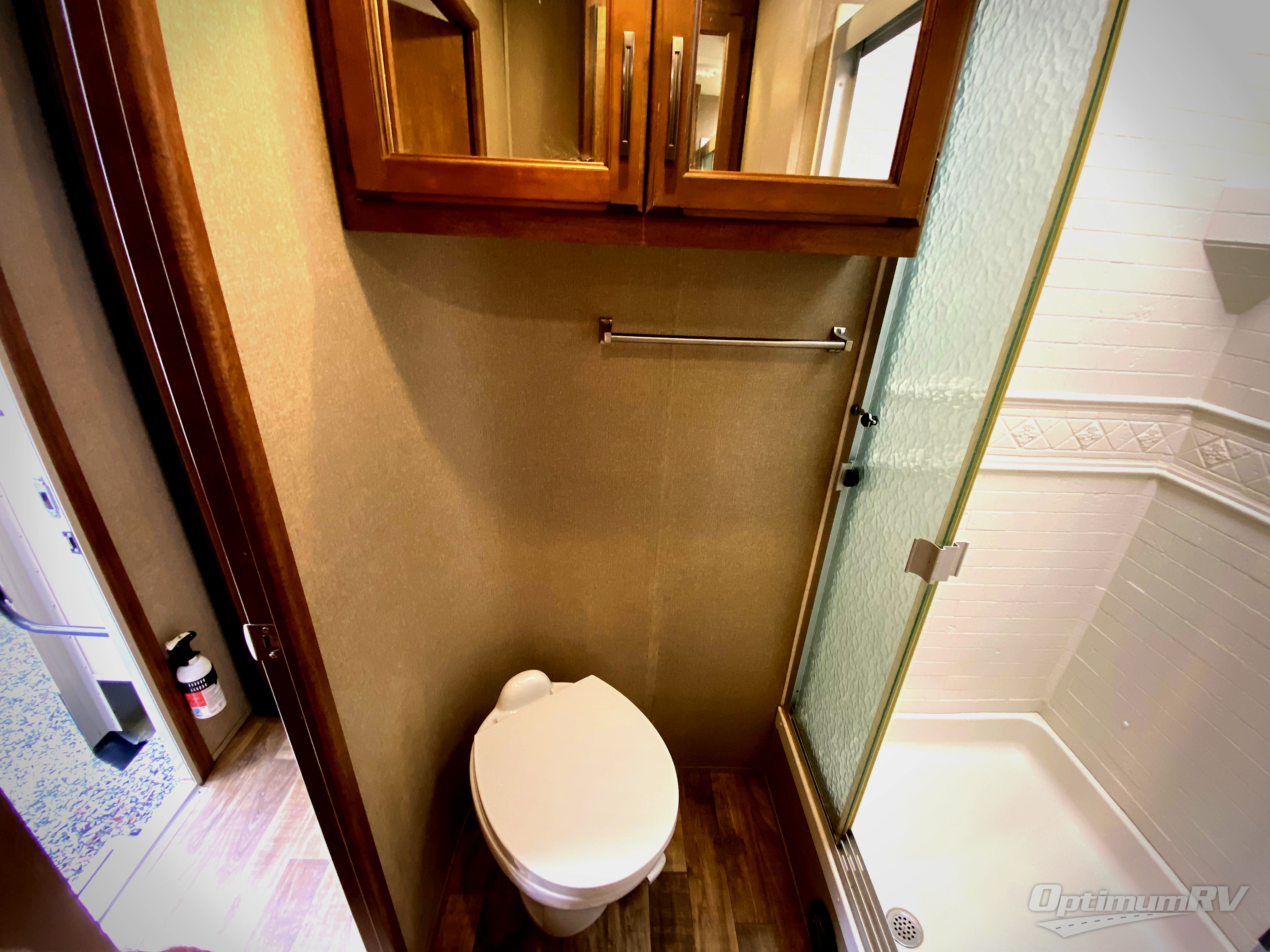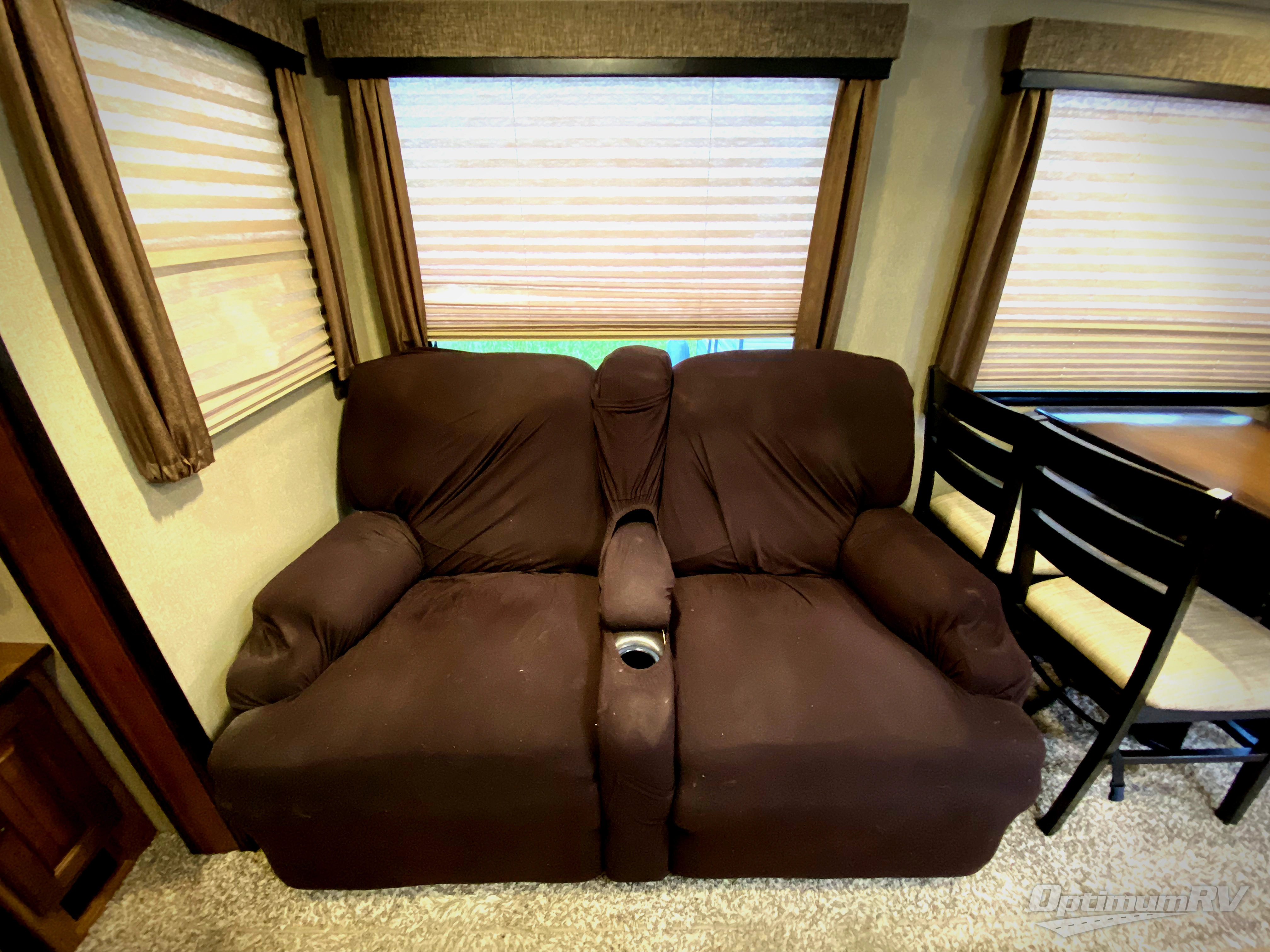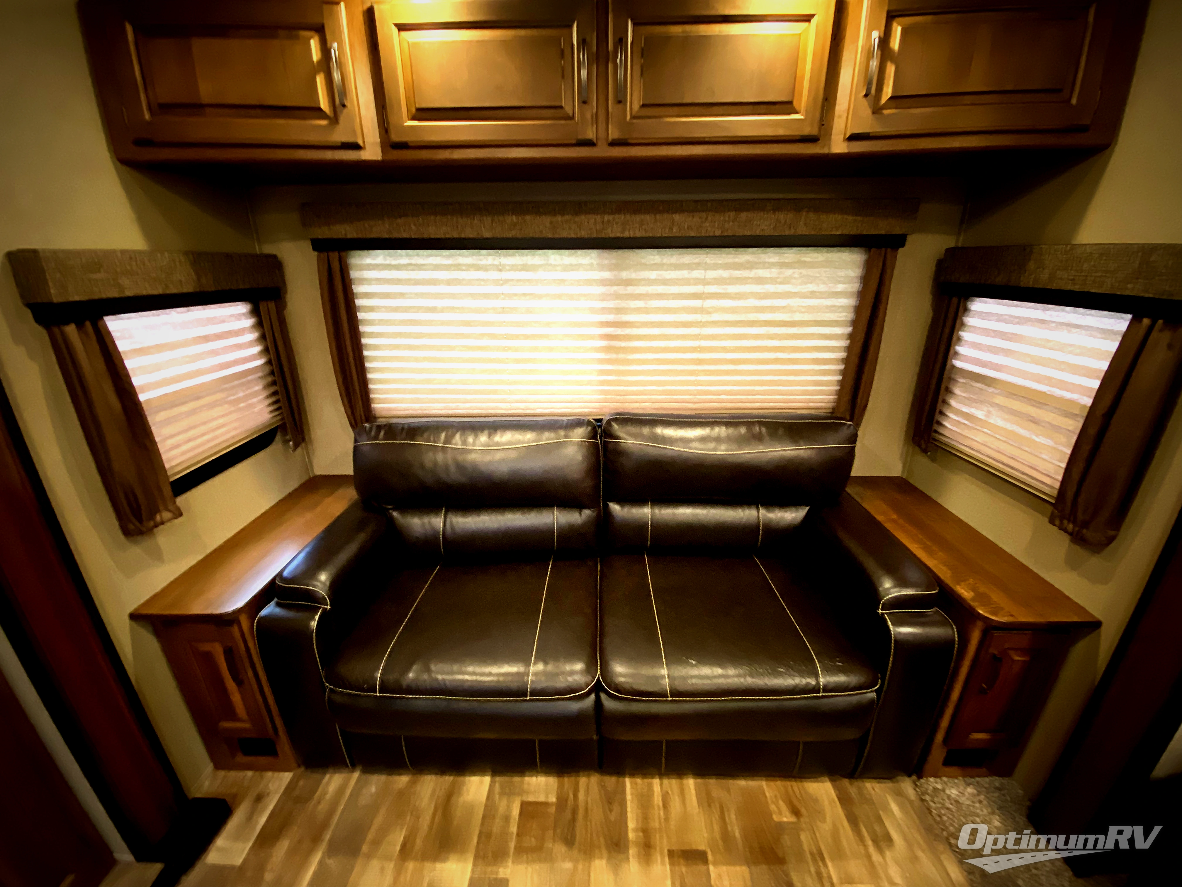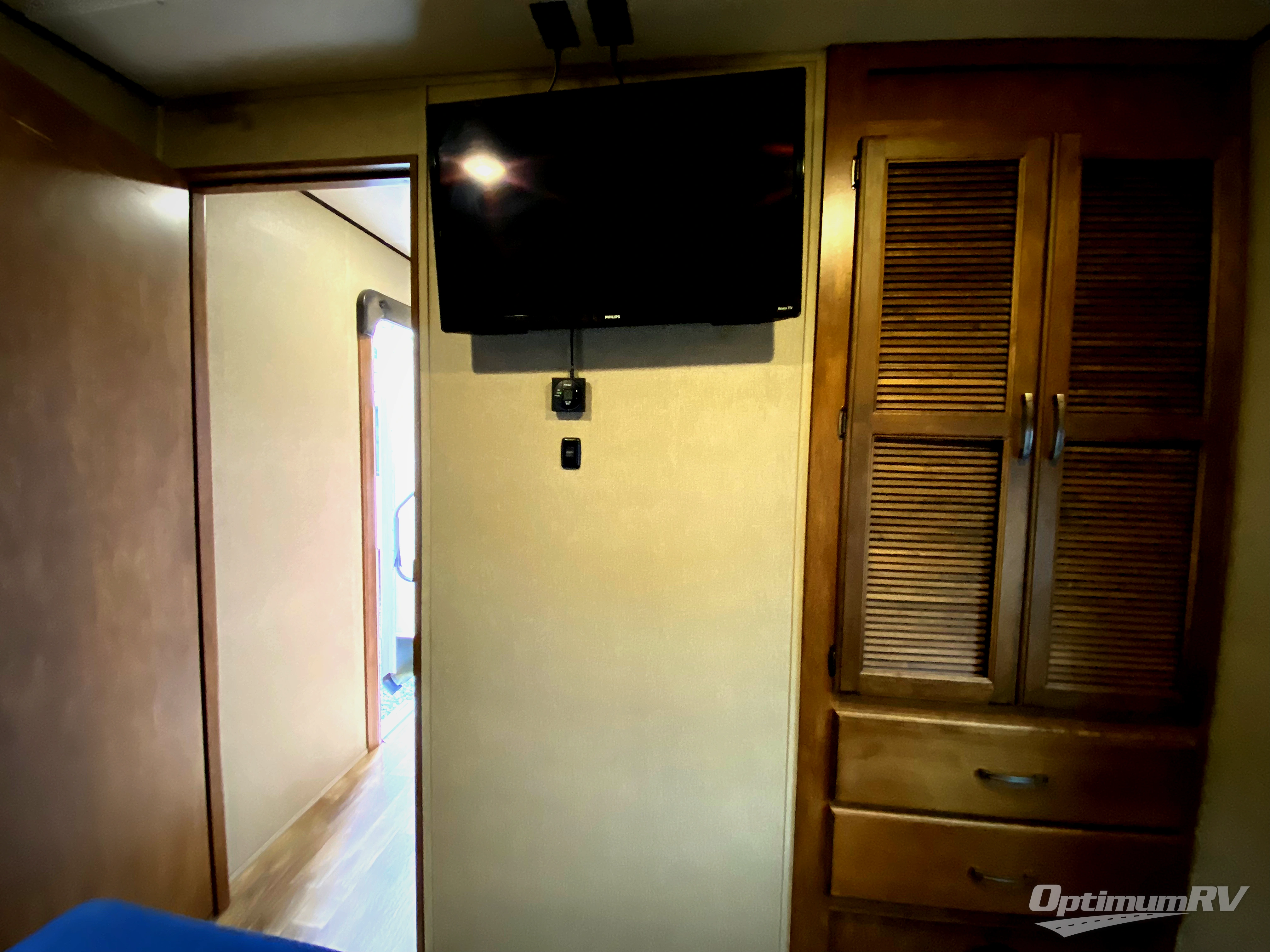 The rear portion of the curb side slide out features a 40" TV, and an entertainment center with fireplace below. Adjacent enjoy a tri-fold sofa, end tables and overhead cabinets that stretch the entire width of the unit. This can easily be made into sleeping space at night, and there is more seating in the theatre seats next to the dinette slide out which is opposite the entertainment center, plus so much more!