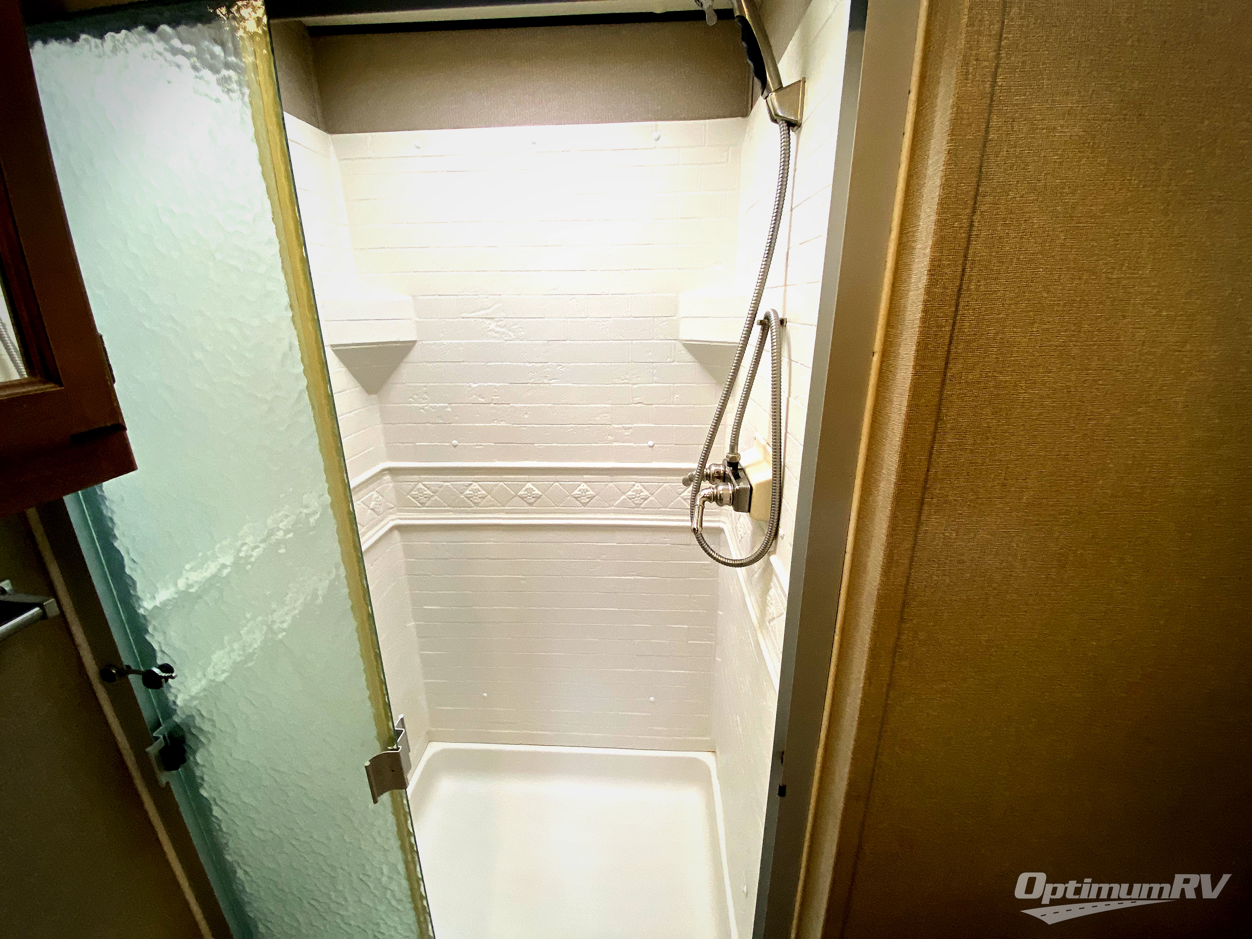 Head inside and find opposite the door a complete bath including a toilet, a vanity with sink, plus a 30" x 36" shower with skylight. There is also a bit of storage above the toilet and sink.
