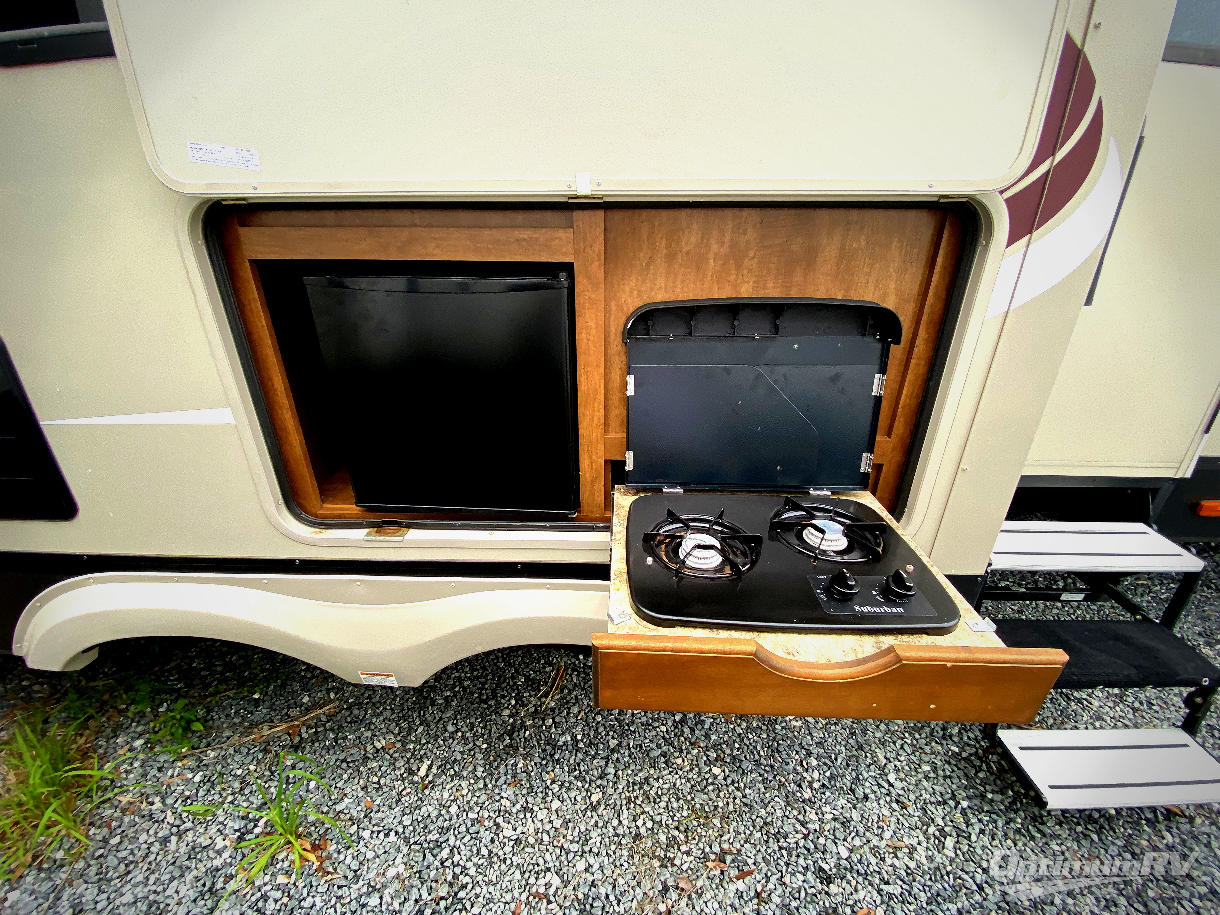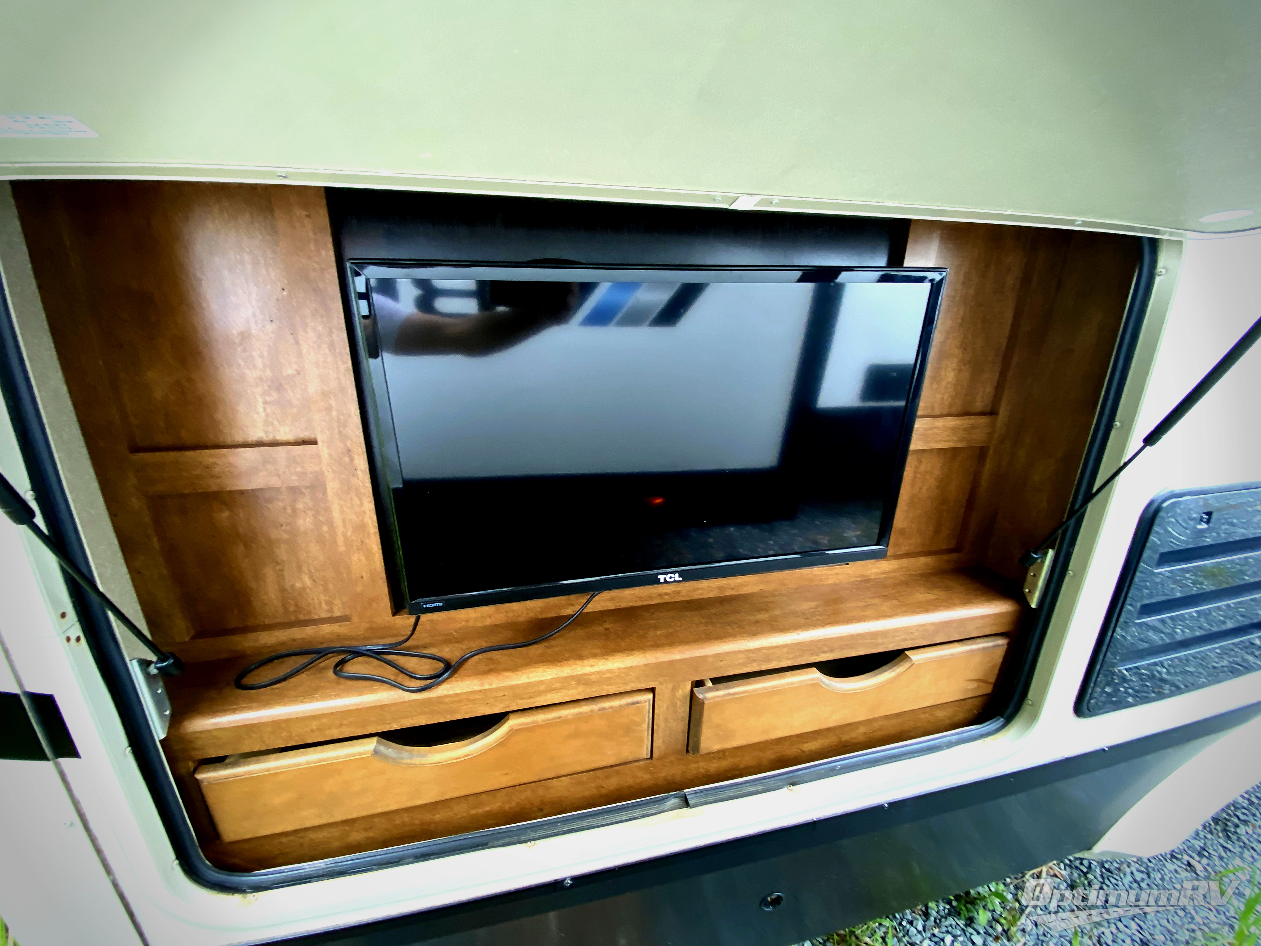 On the outside before heading in notice the exterior entertainment center with LED TV, and the outside kitchen including a two burner stove top and refrigerator to make outdoor cooking simple for the camp chef.