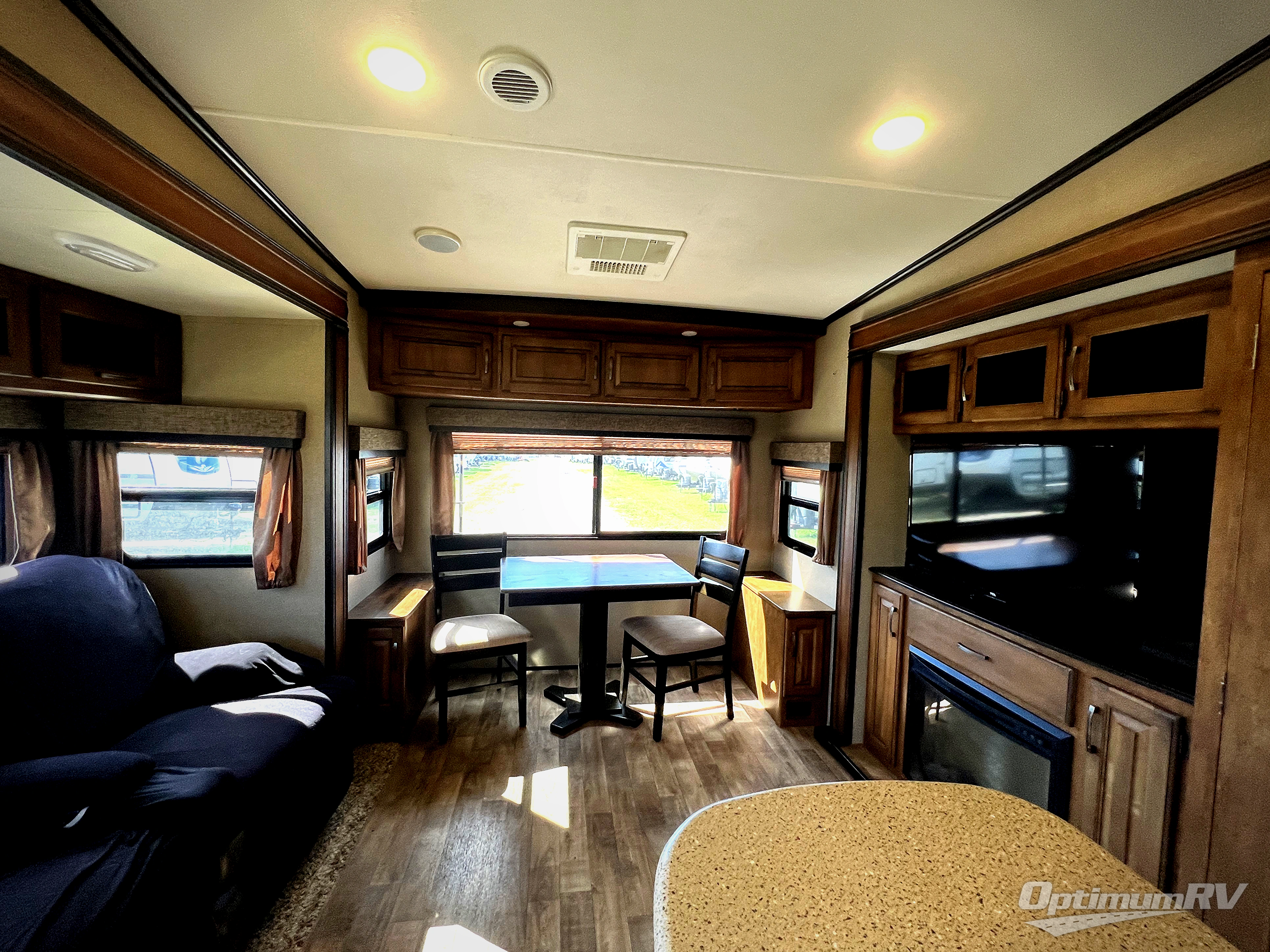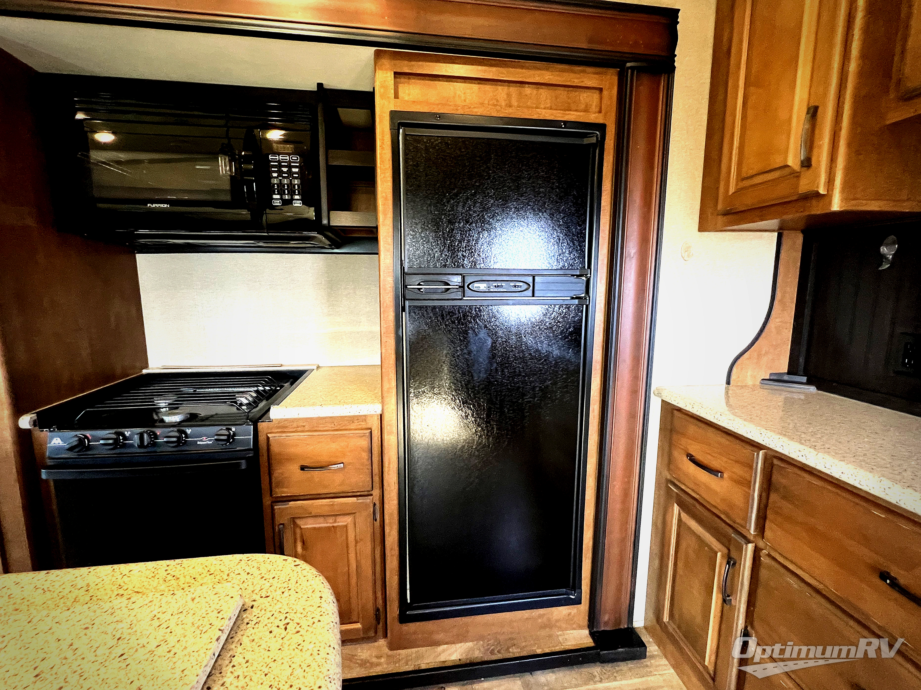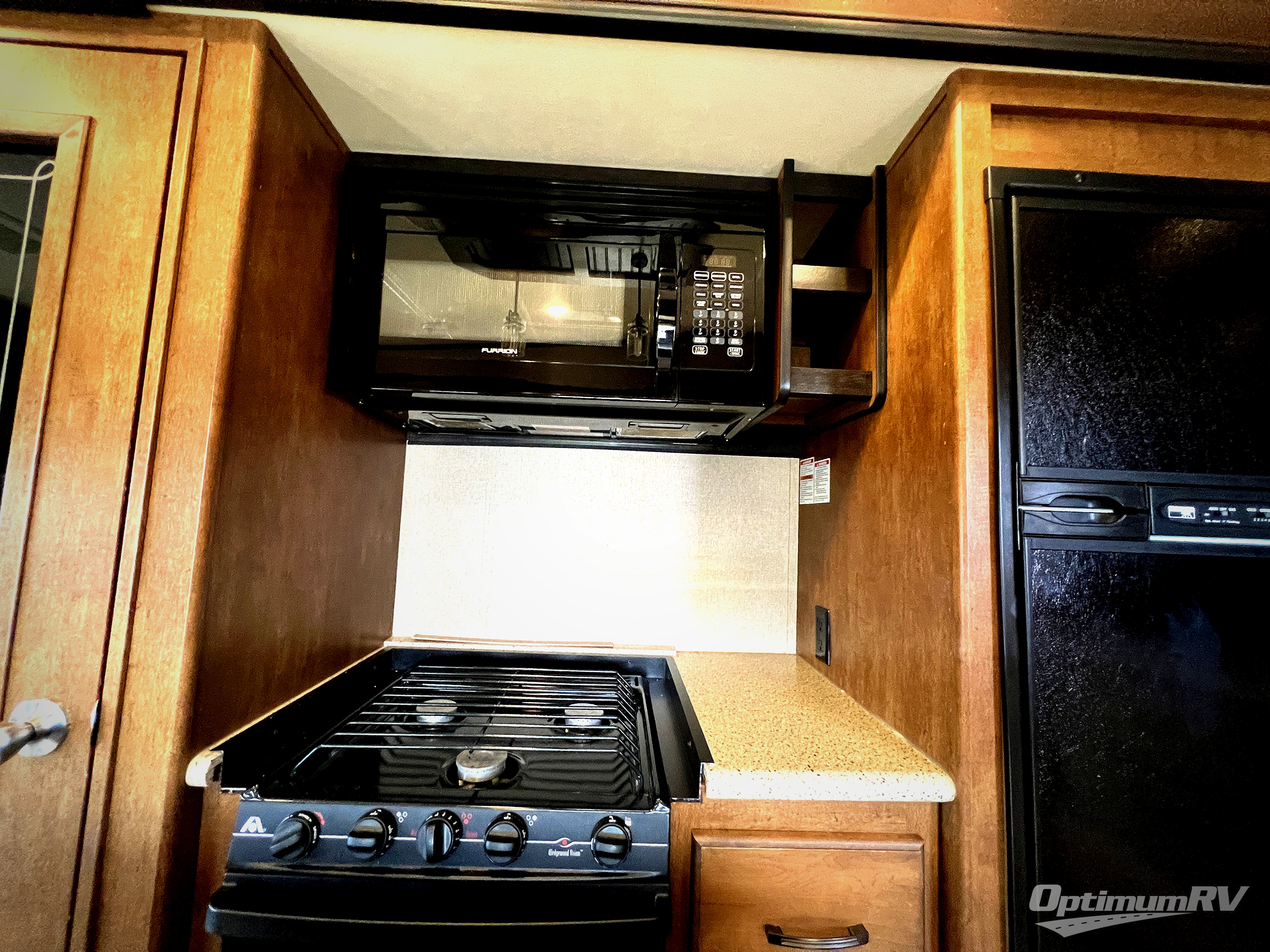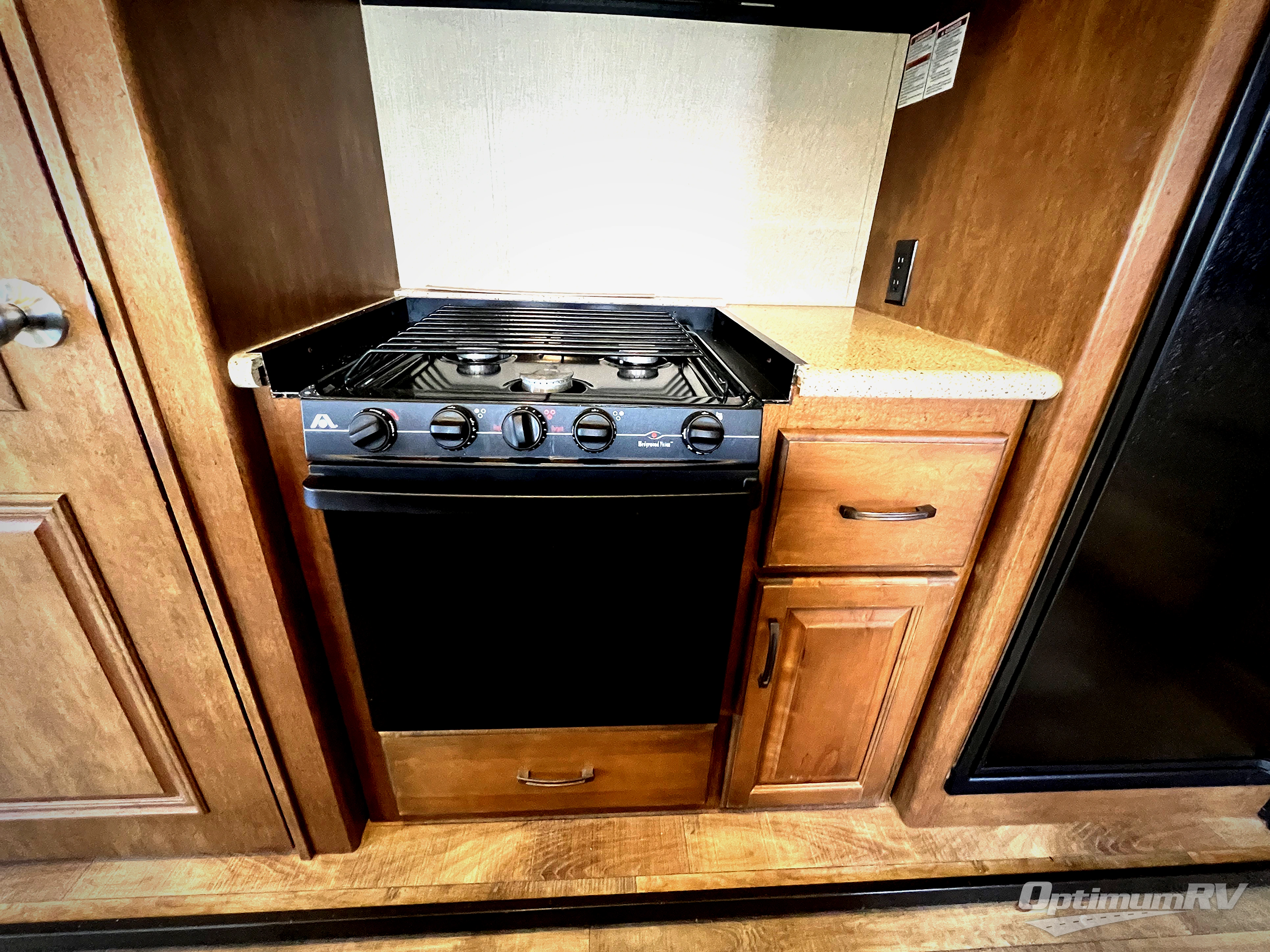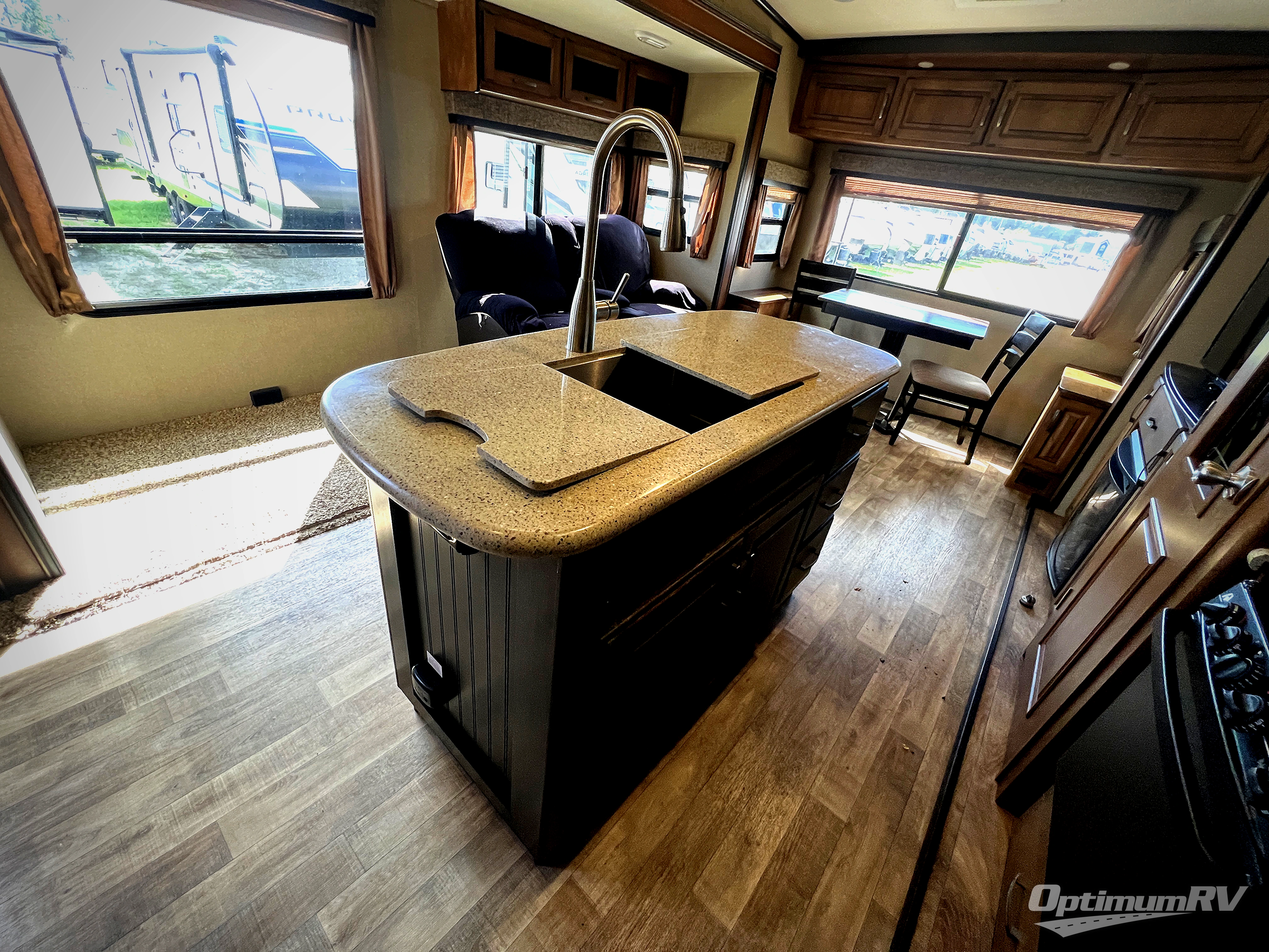 To your immediate left of the entrance you will see an optional free standing dinette along with theatre seating in a slide out. There is a center kitchen island which includes a large sink for easy food prep and cleanup. Directly opposite there is a second larger slide featuring a refrigerator, a three burner range with convection microwave above, and a pantry for dry goods storage. This slide also features an entertainment center including a 40" TV with overhead storage cabinets and a fireplace. There is also a hutch with additional overhead storage straight in from the entrance to the right of the kitchen island.