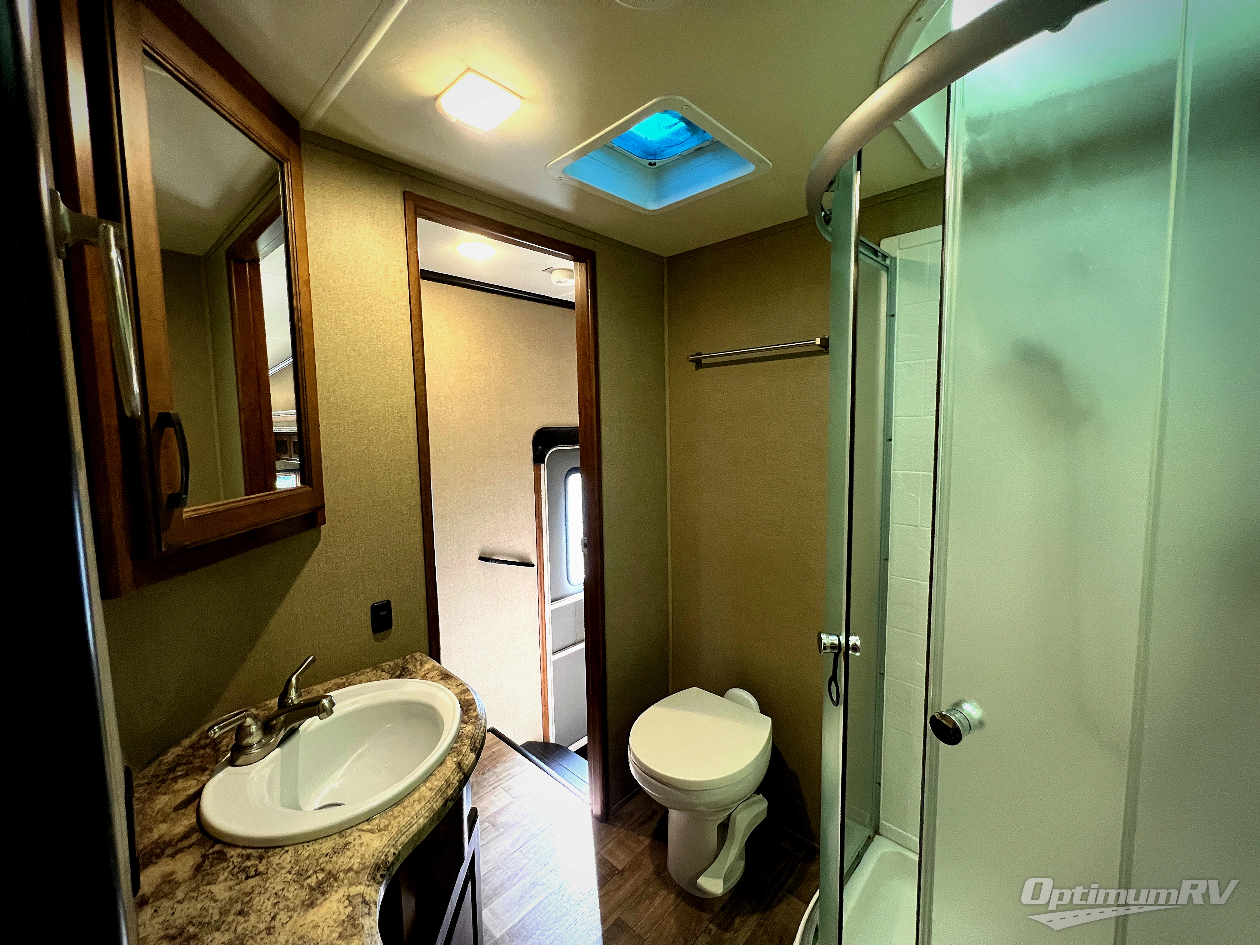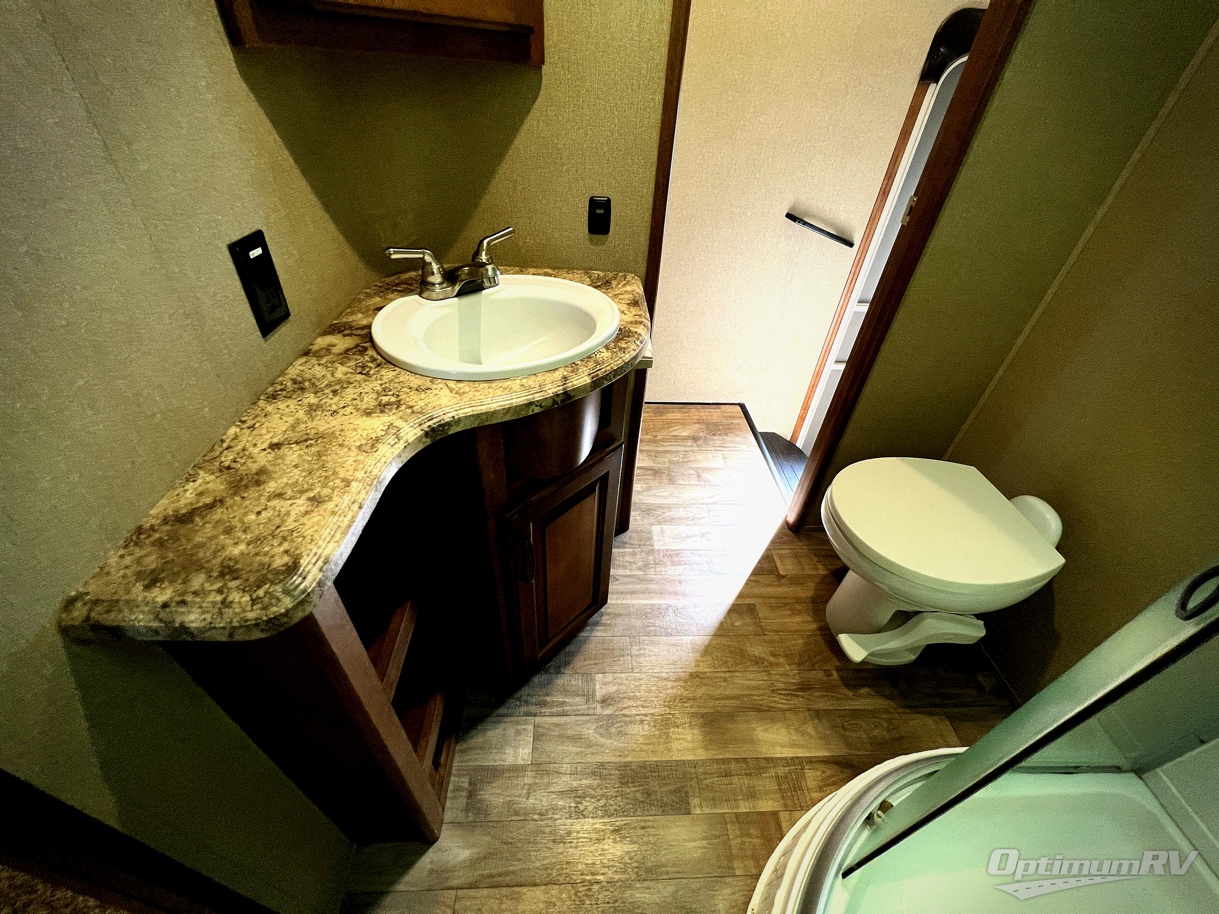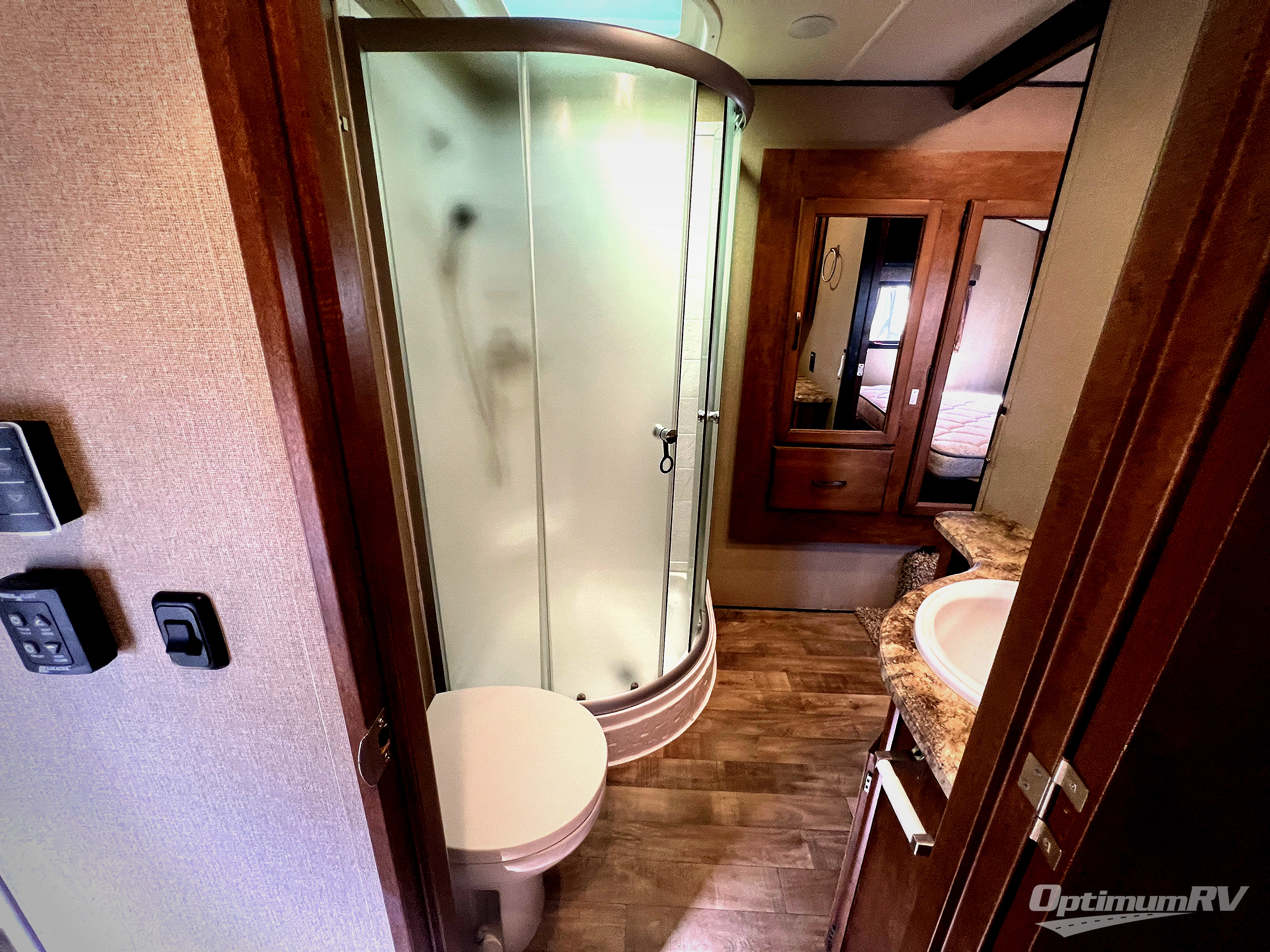 In the bathroom you will find a radius shower with skylight, a nice vanity with sink, toilet, a second entrance into the bedroom, plus a linen cabinet mentioned in the bedroom slide out.