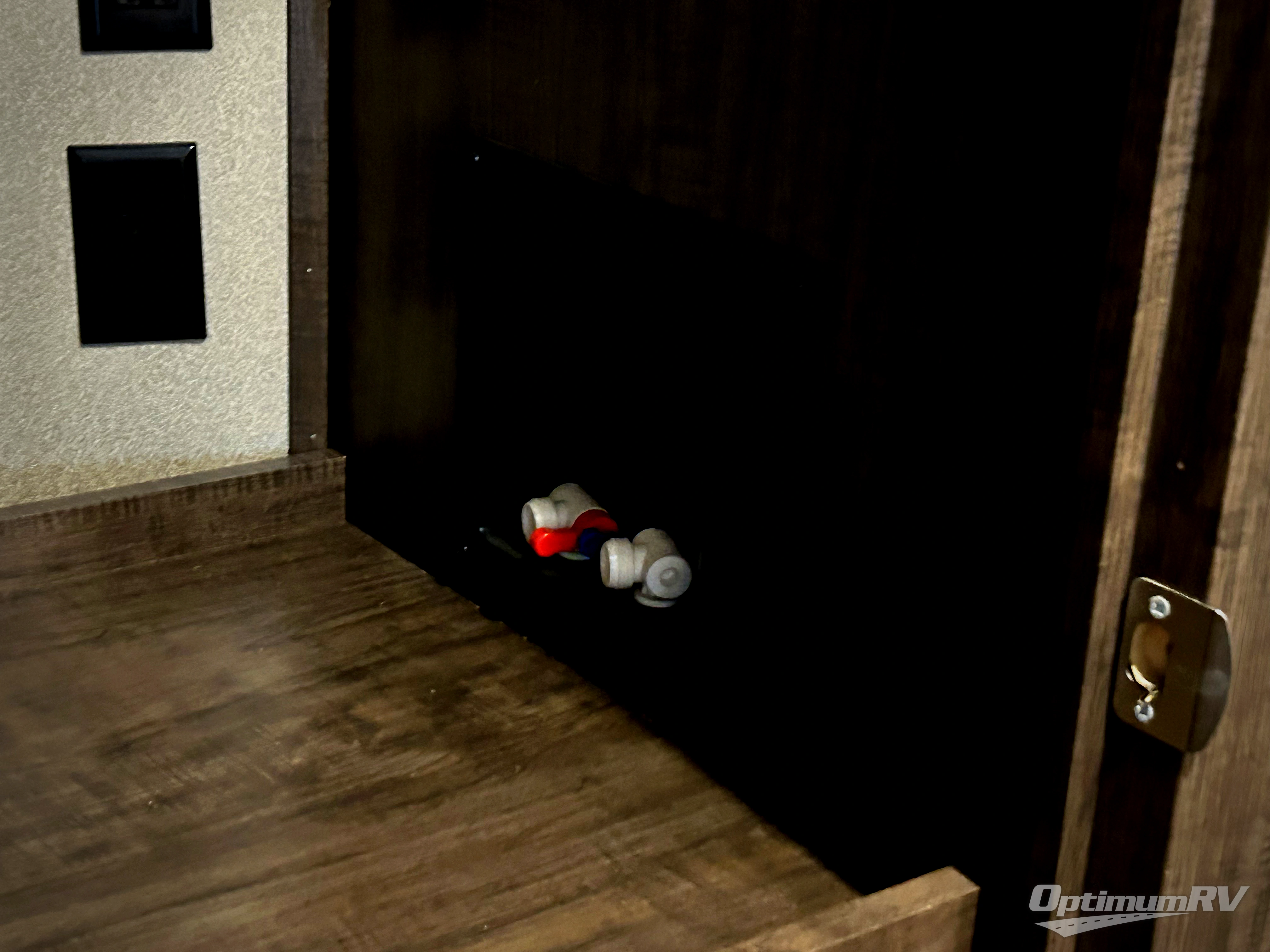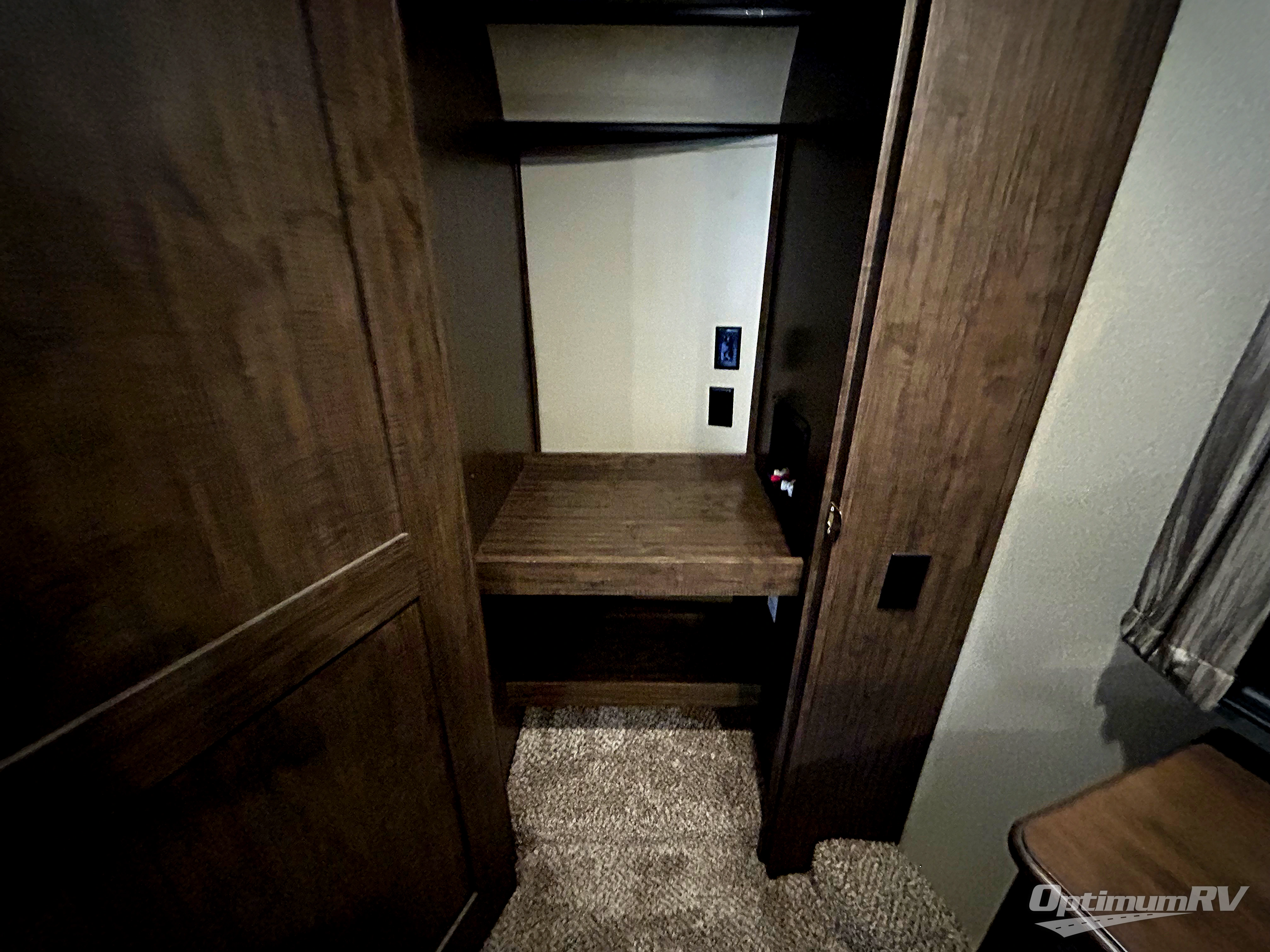 Just outside the bathroom there is a door to the front private bedroom. Here you will enjoy plenty of room thanks to a slide out queen bed including a pull-out ottoman. There is a full front wardrobe for your hanging clothes, shirt storage, a dresser, and a closet that has been prepped for a washer and dryer. No pile of dirty laundry to take home here when you choose this option.