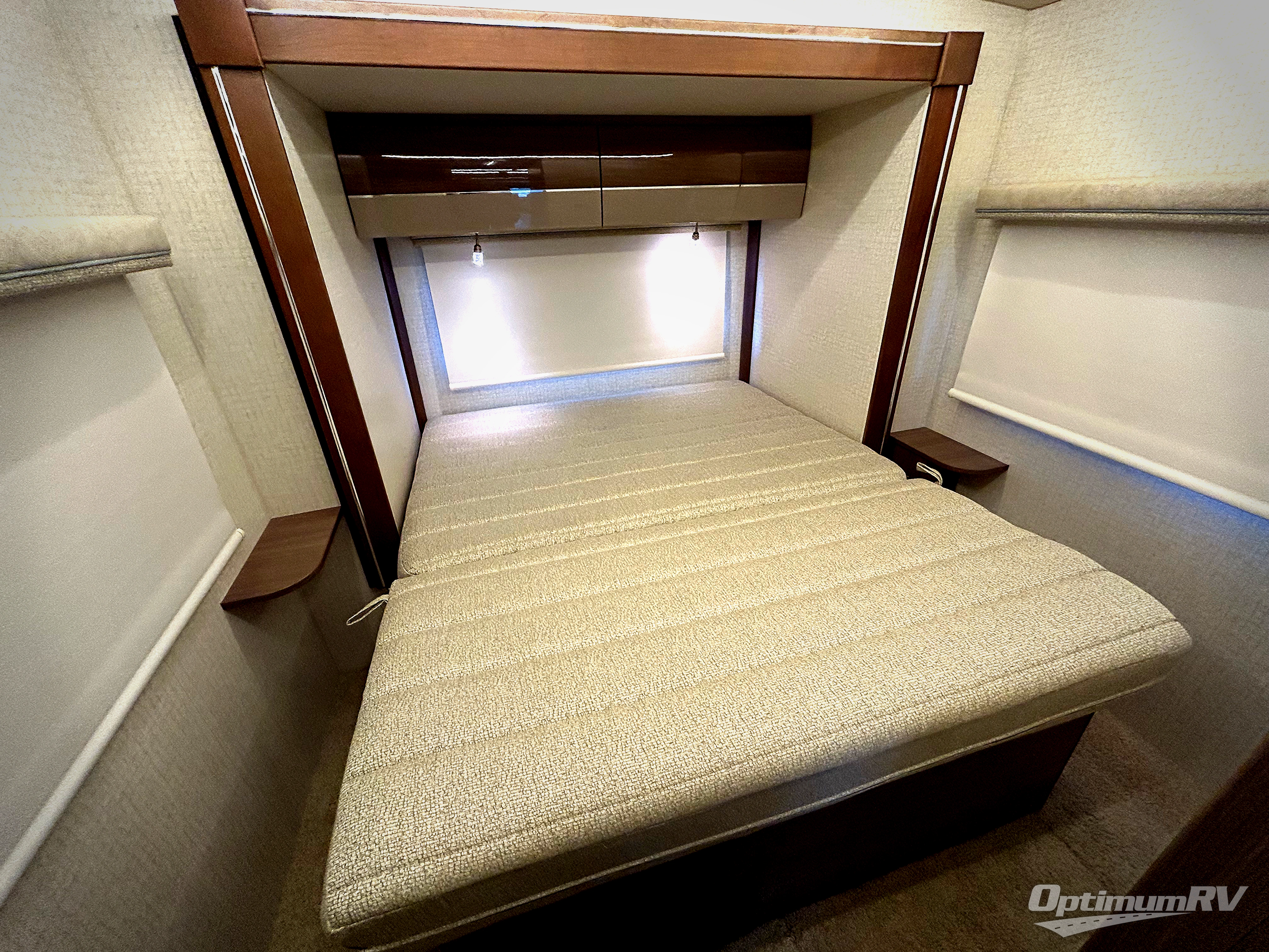 The rear bedroom in model 24G features a slide out rear queen sized bed with overhead storage cabinets for your things. There is also a spot to mount an optional flat screen 24" HDTV in the bedroom just off the foot of the bed along the wall.