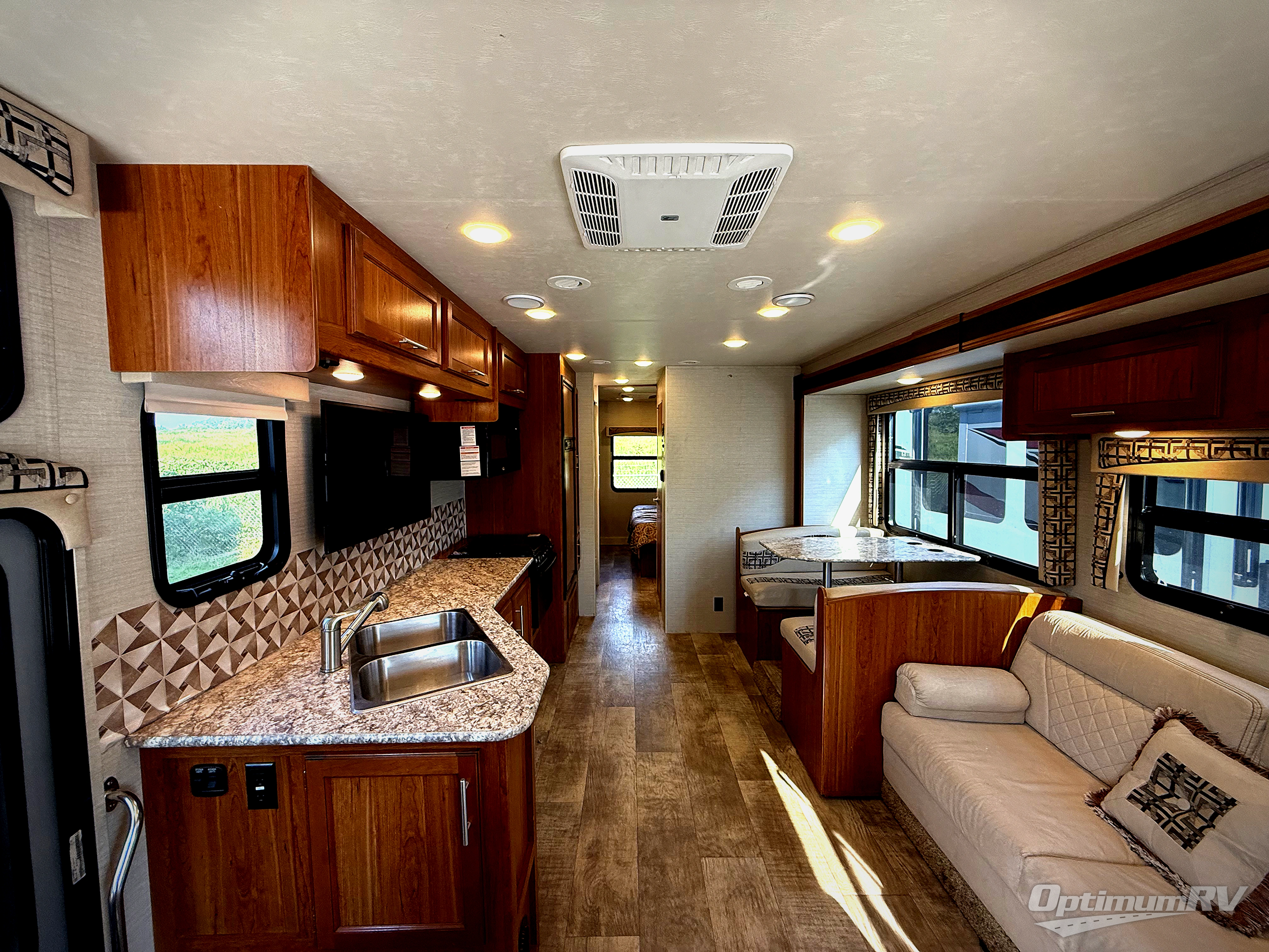Enter model 31V just behind the front passenger seat and take a look back. The road side slide when extended provides a wide open interior to enjoy. There is a booth dinette and sofa within this slide out opposite a 39" lift TV that is featured to the left of the entry door.
