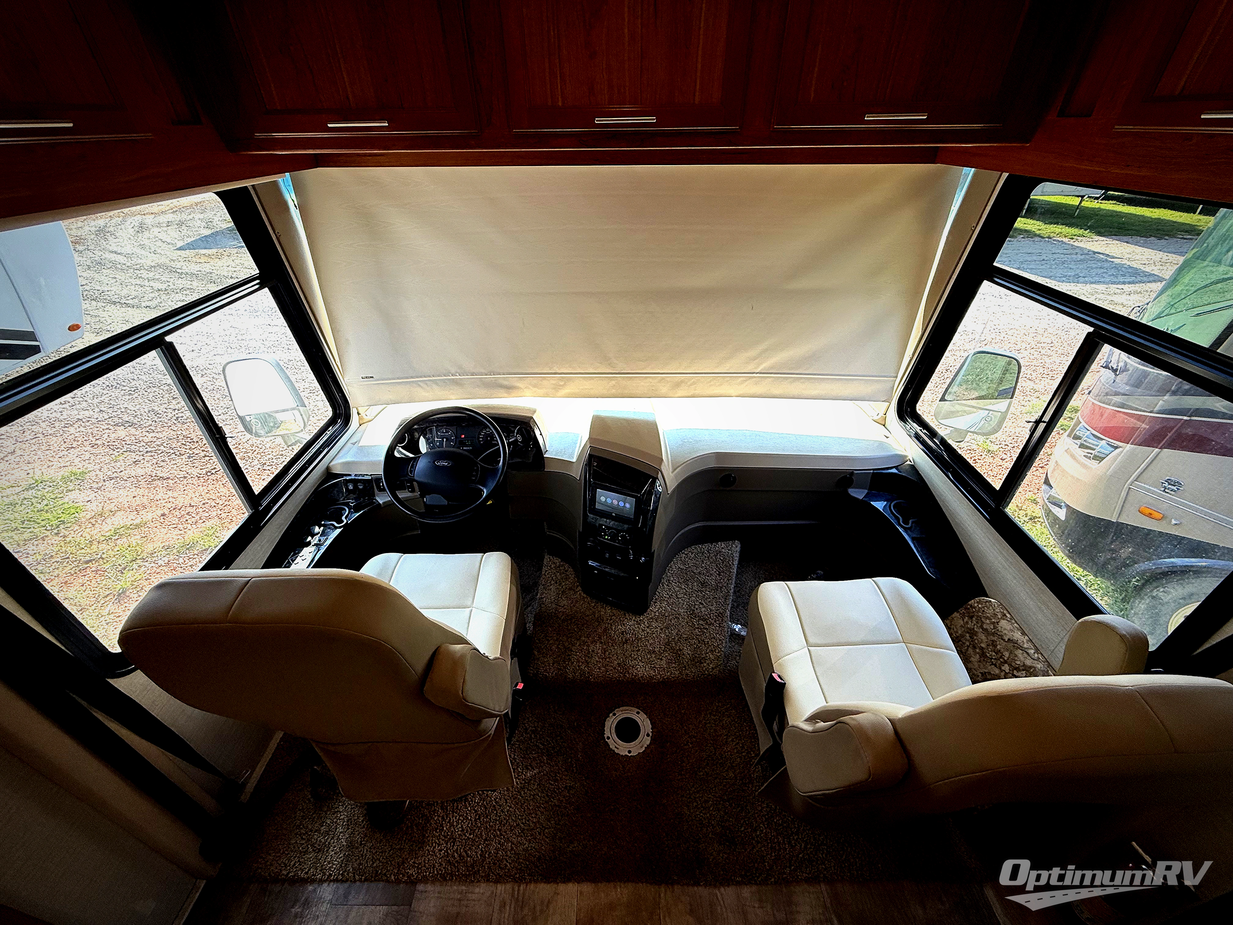 The very rear of this Alante motorhome features a semi-private bedroom including a slide out queen size bed with dual nightstands and overhead storage. More storage is available opposite the bed with a clothing wardrobe, plus you can add a TV if you wish. A curtain is available at the doorway to provide a bit more privacy at night.