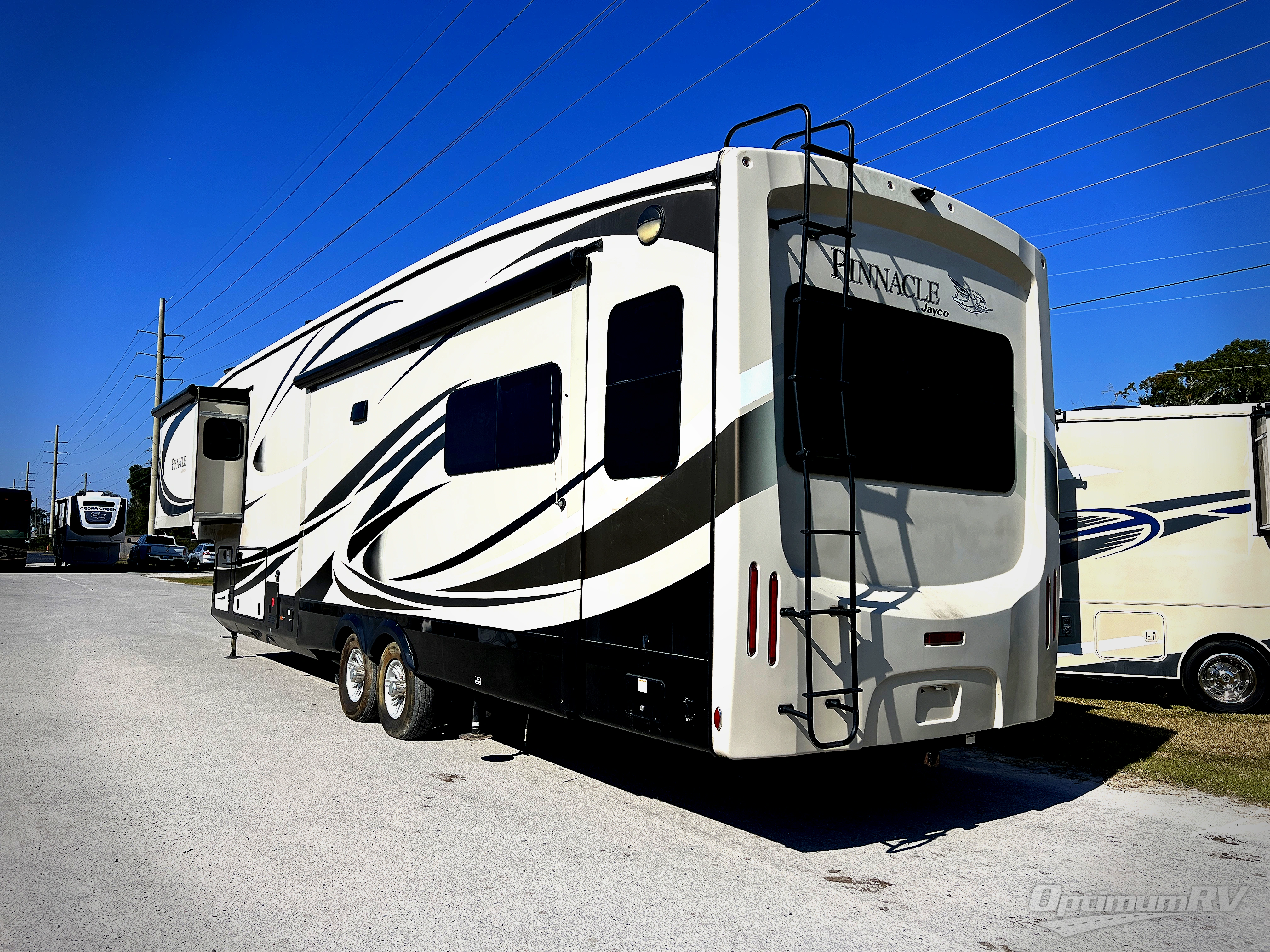 This Jayco Pinnacle 36FBTS fifth wheel features triple slide outs and a front bathroom with a full wall walk-in closet, bath and a half, plus much more!
