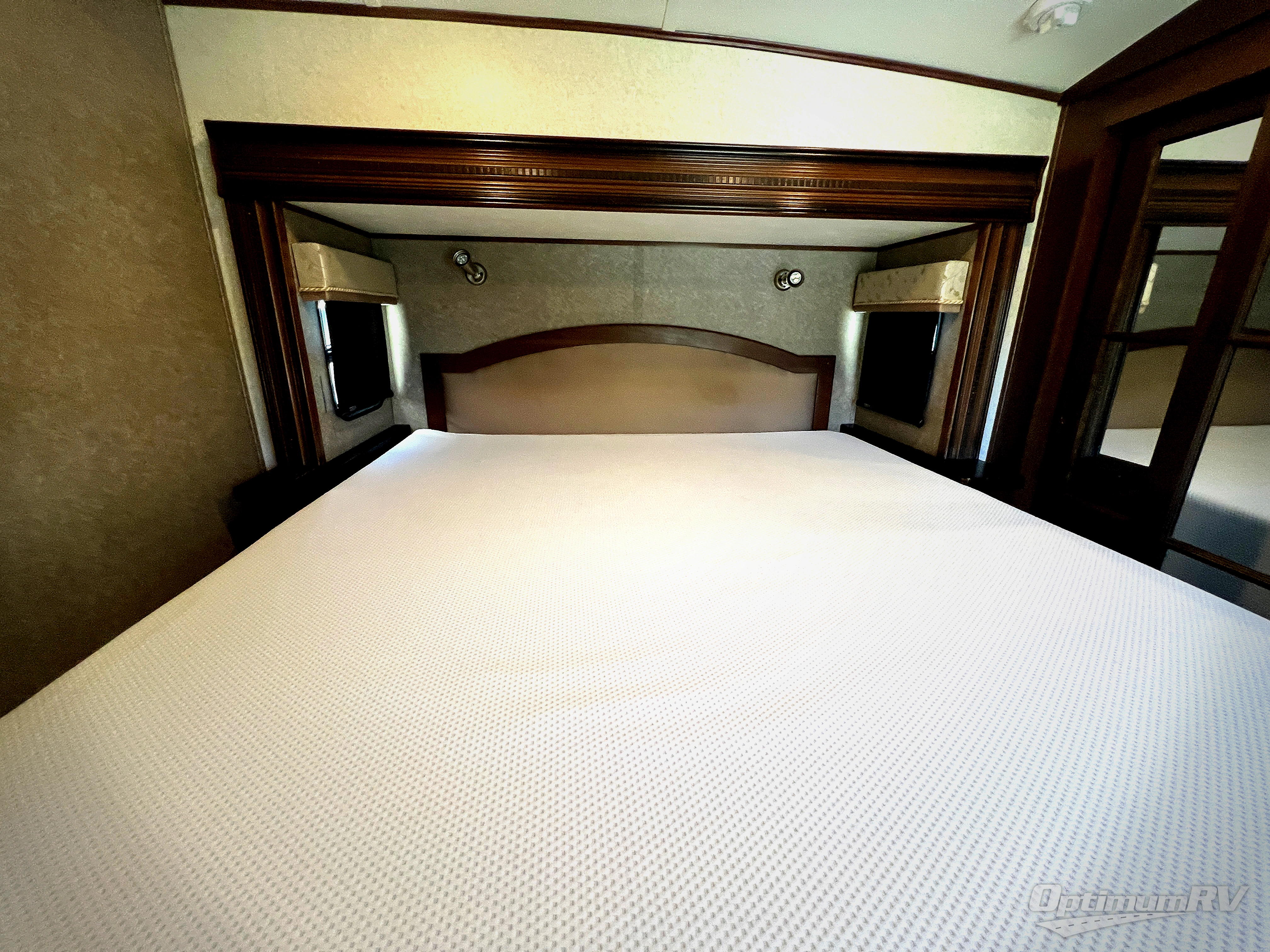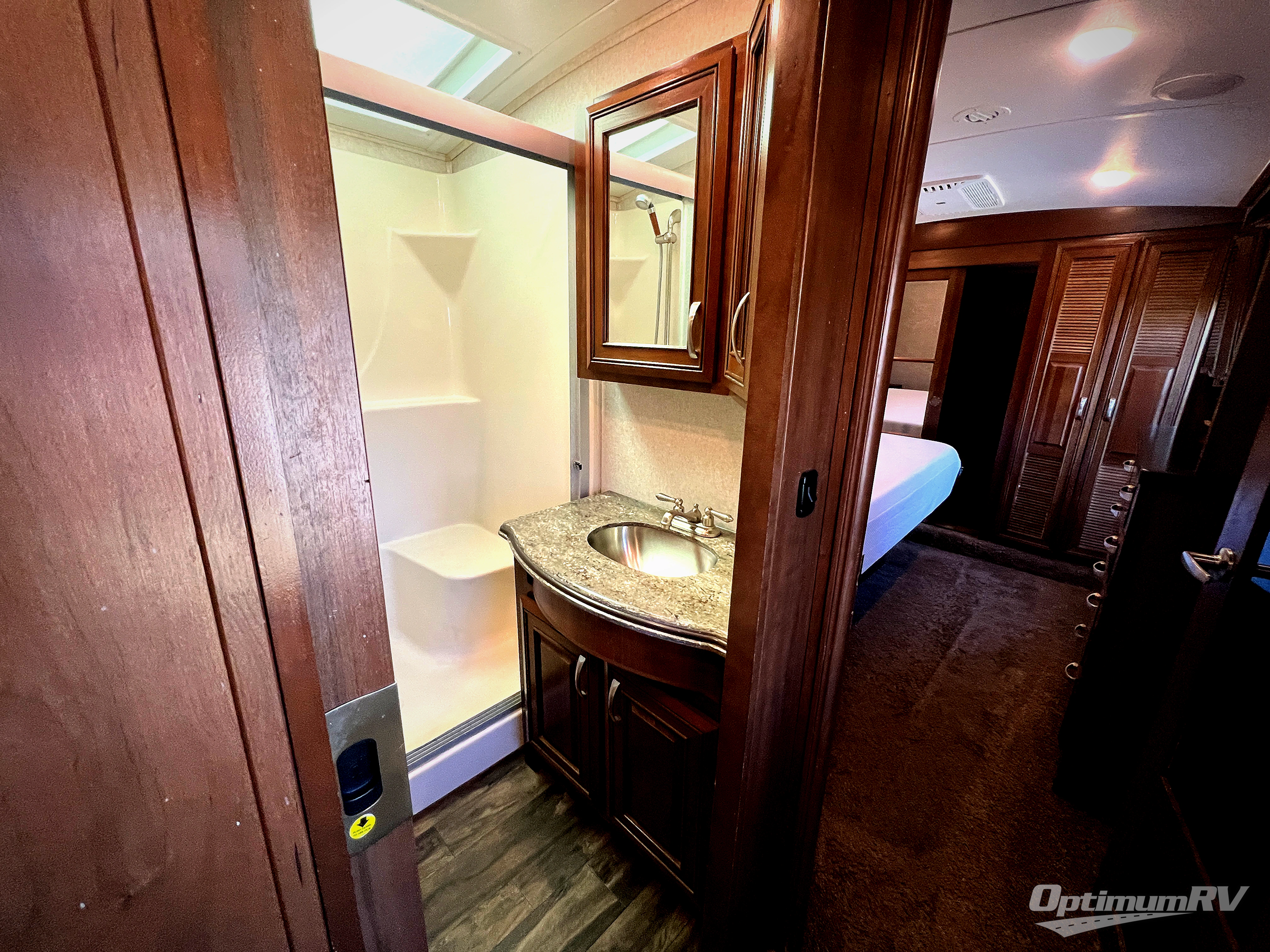 As you enter the fifth wheel, to the left there is a slide out with a free-standing table and chairs which can comfortably seat four people, and a theater sofa or you can choose two recliners in place of the theater sofa. Along the rear wall there is a tri-fold hide-a-bed sofa with an ottoman or choose the optional reclining sofa. The slide out along the road side features an entertainment center with a TV lift and fireplace below, three burner range, microwave, and residential refrigerator or choose an optional 18 cu. ft. refrigerator. Adjacent to the slide you will find a pantry for your canned goods. The kitchen island has a double kitchen sink and extra counter space.