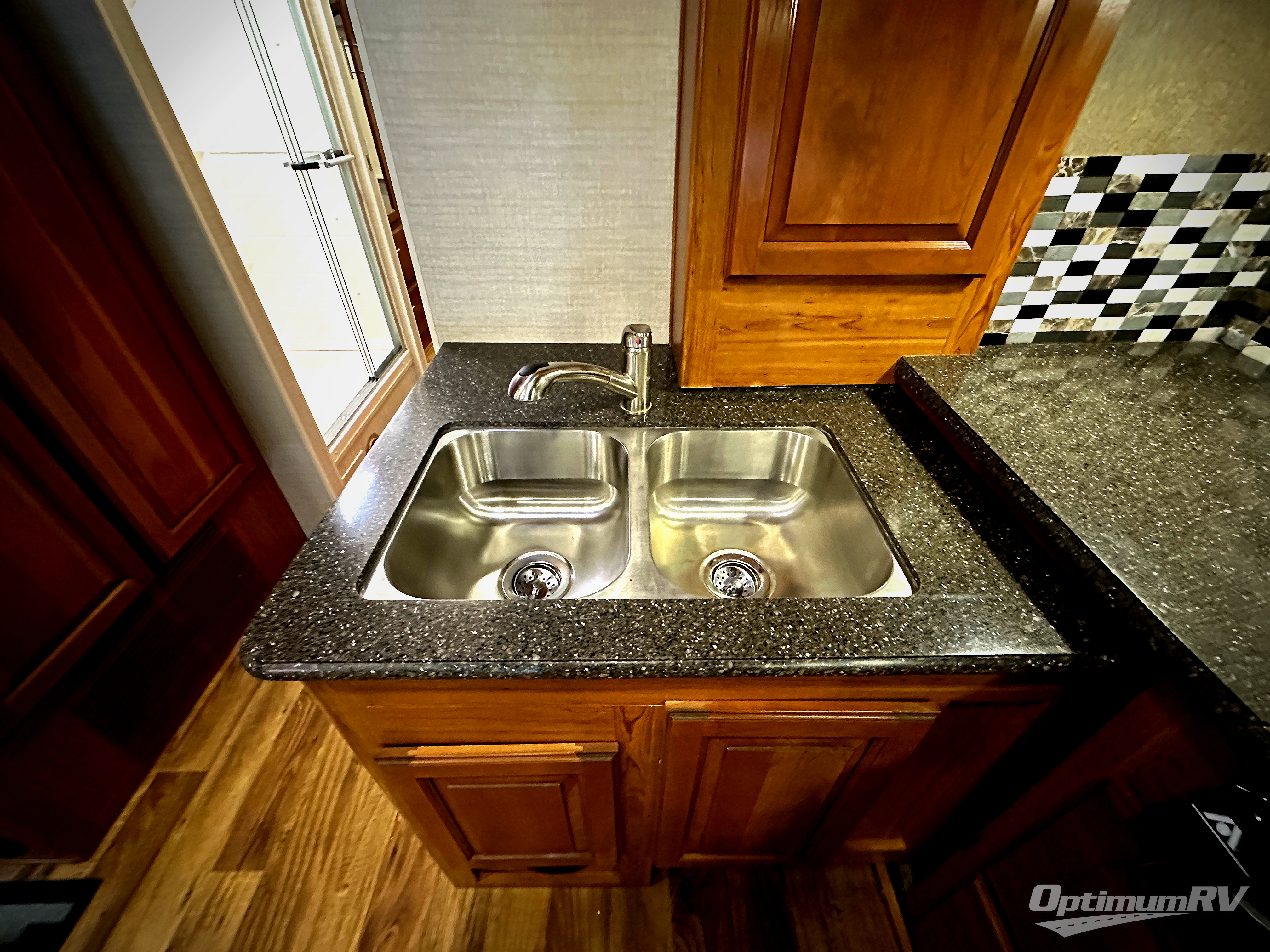 As you step inside to your left you will find an 8 cu. ft. refrigerator and pantry. On the right side of the entrance there is a dinette slide with a 50" TV lift. Opposite the door side you will find a slide out with a tri-fold sofa, a three burner range with overhead microwave oven, counter space, and a double kitchen sink along the interior wall. There are also ample overhead cabinets above the entire slide and above the sink as well.