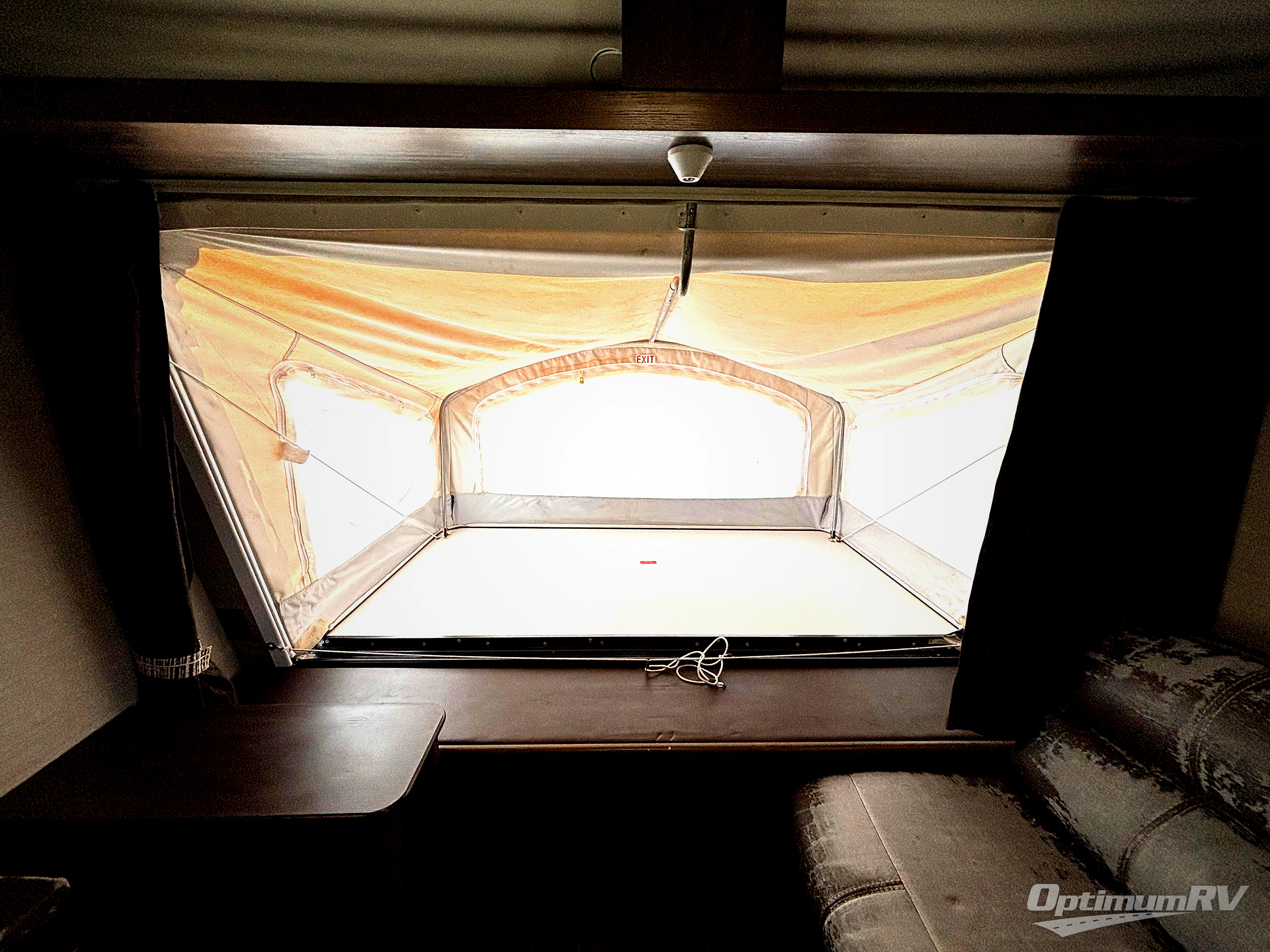 Step inside 2190EX to your right to see a fold-down sofa. Next, the first queen tent end bed is along the front of the expandable. There is storage overhead as well as underneath the bed, plus a corner end table to place your things. A slide out u-shaped dinette for meals or playing games is opposite the sofa. The sofa and dinette also provide additional sleeping space at night if needed for family and friends.
