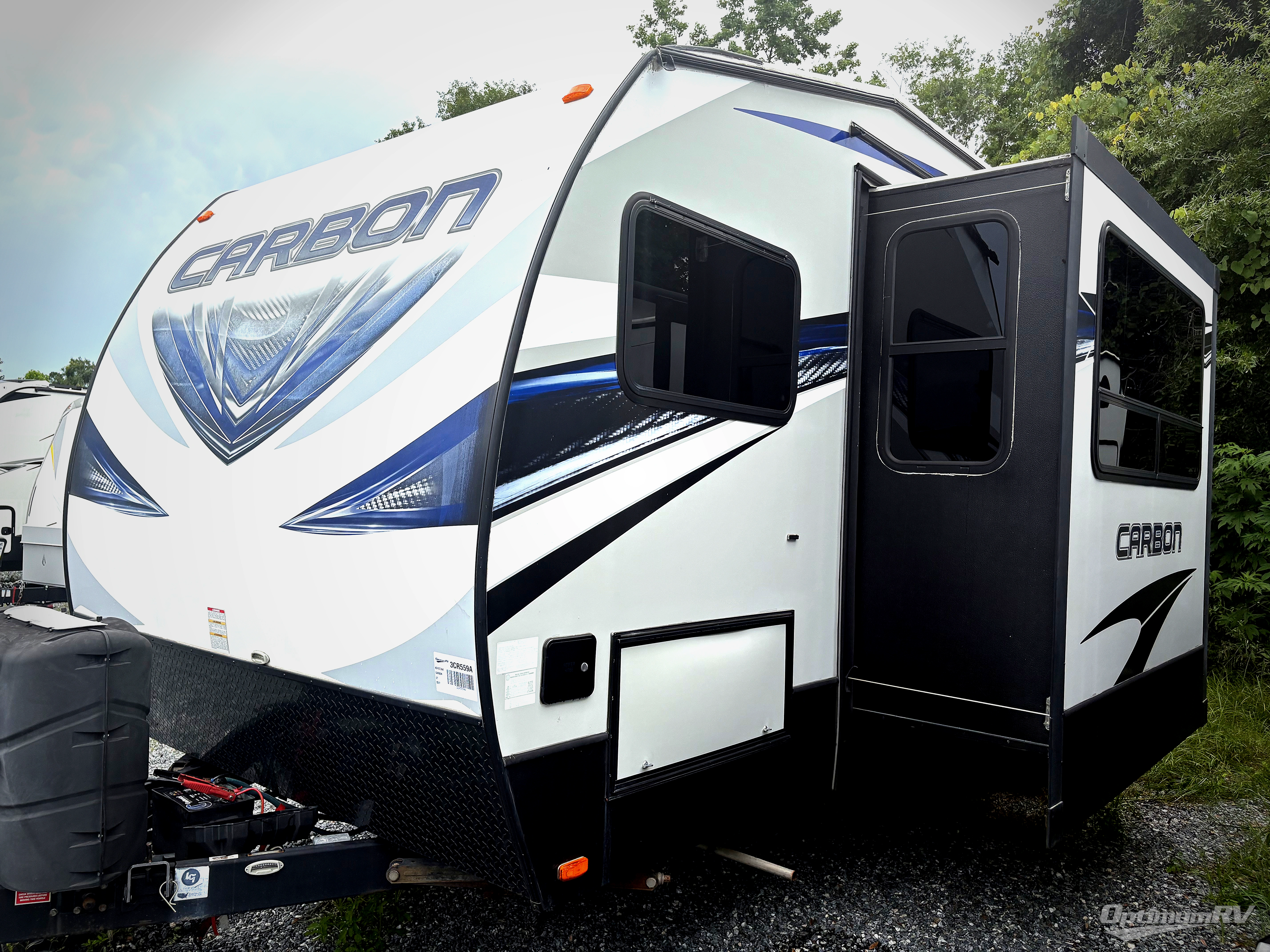 Step inside this Carbon 27 luxury toy hauler travel trailer by Keystone RV. It features a 9' garage area, dual entry doors, and a single slide out which provides more interior living space.