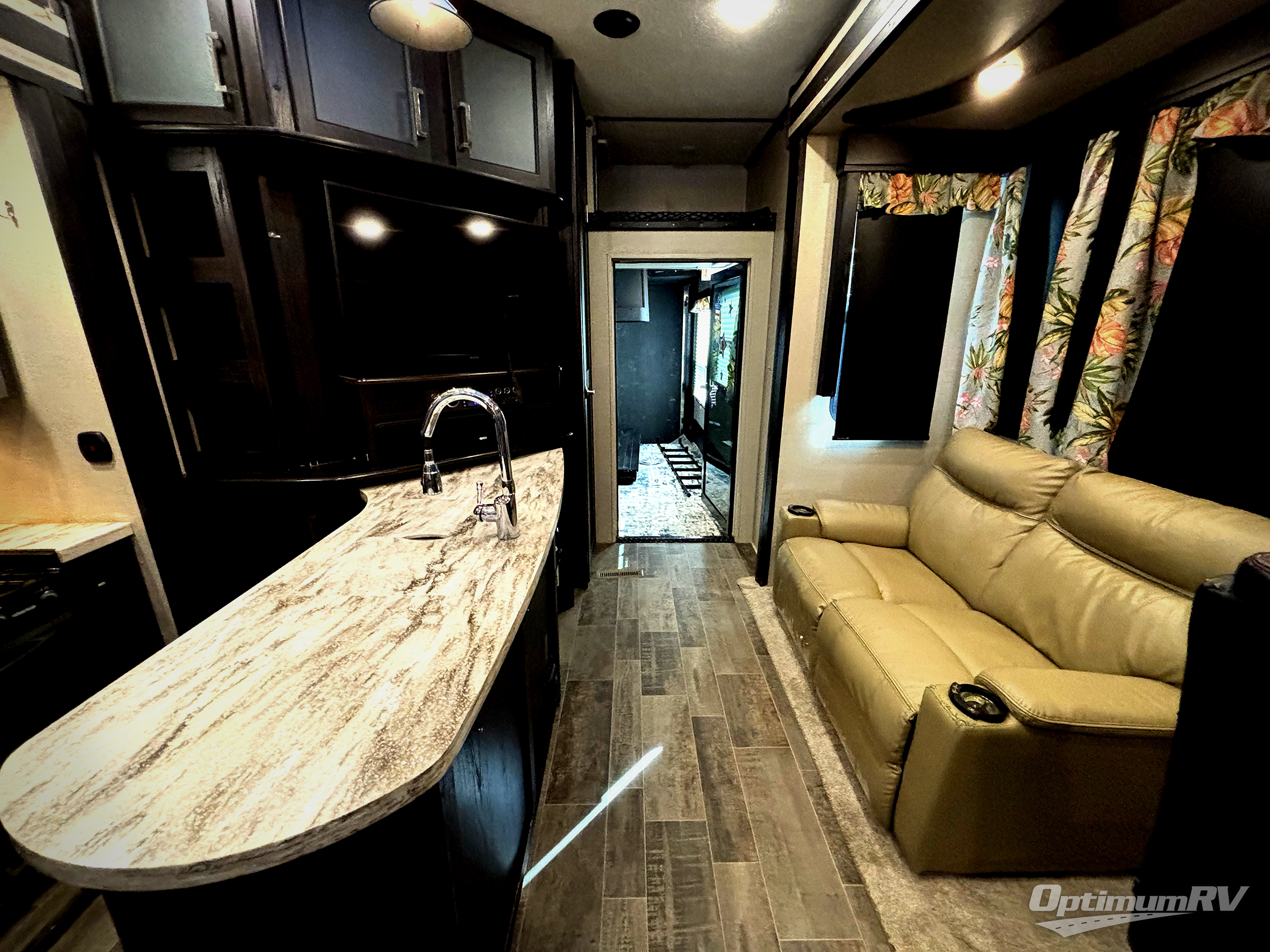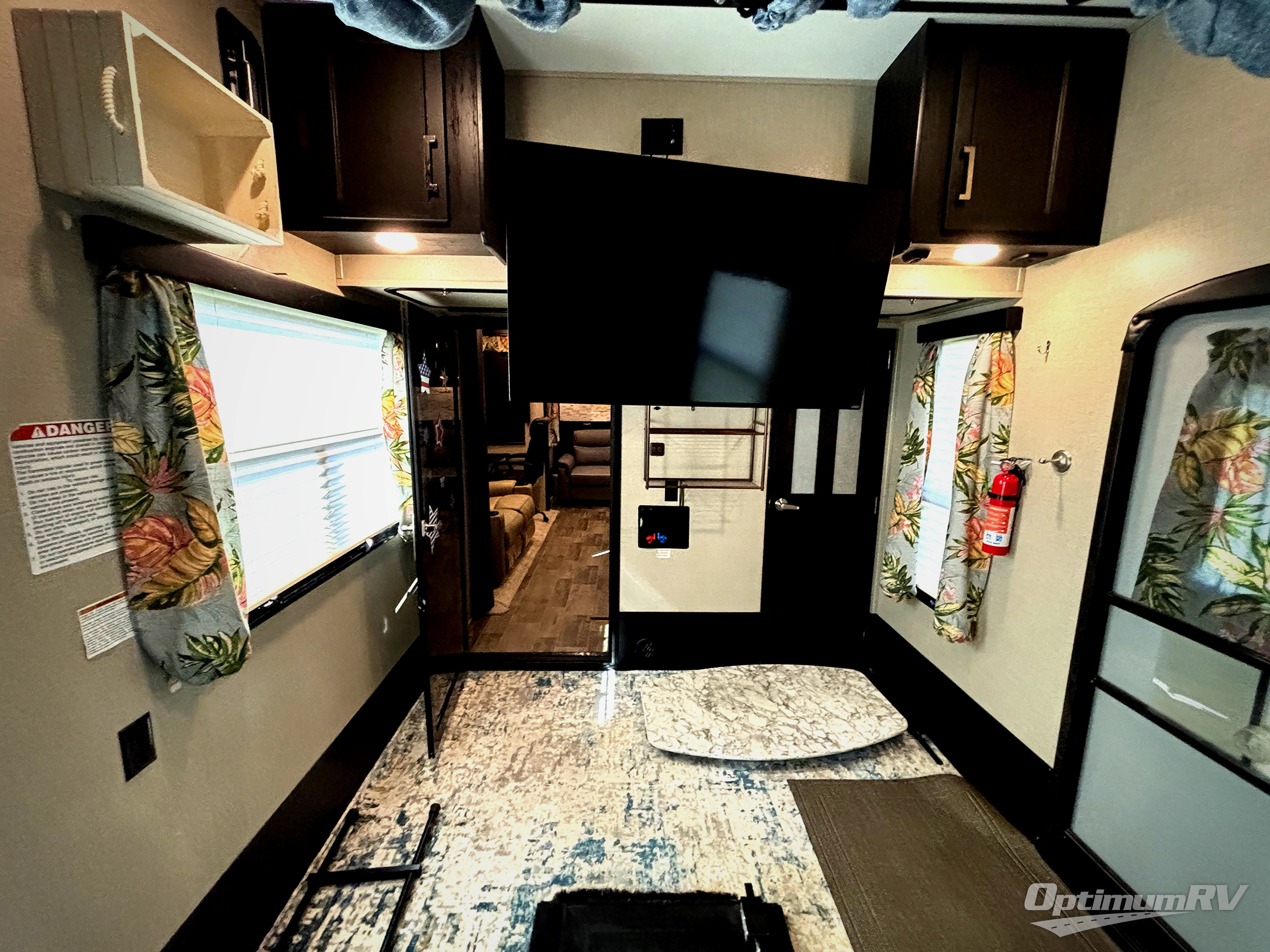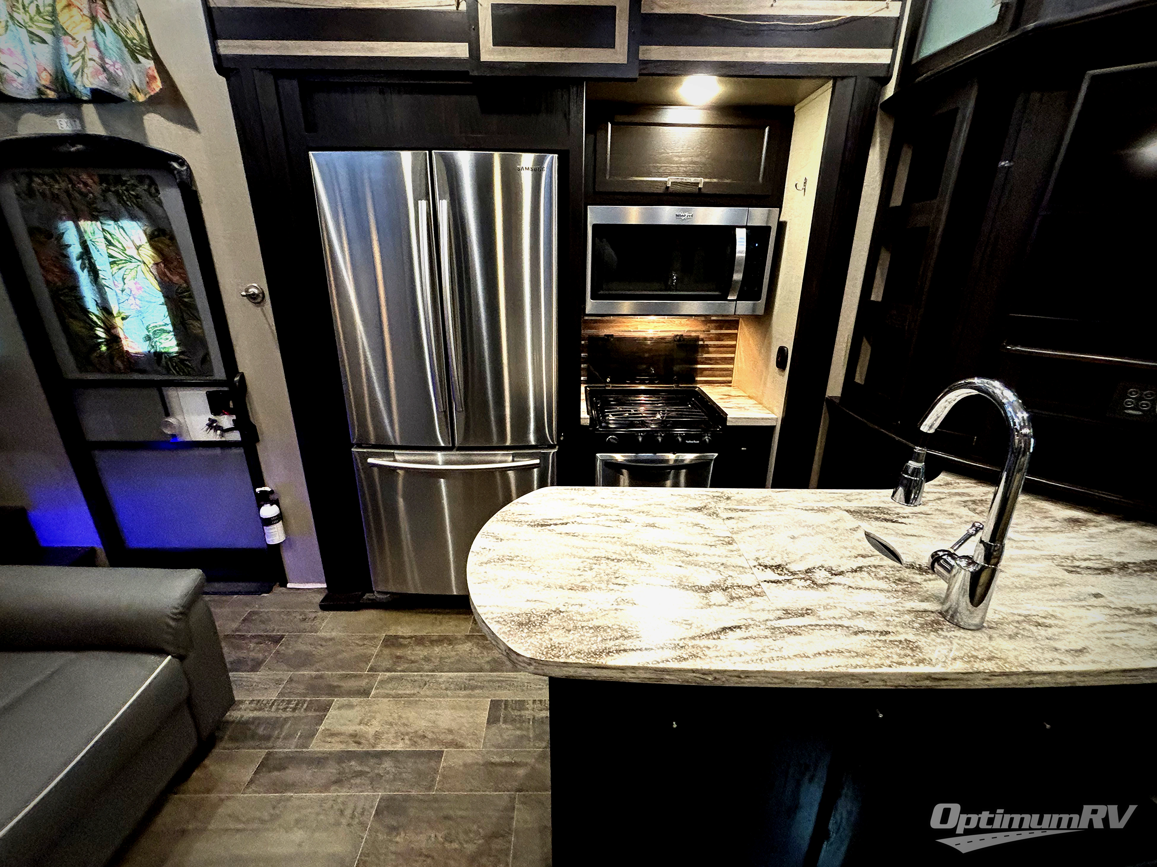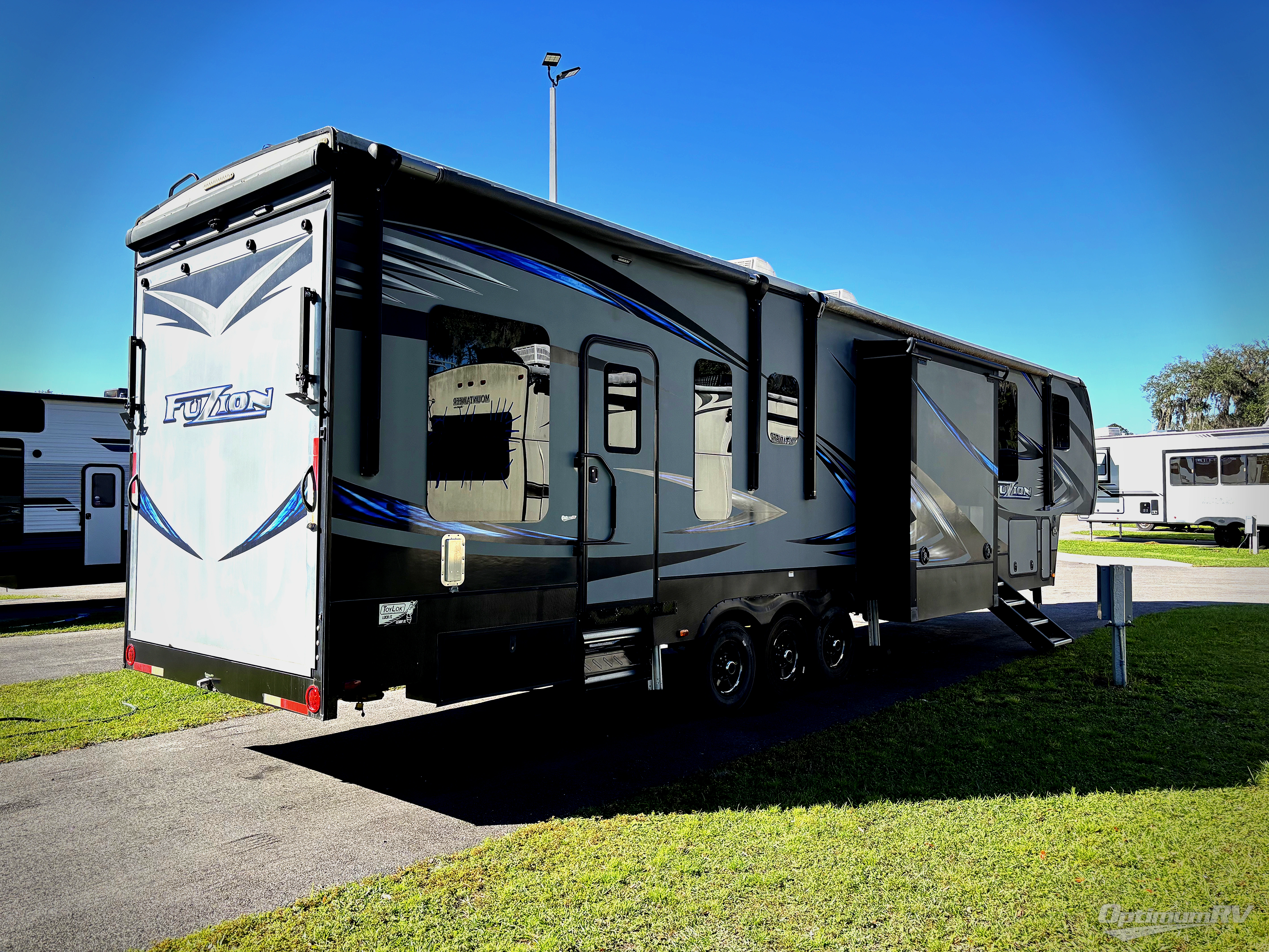 With this Fuzion toy hauler fifth wheel in tow you can be assured of a great time when you arrive at your destination. This model 423 features triple slides, one and a half baths, a loft, and a 12'6" garage for your favorite ride on toys!