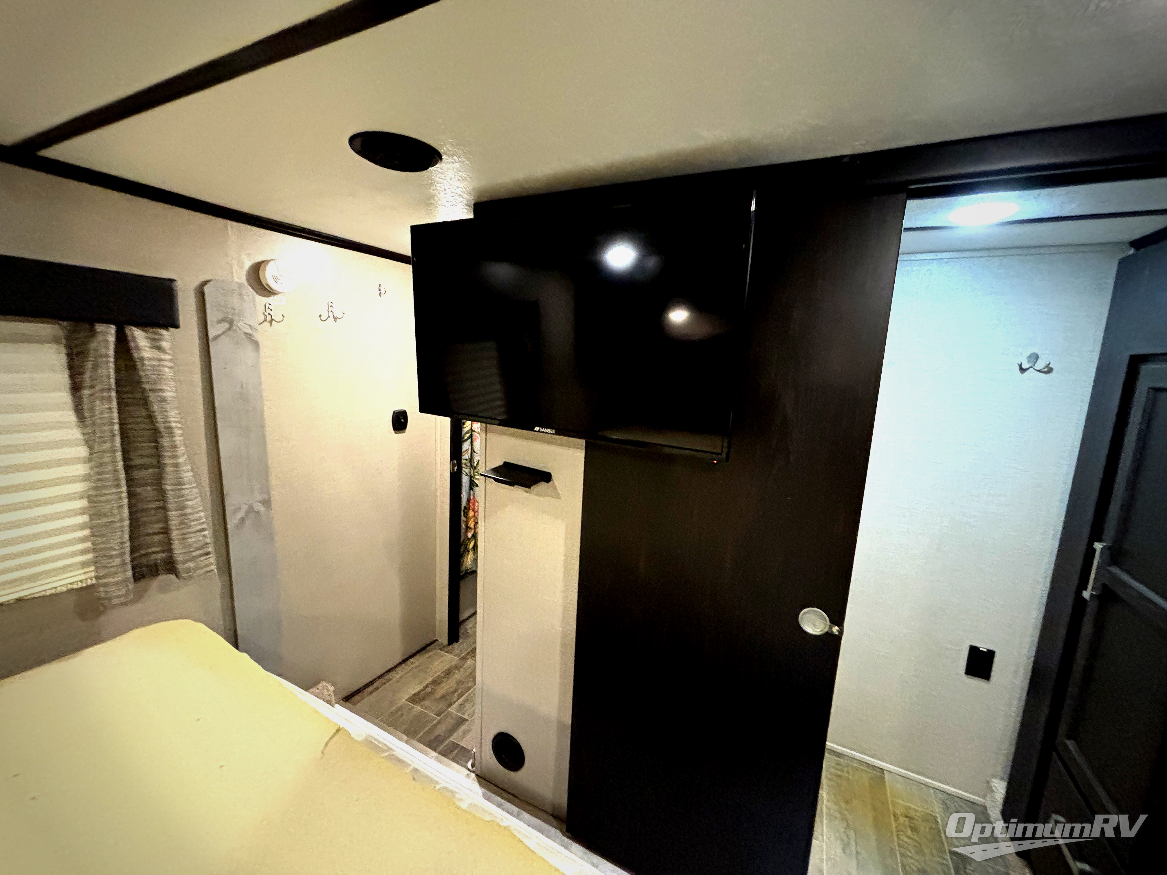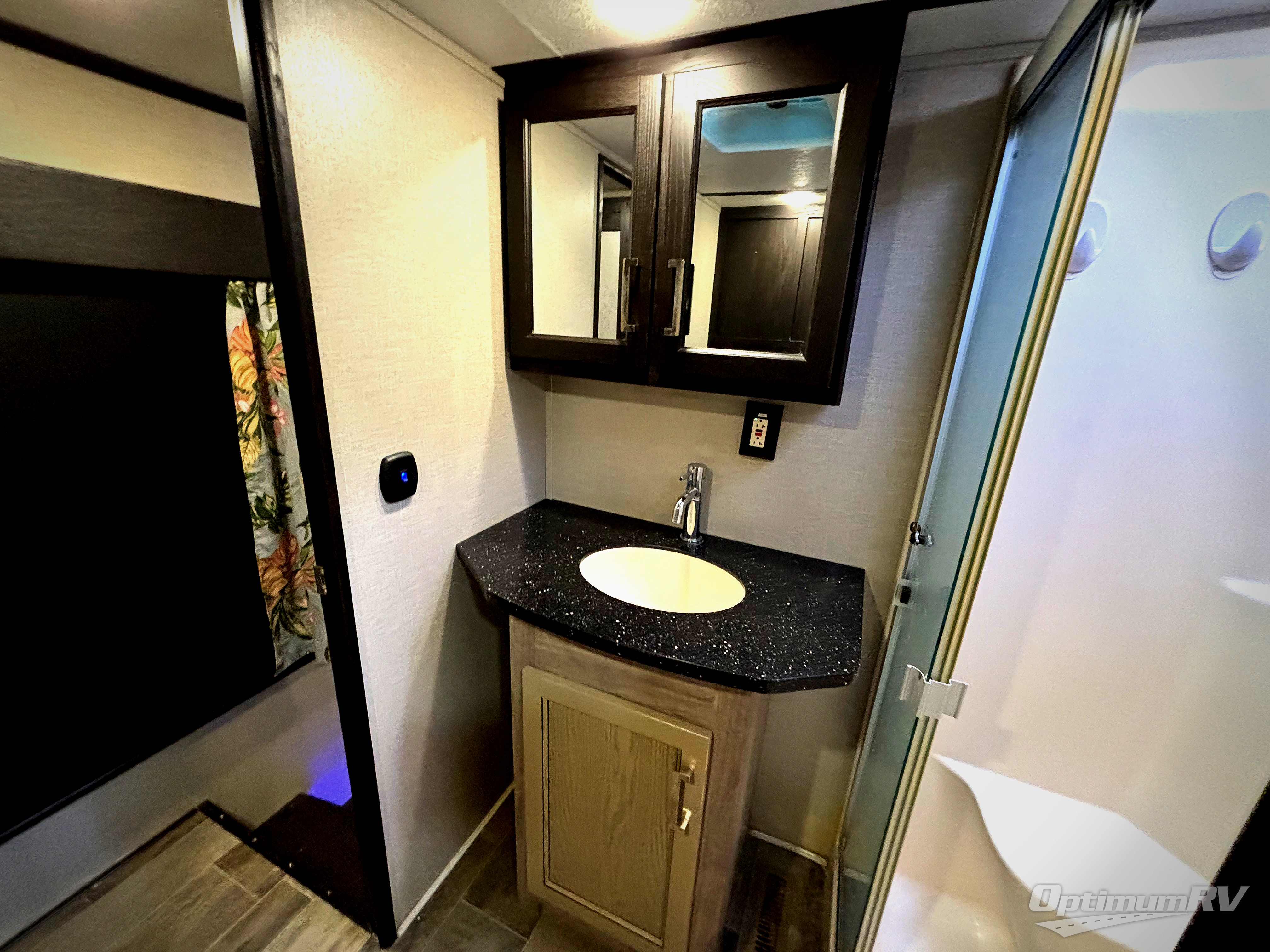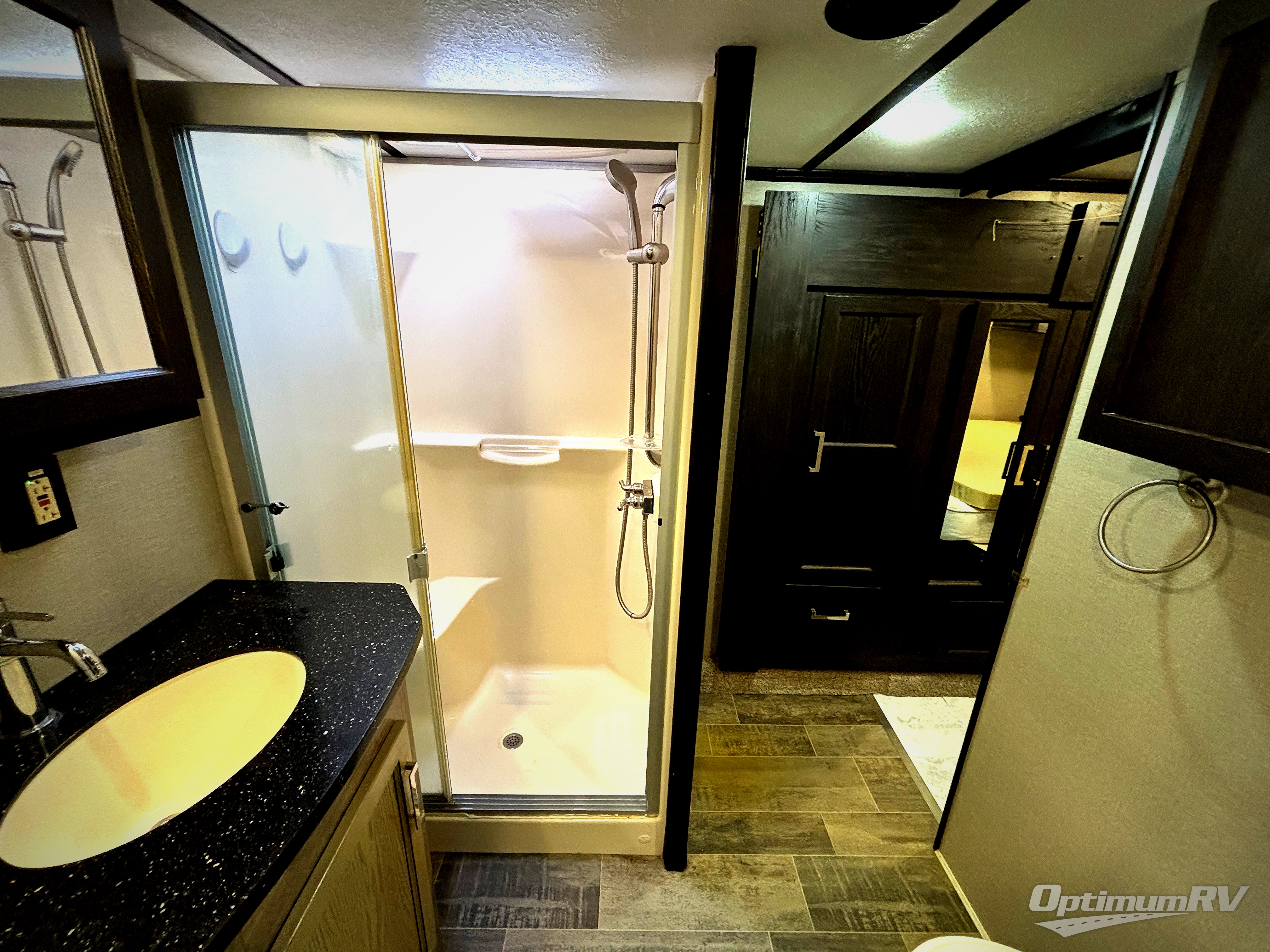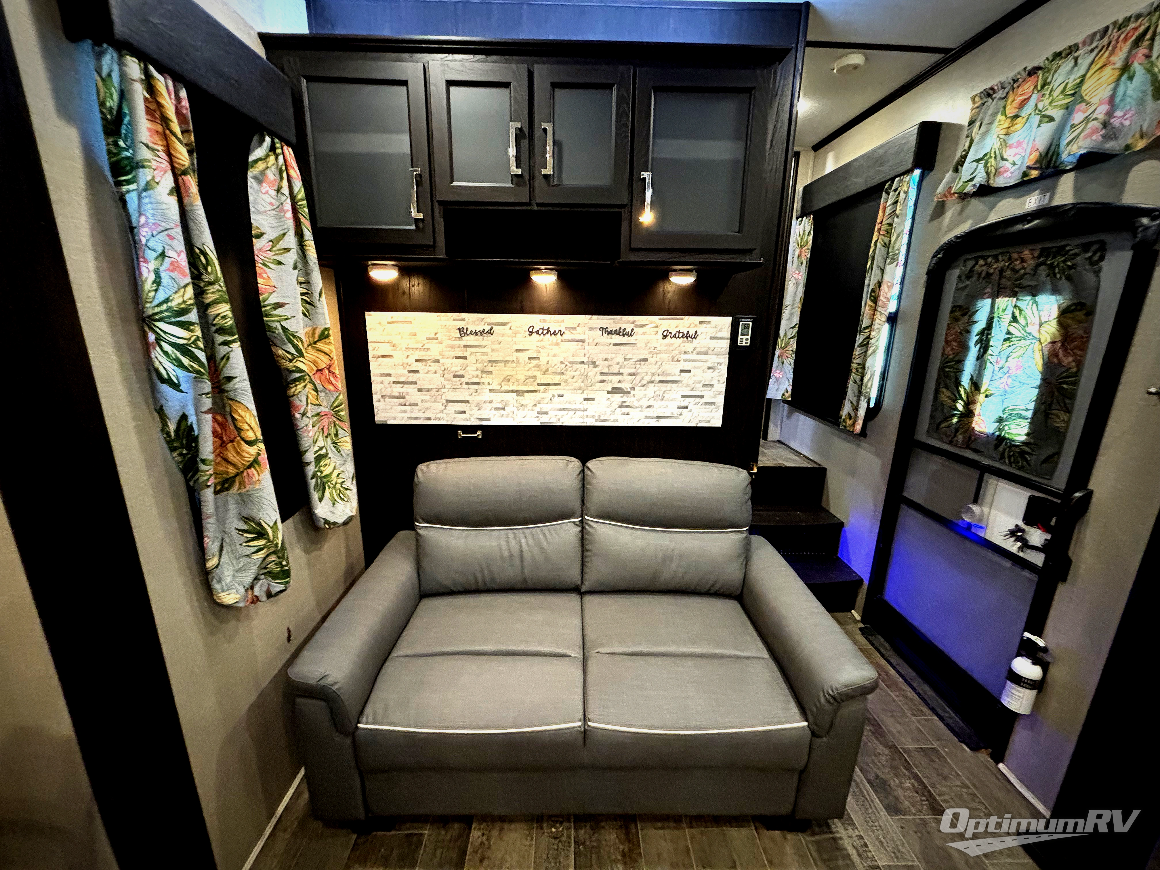 You will love the 8' rear ramp garage door for ease of loading your off-road toys. You will find in this garage area plenty of overhead cabinets for your gear, and a drop down top queen bed with dual opposing sofas in the rear cargo space for added sleeping and seating once things are unloaded at camp. There is also a loft in front, a space prepped for a washer and dryer if you choose to add, and a 40" LED TV. A convenient half bath is an added bonus so you can keep all the dirt and grime out of the main living quarters.